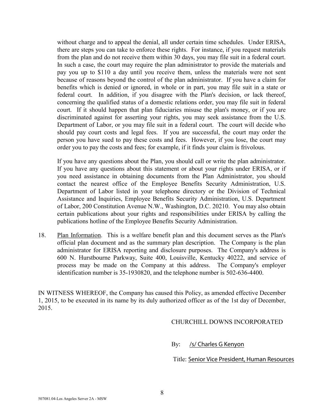 8 507081.04-Los Angeles Server 2A - MSW without charge and to appeal the denial, all under certain time schedules. Under ERISA, there are steps you can take to enforce these rights. For instance, if you request materials from the plan and do not receive them within 30 days, you may file suit in a federal court. In such a case, the court may require the plan administrator to provide the materials and pay you up to $110 a day until you receive them, unless the materials were not sent because of reasons beyond the control of the plan administrator. If you have a claim for benefits which is denied or ignored, in whole or in part, you may file suit in a state or federal court. In addition, if you disagree with the Plan's decision, or lack thereof, concerning the qualified status of a domestic relations order, you may file suit in federal court. If it should happen that plan fiduciaries misuse the plan's money, or if you are discriminated against for asserting your rights, you may seek assistance from the U.S. Department of Labor, or you may file suit in a federal court. The court will decide who should pay court costs and legal fees. If you are successful, the court may order the person you have sued to pay these costs and fees. However, if you lose, the court may order you to pay the costs and fees; for example, if it finds your claim is frivolous. If you have any questions about the Plan, you should call or write the plan administrator. If you have any questions about this statement or about your rights under ERISA, or if you need assistance in obtaining documents from the Plan Administrator, you should contact the nearest office of the Employee Benefits Security Administration, U.S. Department of Labor listed in your telephone directory or the Division of Technical Assistance and Inquiries, Employee Benefits Security Administration, U.S. Department of Labor, 200 Constitution Avenue N.W., Washington, D.C. 20210. You may also obtain certain publications about your rights and responsibilities under ERISA by calling the publications hotline of the Employee Benefits Security Administration. 18. Plan Information. This is a welfare benefit plan and this document serves as the Plan's official plan document and as the summary plan description. The Company is the plan administrator for ERISA reporting and disclosure purposes. The Company's address is 600 N. Hurstbourne Parkway, Suite 400, Louisville, Kentucky 40222, and service of process may be made on the Company at this address. The Company's employer identification number is 35-1930820, and the telephone number is 502-636-4400. IN WITNESS WHEREOF, the Company has caused this Policy, as amended effective December 1, 2015, to be executed in its name by its duly authorized officer as of the 1st day of December, 2015. CHURCHILL DOWNS INCORPORATED By: /s/ Charles G Kenyon Title: Senior Vice President, Human Resources