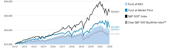 Past performance is no guarantee of future results. Returns are historical and are calculated net of management fees and other expenses by determining the percentage change in net asset value (NAV) or market price (as applicable) with all distributions reinvested in accordance with the Fund’s Dividend Reinvestment Plan. Furthermore, returns do not reflect the deduction of taxes that shareholders may have to pay on Fund distributions or upon the sale of Fund shares. Performance at market price will differ from performance at NAV due to variations in the Fund’s market price versus NAV, which may reflect factors such as fluctuations in supply and demand for Fund shares, changes in Fund distributions, shifting market expectations for the Fund’s future returns and distribution rates, and other considerations affecting the trading prices of closed-end funds. Investment return and principal value will fluctuate so that shares, when sold, may be worth more or less than their original cost. Performance for periods less than or equal to one year is cumulative. Performance is for the stated time period only; due to market volatility, current Fund performance may be lower or higher than the quoted return. For performance as of the most recent month-end, please refer to eatonvance.com.