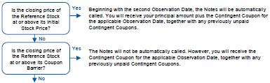 If the closing price of the Reference Stock on any Observation Date (beginning with the second Observation Date) is at or above its Initial Stock Price, the Notes will be automatically called at the principal amount plus the Contingent Coupon (together with any previously unpaid Contingent Coupons) on the applicable Call Settlement Date.