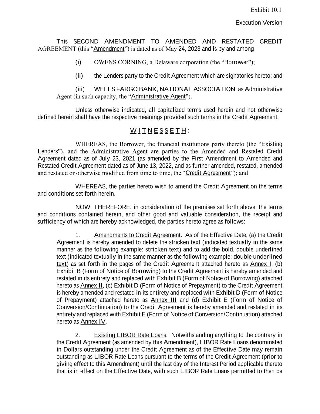 Execution Version This SECOND AMENDMENT TO AMENDED AND RESTATED CREDIT AGREEMENT (this “Amendment”) is dated as of May 24, 2023 and is by and among (i) OWENS CORNING, a Delaware corporation (the “Borrower”); (ii) the Lenders party to the Credit Agreement which are signatories hereto; and (iii) WELLS FARGO BANK, NATIONAL ASSOCIATION, as Administrative Agent (in such capacity, the “Administrative Agent”). Unless otherwise indicated, all capitalized terms used herein and not otherwise defined herein shall have the respective meanings provided such terms in the Credit Agreement. W I T N E S S E T H : WHEREAS, the Borrower, the financial institutions party thereto (the “Existing Lenders”), and the Administrative Agent are parties to the Amended and Restated Credit Agreement dated as of July 23, 2021 (as amended by the First Amendment to Amended and Restated Credit Agreement dated as of June 13, 2022, and as further amended, restated, amended and restated or otherwise modified from time to time, the “Credit Agreement”); and WHEREAS, the parties hereto wish to amend the Credit Agreement on the terms and conditions set forth herein. NOW, THEREFORE, in consideration of the premises set forth above, the terms and conditions contained herein, and other good and valuable consideration, the receipt and sufficiency of which are hereby acknowledged, the parties hereto agree as follows: 1. Amendments to Credit Agreement. As of the Effective Date, (a) the Credit Agreement is hereby amended to delete the stricken text (indicated textually in the same manner as the following example: stricken text) and to add the bold, double underlined text (indicated textually in the same manner as the following example: double underlined text) as set forth in the pages of the Credit Agreement attached hereto as Annex I, (b) Exhibit B (Form of Notice of Borrowing) to the Credit Agreement is hereby amended and restated in its entirety and replaced with Exhibit B (Form of Notice of Borrowing) attached hereto as Annex II, (c) Exhibit D (Form of Notice of Prepayment) to the Credit Agreement is hereby amended and restated in its entirety and replaced with Exhibit D (Form of Notice of Prepayment) attached hereto as Annex III and (d) Exhibit E (Form of Notice of Conversion/Continuation) to the Credit Agreement is hereby amended and restated in its entirety and replaced with Exhibit E (Form of Notice of Conversion/Continuation) attached hereto as Annex IV. 2. Existing LIBOR Rate Loans. Notwithstanding anything to the contrary in the Credit Agreement (as amended by this Amendment), LIBOR Rate Loans denominated in Dollars outstanding under the Credit Agreement as of the Effective Date may remain outstanding as LIBOR Rate Loans pursuant to the terms of the Credit Agreement (prior to giving effect to this Amendment) until the last day of the Interest Period applicable thereto that is in effect on the Effective Date, with such LIBOR Rate Loans permitted to then be Exhibit 10.1