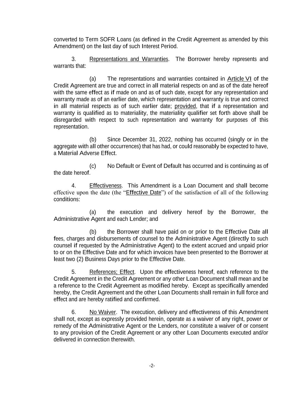 -2- converted to Term SOFR Loans (as defined in the Credit Agreement as amended by this Amendment) on the last day of such Interest Period. 3. Representations and Warranties. The Borrower hereby represents and warrants that: (a) The representations and warranties contained in Article VI of the Credit Agreement are true and correct in all material respects on and as of the date hereof with the same effect as if made on and as of such date, except for any representation and warranty made as of an earlier date, which representation and warranty is true and correct in all material respects as of such earlier date; provided, that if a representation and warranty is qualified as to materiality, the materiality qualifier set forth above shall be disregarded with respect to such representation and warranty for purposes of this representation. (b) Since December 31, 2022, nothing has occurred (singly or in the aggregate with all other occurrences) that has had, or could reasonably be expected to have, a Material Adverse Effect. (c) No Default or Event of Default has occurred and is continuing as of the date hereof. 4. Effectiveness. This Amendment is a Loan Document and shall become effective upon the date (the “Effective Date”) of the satisfaction of all of the following conditions: (a) the execution and delivery hereof by the Borrower, the Administrative Agent and each Lender; and (b) the Borrower shall have paid on or prior to the Effective Date all fees, charges and disbursements of counsel to the Administrative Agent (directly to such counsel if requested by the Administrative Agent) to the extent accrued and unpaid prior to or on the Effective Date and for which invoices have been presented to the Borrower at least two (2) Business Days prior to the Effective Date. 5. References; Effect. Upon the effectiveness hereof, each reference to the Credit Agreement in the Credit Agreement or any other Loan Document shall mean and be a reference to the Credit Agreement as modified hereby. Except as specifically amended hereby, the Credit Agreement and the other Loan Documents shall remain in full force and effect and are hereby ratified and confirmed. 6. No Waiver. The execution, delivery and effectiveness of this Amendment shall not, except as expressly provided herein, operate as a waiver of any right, power or remedy of the Administrative Agent or the Lenders, nor constitute a waiver of or consent to any provision of the Credit Agreement or any other Loan Documents executed and/or delivered in connection therewith.