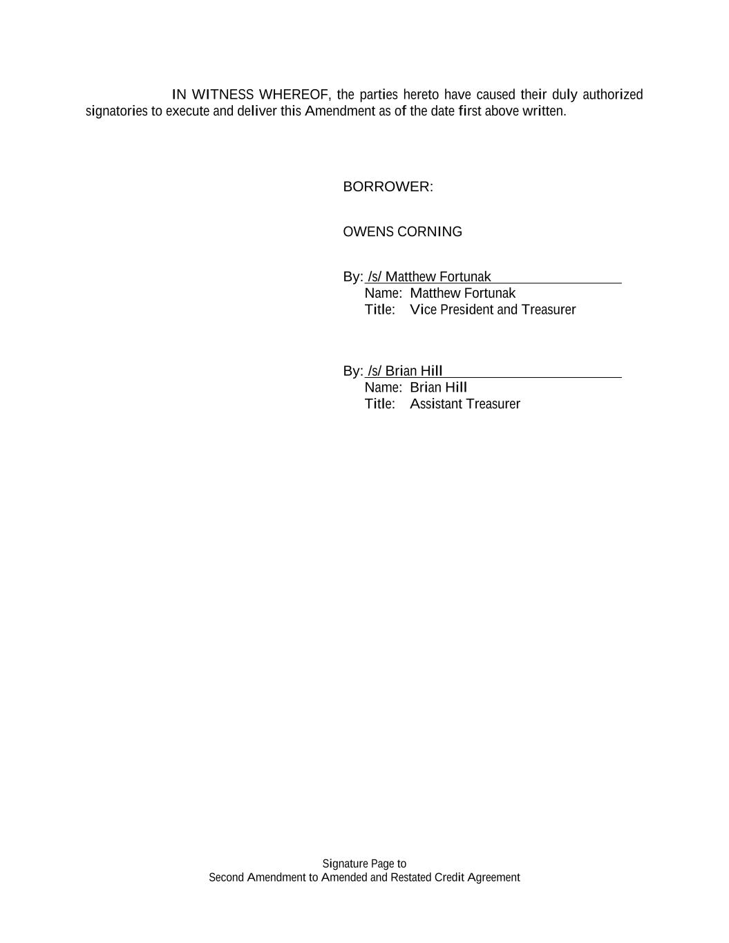 Signature Page to Second Amendment to Amended and Restated Credit Agreement IN WITNESS WHEREOF, the parties hereto have caused their duly authorized signatories to execute and deliver this Amendment as of the date first above written. BORROWER: OWENS CORNING By: /s/ Matthew Fortunak Name: Matthew Fortunak Title: Vice President and Treasurer By: /s/ Brian Hill Name: Brian Hill Title: Assistant Treasurer