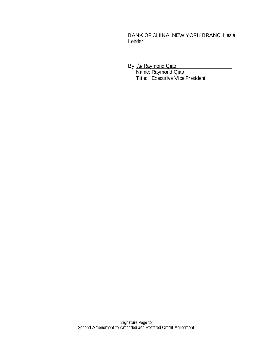 Signature Page to Second Amendment to Amended and Restated Credit Agreement BANK OF CHINA, NEW YORK BRANCH, as a Lender By: /s/ Raymond Qiao Name: Raymond Qiao Title: Executive Vice President