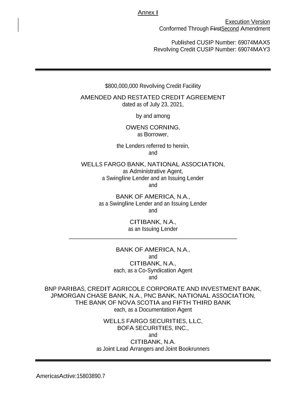 Execution Version Conformed Through FirstSecond Amendment AmericasActive:15803890.7 Published CUSIP Number: 69074MAX5 Revolving Credit CUSIP Number: 69074MAY3 $800,000,000 Revolving Credit Facility AMENDED AND RESTATED CREDIT AGREEMENT dated as of July 23, 2021, by and among OWENS CORNING, as Borrower, the Lenders referred to herein, and WELLS FARGO BANK, NATIONAL ASSOCIATION, as Administrative Agent, a Swingline Lender and an Issuing Lender and BANK OF AMERICA, N.A., as a Swingline Lender and an Issuing Lender and CITIBANK, N.A., as an Issuing Lender ________________________________________________________ BANK OF AMERICA, N.A., and CITIBANK, N.A., each, as a Co-Syndication Agent and BNP PARIBAS, CREDIT AGRICOLE CORPORATE AND INVESTMENT BANK, JPMORGAN CHASE BANK, N.A., PNC BANK, NATIONAL ASSOCIATION, THE BANK OF NOVA SCOTIA and FIFTH THIRD BANK each, as a Documentation Agent WELLS FARGO SECURITIES, LLC, BOFA SECURITIES, INC., and CITIBANK, N.A. as Joint Lead Arrangers and Joint Bookrunners Annex I
