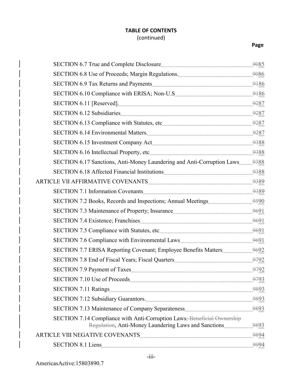 AmericasActive:15803890.7 TABLE OF CONTENTS (continued) Page -iii- SECTION 6.7 True and Complete Disclosure 9085 SECTION 6.8 Use of Proceeds; Margin Regulations. 9086 SECTION 6.9 Tax Returns and Payments 9186 SECTION 6.10 Compliance with ERISA; Non-U.S 9186 SECTION 6.11 [Reserved]. 9287 SECTION 6.12 Subsidiaries 9287 SECTION 6.13 Compliance with Statutes, etc 9287 SECTION 6.14 Environmental Matters. 9287 SECTION 6.15 Investment Company Act 9388 SECTION 6.16 Intellectual Property, etc 9388 SECTION 6.17 Sanctions, Anti-Money Laundering and Anti-Corruption Laws 9388 SECTION 6.18 Affected Financial Institutions 9388 ARTICLE VII AFFIRMATIVE COVENANTS 9389 SECTION 7.1 Information Covenants 9389 SECTION 7.2 Books, Records and Inspections; Annual Meetings 9590 SECTION 7.3 Maintenance of Property; Insurance 9691 SECTION 7.4 Existence; Franchises 9691 SECTION 7.5 Compliance with Statutes, etc 9691 SECTION 7.6 Compliance with Environmental Laws 9691 SECTION 7.7 ERISA Reporting Covenant; Employee Benefits Matters 9692 SECTION 7.8 End of Fiscal Years; Fiscal Quarters 9792 SECTION 7.9 Payment of Taxes 9792 SECTION 7.10 Use of Proceeds 9793 SECTION 7.11 Ratings 9893 SECTION 7.12 Subsidiary Guarantors. 9893 SECTION 7.13 Maintenance of Company Separateness 9893 SECTION 7.14 Compliance with Anti-Corruption Laws; Beneficial Ownership Regulation, Anti-Money Laundering Laws and Sanctions 9893 ARTICLE VIII NEGATIVE COVENANTS 9894 SECTION 8.1 Liens 9994