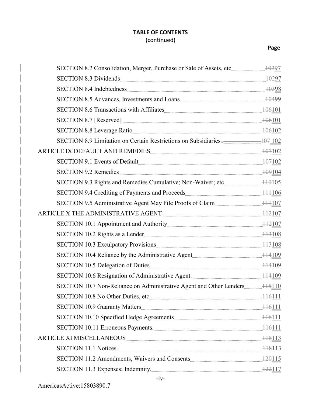 AmericasActive:15803890.7 TABLE OF CONTENTS (continued) Page -iv- SECTION 8.2 Consolidation, Merger, Purchase or Sale of Assets, etc 10297 SECTION 8.3 Dividends 10297 SECTION 8.4 Indebtedness 10398 SECTION 8.5 Advances, Investments and Loans 10499 SECTION 8.6 Transactions with Affiliates 106101 SECTION 8.7 [Reserved] 106101 SECTION 8.8 Leverage Ratio 106102 SECTION 8.9 Limitation on Certain Restrictions on Subsidiaries.. 107 102 ARTICLE IX DEFAULT AND REMEDIES 107102 SECTION 9.1 Events of Default 107102 SECTION 9.2 Remedies 109104 SECTION 9.3 Rights and Remedies Cumulative; Non-Waiver; etc 110105 SECTION 9.4 Crediting of Payments and Proceeds 111106 SECTION 9.5 Administrative Agent May File Proofs of Claim 111107 ARTICLE X THE ADMINISTRATIVE AGENT 112107 SECTION 10.1 Appointment and Authority 112107 SECTION 10.2 Rights as a Lender 113108 SECTION 10.3 Exculpatory Provisions 113108 SECTION 10.4 Reliance by the Administrative Agent 114109 SECTION 10.5 Delegation of Duties 114109 SECTION 10.6 Resignation of Administrative Agent. 114109 SECTION 10.7 Non-Reliance on Administrative Agent and Other Lenders 115110 SECTION 10.8 No Other Duties, etc 116111 SECTION 10.9 Guaranty Matters 116111 SECTION 10.10 Specified Hedge Agreements 116111 SECTION 10.11 Erroneous Payments. 116111 ARTICLE XI MISCELLANEOUS 118113 SECTION 11.1 Notices. 118113 SECTION 11.2 Amendments, Waivers and Consents 120115 SECTION 11.3 Expenses; Indemnity. 122117