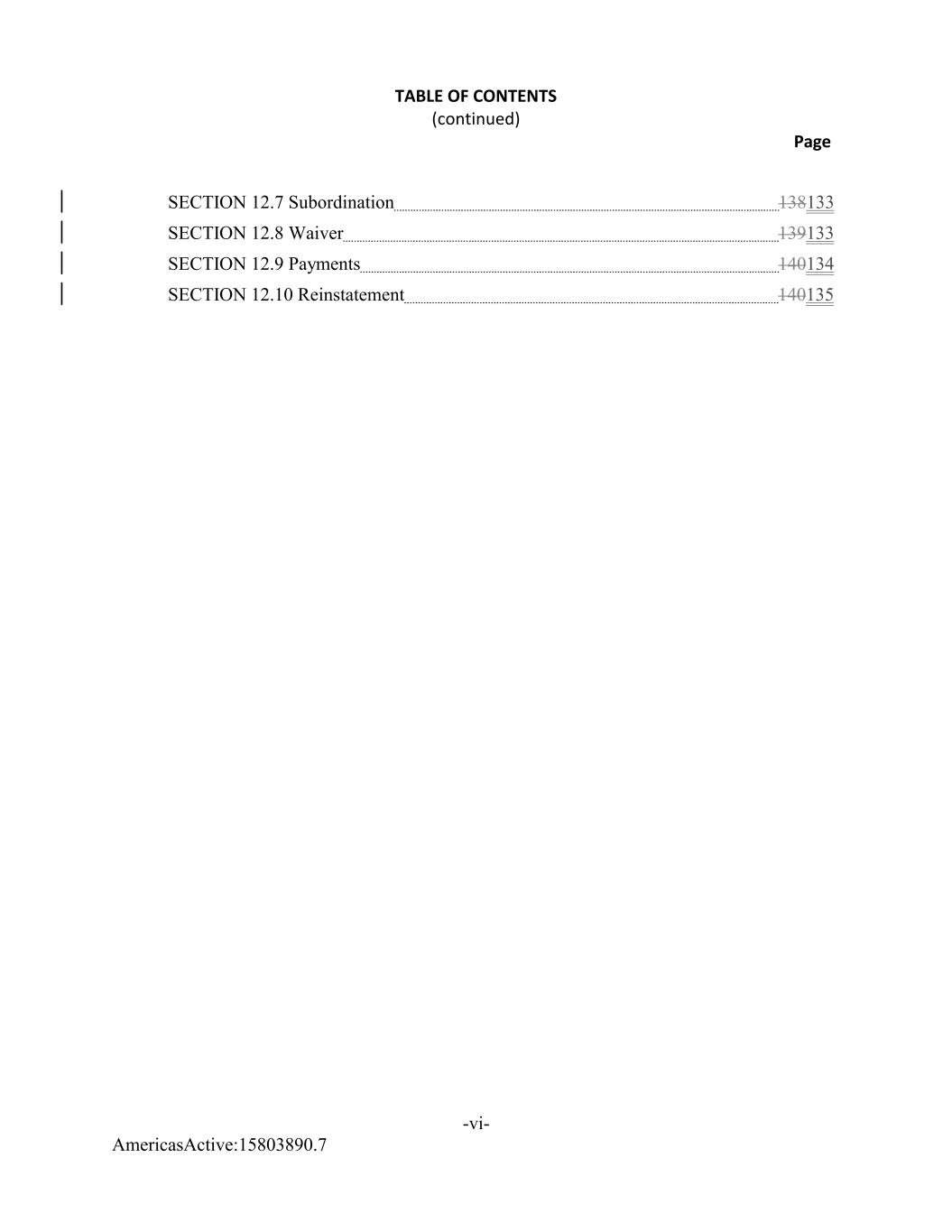 AmericasActive:15803890.7 TABLE OF CONTENTS (continued) Page -vi- SECTION 12.7 Subordination 138133 SECTION 12.8 Waiver 139133 SECTION 12.9 Payments 140134 SECTION 12.10 Reinstatement 140135