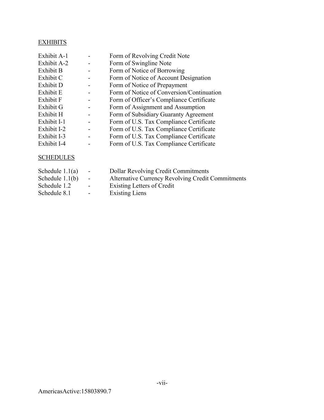 AmericasActive:15803890.7 -vii- EXHIBITS Exhibit A-1 - Form of Revolving Credit Note Exhibit A-2 - Form of Swingline Note Exhibit B - Form of Notice of Borrowing Exhibit C - Form of Notice of Account Designation Exhibit D - Form of Notice of Prepayment Exhibit E - Form of Notice of Conversion/Continuation Exhibit F - Form of Officer’s Compliance Certificate Exhibit G - Form of Assignment and Assumption Exhibit H - Form of Subsidiary Guaranty Agreement Exhibit I-1 - Form of U.S. Tax Compliance Certificate Exhibit I-2 - Form of U.S. Tax Compliance Certificate Exhibit I-3 - Form of U.S. Tax Compliance Certificate Exhibit I-4 - Form of U.S. Tax Compliance Certificate SCHEDULES Schedule 1.1(a) - Dollar Revolving Credit Commitments Schedule 1.1(b) - Alternative Currency Revolving Credit Commitments Schedule 1.2 - Existing Letters of Credit Schedule 8.1 - Existing Liens