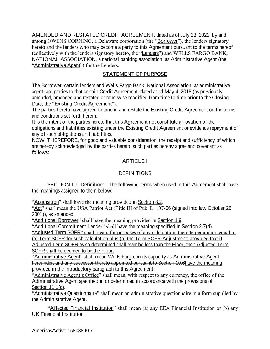 AmericasActive:15803890.7 AMENDED AND RESTATED CREDIT AGREEMENT, dated as of July 23, 2021, by and among OWENS CORNING, a Delaware corporation (the “Borrower”), the lenders signatory hereto and the lenders who may become a party to this Agreement pursuant to the terms hereof (collectively with the lenders signatory hereto, the “Lenders”) and WELLS FARGO BANK, NATIONAL ASSOCIATION, a national banking association, as Administrative Agent (the “Administrative Agent”) for the Lenders. STATEMENT OF PURPOSE The Borrower, certain lenders and Wells Fargo Bank, National Association, as administrative agent, are parties to that certain Credit Agreement, dated as of May 4, 2018 (as previously amended, amended and restated or otherwise modified from time to time prior to the Closing Date, the “Existing Credit Agreement”). The parties hereto have agreed to amend and restate the Existing Credit Agreement on the terms and conditions set forth herein. It is the intent of the parties hereto that this Agreement not constitute a novation of the obligations and liabilities existing under the Existing Credit Agreement or evidence repayment of any of such obligations and liabilities. NOW, THEREFORE, for good and valuable consideration, the receipt and sufficiency of which are hereby acknowledged by the parties hereto, such parties hereby agree and covenant as follows: ARTICLE I DEFINITIONS SECTION 1.1 Definitions. The following terms when used in this Agreement shall have the meanings assigned to them below: “Acquisition” shall have the meaning provided in Section 8.2. “Act” shall mean the USA Patriot Act (Title III of Pub. L. 107-56 (signed into law October 26, 2001)), as amended. “Additional Borrower” shall have the meaning provided in Section 1.9. “Additional Commitment Lender” shall have the meaning specified in Section 2.7(d). “Adjusted Term SOFR” shall mean, for purposes of any calculation, the rate per annum equal to (a) Term SOFR for such calculation plus (b) the Term SOFR Adjustment; provided that if Adjusted Term SOFR as so determined shall ever be less than the Floor, then Adjusted Term SOFR shall be deemed to be the Floor. “Administrative Agent” shall mean Wells Fargo, in its capacity as Administrative Agent hereunder, and any successor thereto appointed pursuant to Section 10.6have the meaning provided in the introductory paragraph to this Agreement. “Administrative Agent’s Office” shall mean, with respect to any currency, the office of the Administrative Agent specified in or determined in accordance with the provisions of Section 11.1(c). “Administrative Questionnaire” shall mean an administrative questionnaire in a form supplied by the Administrative Agent. “Affected Financial Institution” shall mean (a) any EEA Financial Institution or (b) any UK Financial Institution.