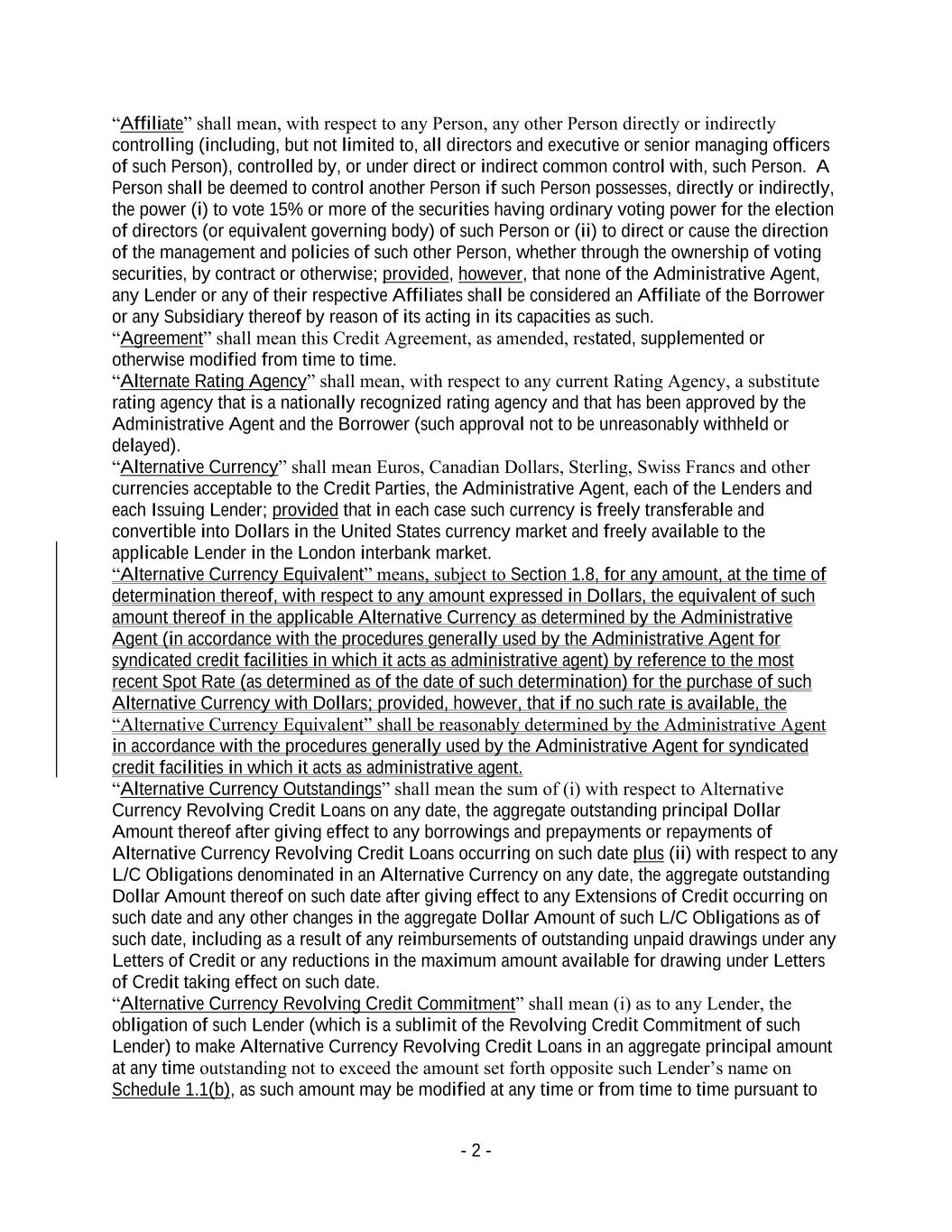 - 2 - “Affiliate” shall mean, with respect to any Person, any other Person directly or indirectly controlling (including, but not limited to, all directors and executive or senior managing officers of such Person), controlled by, or under direct or indirect common control with, such Person. A Person shall be deemed to control another Person if such Person possesses, directly or indirectly, the power (i) to vote 15% or more of the securities having ordinary voting power for the election of directors (or equivalent governing body) of such Person or (ii) to direct or cause the direction of the management and policies of such other Person, whether through the ownership of voting securities, by contract or otherwise; provided, however, that none of the Administrative Agent, any Lender or any of their respective Affiliates shall be considered an Affiliate of the Borrower or any Subsidiary thereof by reason of its acting in its capacities as such. “Agreement” shall mean this Credit Agreement, as amended, restated, supplemented or otherwise modified from time to time. “Alternate Rating Agency” shall mean, with respect to any current Rating Agency, a substitute rating agency that is a nationally recognized rating agency and that has been approved by the Administrative Agent and the Borrower (such approval not to be unreasonably withheld or delayed). “Alternative Currency” shall mean Euros, Canadian Dollars, Sterling, Swiss Francs and other currencies acceptable to the Credit Parties, the Administrative Agent, each of the Lenders and each Issuing Lender; provided that in each case such currency is freely transferable and convertible into Dollars in the United States currency market and freely available to the applicable Lender in the London interbank market. “Alternative Currency Equivalent” means, subject to Section 1.8, for any amount, at the time of determination thereof, with respect to any amount expressed in Dollars, the equivalent of such amount thereof in the applicable Alternative Currency as determined by the Administrative Agent (in accordance with the procedures generally used by the Administrative Agent for syndicated credit facilities in which it acts as administrative agent) by reference to the most recent Spot Rate (as determined as of the date of such determination) for the purchase of such Alternative Currency with Dollars; provided, however, that if no such rate is available, the “Alternative Currency Equivalent” shall be reasonably determined by the Administrative Agent in accordance with the procedures generally used by the Administrative Agent for syndicated credit facilities in which it acts as administrative agent. “Alternative Currency Outstandings” shall mean the sum of (i) with respect to Alternative Currency Revolving Credit Loans on any date, the aggregate outstanding principal Dollar Amount thereof after giving effect to any borrowings and prepayments or repayments of Alternative Currency Revolving Credit Loans occurring on such date plus (ii) with respect to any L/C Obligations denominated in an Alternative Currency on any date, the aggregate outstanding Dollar Amount thereof on such date after giving effect to any Extensions of Credit occurring on such date and any other changes in the aggregate Dollar Amount of such L/C Obligations as of such date, including as a result of any reimbursements of outstanding unpaid drawings under any Letters of Credit or any reductions in the maximum amount available for drawing under Letters of Credit taking effect on such date. “Alternative Currency Revolving Credit Commitment” shall mean (i) as to any Lender, the obligation of such Lender (which is a sublimit of the Revolving Credit Commitment of such Lender) to make Alternative Currency Revolving Credit Loans in an aggregate principal amount at any time outstanding not to exceed the amount set forth opposite such Lender’s name on Schedule 1.1(b), as such amount may be modified at any time or from time to time pursuant to