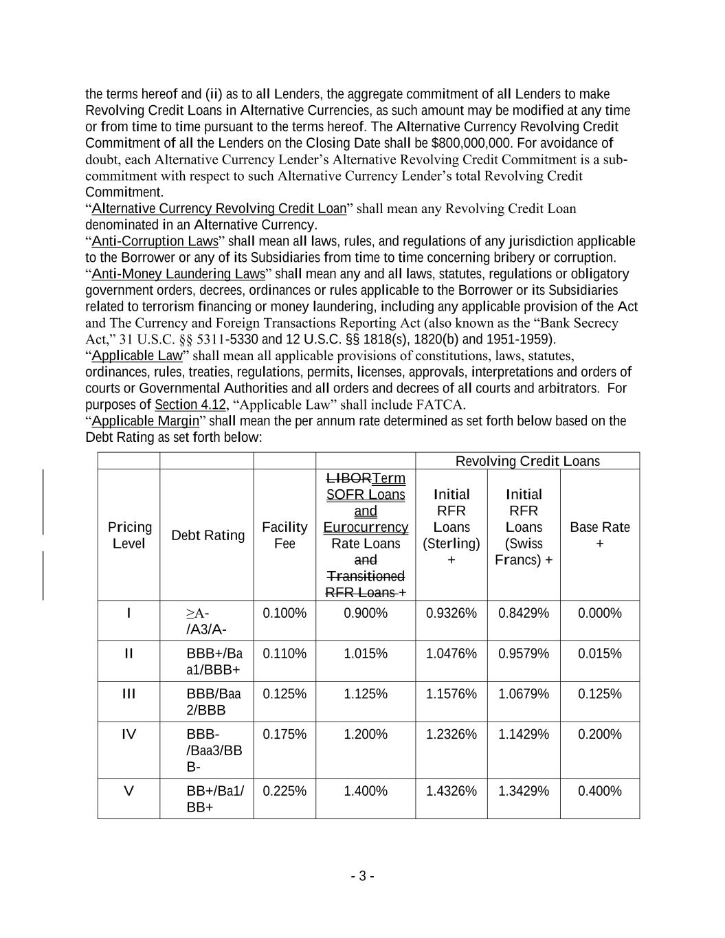 - 3 - the terms hereof and (ii) as to all Lenders, the aggregate commitment of all Lenders to make Revolving Credit Loans in Alternative Currencies, as such amount may be modified at any time or from time to time pursuant to the terms hereof. The Alternative Currency Revolving Credit Commitment of all the Lenders on the Closing Date shall be $800,000,000. For avoidance of doubt, each Alternative Currency Lender’s Alternative Revolving Credit Commitment is a sub- commitment with respect to such Alternative Currency Lender’s total Revolving Credit Commitment. “Alternative Currency Revolving Credit Loan” shall mean any Revolving Credit Loan denominated in an Alternative Currency. “Anti-Corruption Laws” shall mean all laws, rules, and regulations of any jurisdiction applicable to the Borrower or any of its Subsidiaries from time to time concerning bribery or corruption. “Anti-Money Laundering Laws” shall mean any and all laws, statutes, regulations or obligatory government orders, decrees, ordinances or rules applicable to the Borrower or its Subsidiaries related to terrorism financing or money laundering, including any applicable provision of the Act and The Currency and Foreign Transactions Reporting Act (also known as the “Bank Secrecy Act,” 31 U.S.C. §§ 5311-5330 and 12 U.S.C. §§ 1818(s), 1820(b) and 1951-1959). “Applicable Law” shall mean all applicable provisions of constitutions, laws, statutes, ordinances, rules, treaties, regulations, permits, licenses, approvals, interpretations and orders of courts or Governmental Authorities and all orders and decrees of all courts and arbitrators. For purposes of Section 4.12, “Applicable Law” shall include FATCA. “Applicable Margin” shall mean the per annum rate determined as set forth below based on the Debt Rating as set forth below: Revolving Credit Loans Pricing Level Debt Rating Facility Fee LIBORTerm SOFR Loans and Eurocurrency Rate Loans and Transitioned RFR Loans + Initial RFR Loans (Sterling) + Initial RFR Loans (Swiss Francs) + Base Rate + I ≥A- /A3/A- 0.100% 0.900% 0.9326% 0.8429% 0.000% II BBB+/Ba a1/BBB+ 0.110% 1.015% 1.0476% 0.9579% 0.015% III BBB/Baa 2/BBB 0.125% 1.125% 1.1576% 1.0679% 0.125% IV BBB- /Baa3/BB B- 0.175% 1.200% 1.2326% 1.1429% 0.200% V BB+/Ba1/ BB+ 0.225% 1.400% 1.4326% 1.3429% 0.400%