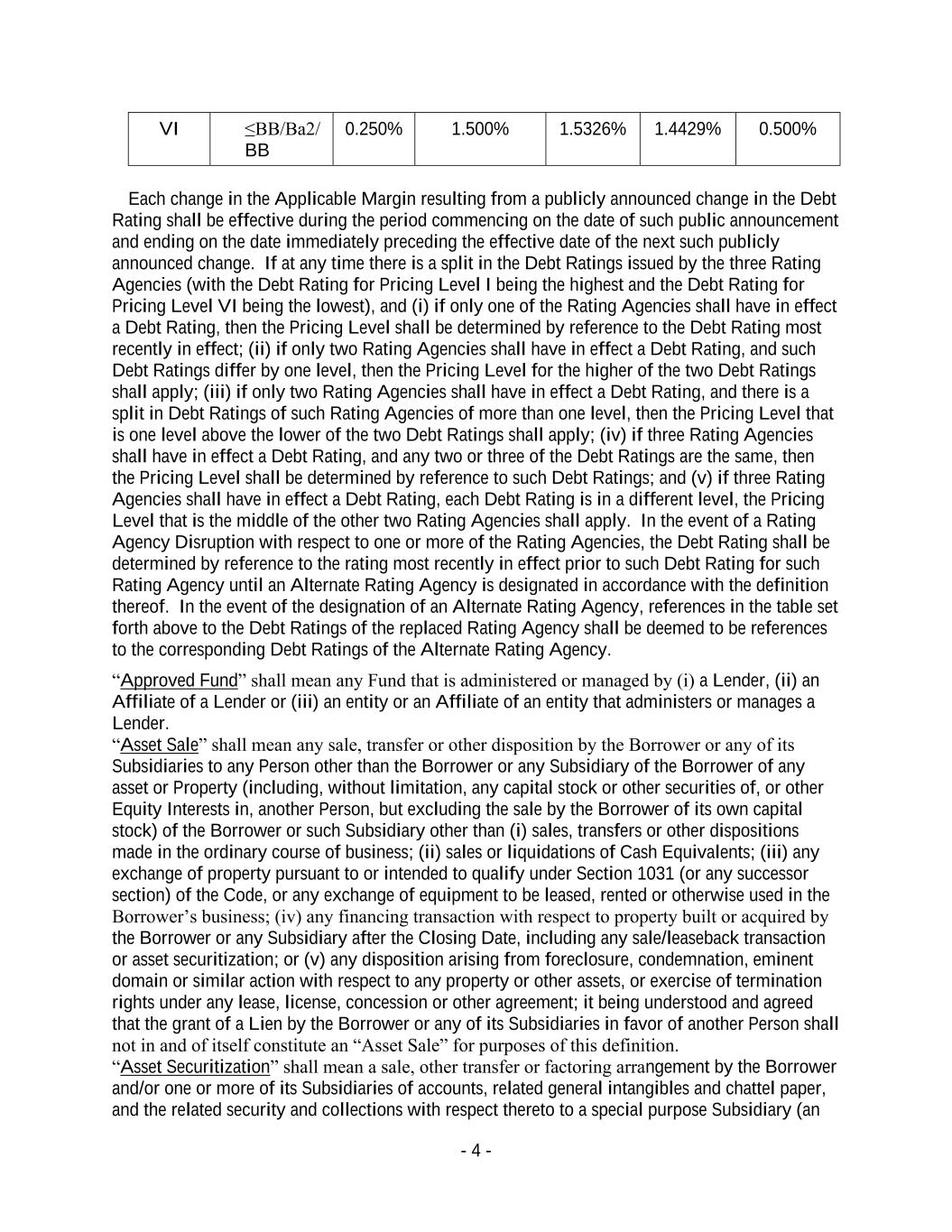 - 4 - VI ≤BB/Ba2/ BB 0.250% 1.500% 1.5326% 1.4429% 0.500% Each change in the Applicable Margin resulting from a publicly announced change in the Debt Rating shall be effective during the period commencing on the date of such public announcement and ending on the date immediately preceding the effective date of the next such publicly announced change. If at any time there is a split in the Debt Ratings issued by the three Rating Agencies (with the Debt Rating for Pricing Level I being the highest and the Debt Rating for Pricing Level VI being the lowest), and (i) if only one of the Rating Agencies shall have in effect a Debt Rating, then the Pricing Level shall be determined by reference to the Debt Rating most recently in effect; (ii) if only two Rating Agencies shall have in effect a Debt Rating, and such Debt Ratings differ by one level, then the Pricing Level for the higher of the two Debt Ratings shall apply; (iii) if only two Rating Agencies shall have in effect a Debt Rating, and there is a split in Debt Ratings of such Rating Agencies of more than one level, then the Pricing Level that is one level above the lower of the two Debt Ratings shall apply; (iv) if three Rating Agencies shall have in effect a Debt Rating, and any two or three of the Debt Ratings are the same, then the Pricing Level shall be determined by reference to such Debt Ratings; and (v) if three Rating Agencies shall have in effect a Debt Rating, each Debt Rating is in a different level, the Pricing Level that is the middle of the other two Rating Agencies shall apply. In the event of a Rating Agency Disruption with respect to one or more of the Rating Agencies, the Debt Rating shall be determined by reference to the rating most recently in effect prior to such Debt Rating for such Rating Agency until an Alternate Rating Agency is designated in accordance with the definition thereof. In the event of the designation of an Alternate Rating Agency, references in the table set forth above to the Debt Ratings of the replaced Rating Agency shall be deemed to be references to the corresponding Debt Ratings of the Alternate Rating Agency. “Approved Fund” shall mean any Fund that is administered or managed by (i) a Lender, (ii) an Affiliate of a Lender or (iii) an entity or an Affiliate of an entity that administers or manages a Lender. “Asset Sale” shall mean any sale, transfer or other disposition by the Borrower or any of its Subsidiaries to any Person other than the Borrower or any Subsidiary of the Borrower of any asset or Property (including, without limitation, any capital stock or other securities of, or other Equity Interests in, another Person, but excluding the sale by the Borrower of its own capital stock) of the Borrower or such Subsidiary other than (i) sales, transfers or other dispositions made in the ordinary course of business; (ii) sales or liquidations of Cash Equivalents; (iii) any exchange of property pursuant to or intended to qualify under Section 1031 (or any successor section) of the Code, or any exchange of equipment to be leased, rented or otherwise used in the Borrower’s business; (iv) any financing transaction with respect to property built or acquired by the Borrower or any Subsidiary after the Closing Date, including any sale/leaseback transaction or asset securitization; or (v) any disposition arising from foreclosure, condemnation, eminent domain or similar action with respect to any property or other assets, or exercise of termination rights under any lease, license, concession or other agreement; it being understood and agreed that the grant of a Lien by the Borrower or any of its Subsidiaries in favor of another Person shall not in and of itself constitute an “Asset Sale” for purposes of this definition. “Asset Securitization” shall mean a sale, other transfer or factoring arrangement by the Borrower and/or one or more of its Subsidiaries of accounts, related general intangibles and chattel paper, and the related security and collections with respect thereto to a special purpose Subsidiary (an