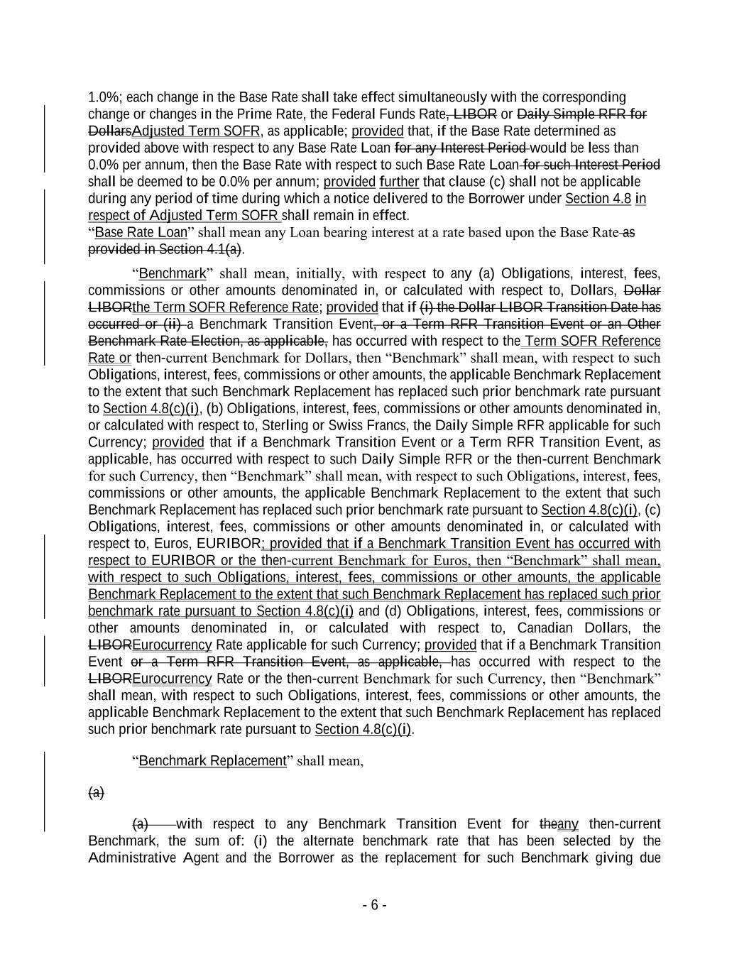 - 6 - 1.0%; each change in the Base Rate shall take effect simultaneously with the corresponding change or changes in the Prime Rate, the Federal Funds Rate, LIBOR or Daily Simple RFR for DollarsAdjusted Term SOFR, as applicable; provided that, if the Base Rate determined as provided above with respect to any Base Rate Loan for any Interest Period would be less than 0.0% per annum, then the Base Rate with respect to such Base Rate Loan for such Interest Period shall be deemed to be 0.0% per annum; provided further that clause (c) shall not be applicable during any period of time during which a notice delivered to the Borrower under Section 4.8 in respect of Adjusted Term SOFR shall remain in effect. “Base Rate Loan” shall mean any Loan bearing interest at a rate based upon the Base Rate as provided in Section 4.1(a). “Benchmark” shall mean, initially, with respect to any (a) Obligations, interest, fees, commissions or other amounts denominated in, or calculated with respect to, Dollars, Dollar LIBORthe Term SOFR Reference Rate; provided that if (i) the Dollar LIBOR Transition Date has occurred or (ii) a Benchmark Transition Event, or a Term RFR Transition Event or an Other Benchmark Rate Election, as applicable, has occurred with respect to the Term SOFR Reference Rate or then-current Benchmark for Dollars, then “Benchmark” shall mean, with respect to such Obligations, interest, fees, commissions or other amounts, the applicable Benchmark Replacement to the extent that such Benchmark Replacement has replaced such prior benchmark rate pursuant to Section 4.8(c)(i), (b) Obligations, interest, fees, commissions or other amounts denominated in, or calculated with respect to, Sterling or Swiss Francs, the Daily Simple RFR applicable for such Currency; provided that if a Benchmark Transition Event or a Term RFR Transition Event, as applicable, has occurred with respect to such Daily Simple RFR or the then-current Benchmark for such Currency, then “Benchmark” shall mean, with respect to such Obligations, interest, fees, commissions or other amounts, the applicable Benchmark Replacement to the extent that such Benchmark Replacement has replaced such prior benchmark rate pursuant to Section 4.8(c)(i), (c) Obligations, interest, fees, commissions or other amounts denominated in, or calculated with respect to, Euros, EURIBOR; provided that if a Benchmark Transition Event has occurred with respect to EURIBOR or the then-current Benchmark for Euros, then “Benchmark” shall mean, with respect to such Obligations, interest, fees, commissions or other amounts, the applicable Benchmark Replacement to the extent that such Benchmark Replacement has replaced such prior benchmark rate pursuant to Section 4.8(c)(i) and (d) Obligations, interest, fees, commissions or other amounts denominated in, or calculated with respect to, Canadian Dollars, the LIBOREurocurrency Rate applicable for such Currency; provided that if a Benchmark Transition Event or a Term RFR Transition Event, as applicable, has occurred with respect to the LIBOREurocurrency Rate or the then-current Benchmark for such Currency, then “Benchmark” shall mean, with respect to such Obligations, interest, fees, commissions or other amounts, the applicable Benchmark Replacement to the extent that such Benchmark Replacement has replaced such prior benchmark rate pursuant to Section 4.8(c)(i). “Benchmark Replacement” shall mean, (a) (a) with respect to any Benchmark Transition Event for theany then-current Benchmark, the sum of: (i) the alternate benchmark rate that has been selected by the Administrative Agent and the Borrower as the replacement for such Benchmark giving due