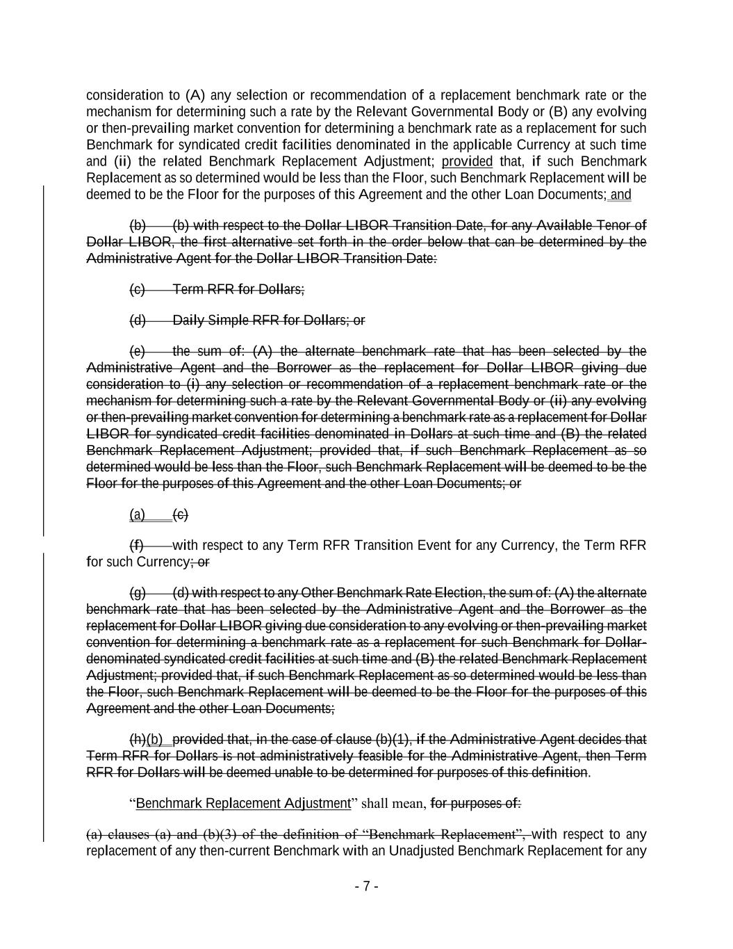 - 7 - consideration to (A) any selection or recommendation of a replacement benchmark rate or the mechanism for determining such a rate by the Relevant Governmental Body or (B) any evolving or then-prevailing market convention for determining a benchmark rate as a replacement for such Benchmark for syndicated credit facilities denominated in the applicable Currency at such time and (ii) the related Benchmark Replacement Adjustment; provided that, if such Benchmark Replacement as so determined would be less than the Floor, such Benchmark Replacement will be deemed to be the Floor for the purposes of this Agreement and the other Loan Documents; and (b) (b) with respect to the Dollar LIBOR Transition Date, for any Available Tenor of Dollar LIBOR, the first alternative set forth in the order below that can be determined by the Administrative Agent for the Dollar LIBOR Transition Date: (c) Term RFR for Dollars; (d) Daily Simple RFR for Dollars; or (e) the sum of: (A) the alternate benchmark rate that has been selected by the Administrative Agent and the Borrower as the replacement for Dollar LIBOR giving due consideration to (i) any selection or recommendation of a replacement benchmark rate or the mechanism for determining such a rate by the Relevant Governmental Body or (ii) any evolving or then-prevailing market convention for determining a benchmark rate as a replacement for Dollar LIBOR for syndicated credit facilities denominated in Dollars at such time and (B) the related Benchmark Replacement Adjustment; provided that, if such Benchmark Replacement as so determined would be less than the Floor, such Benchmark Replacement will be deemed to be the Floor for the purposes of this Agreement and the other Loan Documents; or (a) (c) (f) with respect to any Term RFR Transition Event for any Currency, the Term RFR for such Currency; or (g) (d) with respect to any Other Benchmark Rate Election, the sum of: (A) the alternate benchmark rate that has been selected by the Administrative Agent and the Borrower as the replacement for Dollar LIBOR giving due consideration to any evolving or then-prevailing market convention for determining a benchmark rate as a replacement for such Benchmark for Dollar- denominated syndicated credit facilities at such time and (B) the related Benchmark Replacement Adjustment; provided that, if such Benchmark Replacement as so determined would be less than the Floor, such Benchmark Replacement will be deemed to be the Floor for the purposes of this Agreement and the other Loan Documents; (h)(b) provided that, in the case of clause (b)(1), if the Administrative Agent decides that Term RFR for Dollars is not administratively feasible for the Administrative Agent, then Term RFR for Dollars will be deemed unable to be determined for purposes of this definition. “Benchmark Replacement Adjustment” shall mean, for purposes of: (a) clauses (a) and (b)(3) of the definition of “Benchmark Replacement”, with respect to any replacement of any then-current Benchmark with an Unadjusted Benchmark Replacement for any