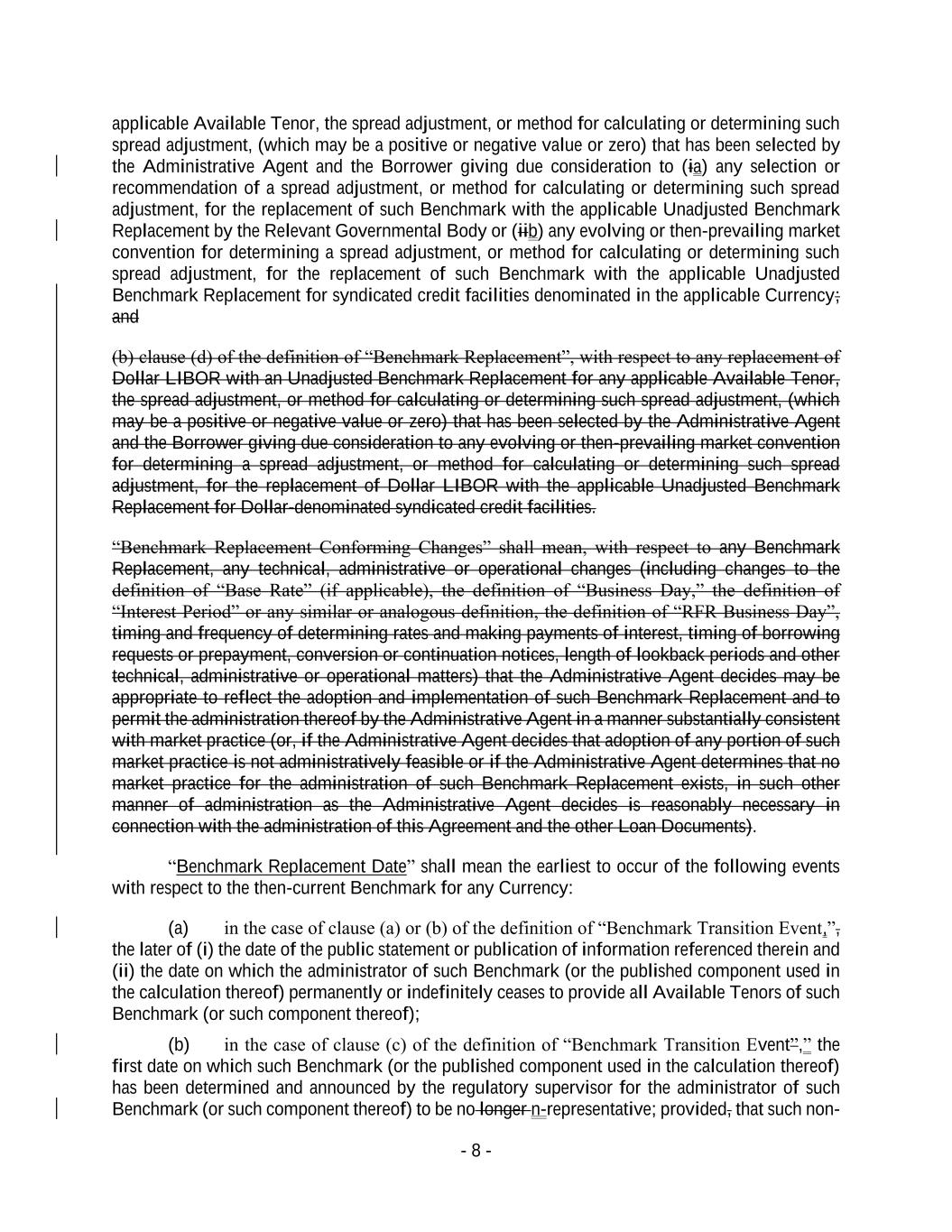 - 8 - applicable Available Tenor, the spread adjustment, or method for calculating or determining such spread adjustment, (which may be a positive or negative value or zero) that has been selected by the Administrative Agent and the Borrower giving due consideration to (ia) any selection or recommendation of a spread adjustment, or method for calculating or determining such spread adjustment, for the replacement of such Benchmark with the applicable Unadjusted Benchmark Replacement by the Relevant Governmental Body or (iib) any evolving or then-prevailing market convention for determining a spread adjustment, or method for calculating or determining such spread adjustment, for the replacement of such Benchmark with the applicable Unadjusted Benchmark Replacement for syndicated credit facilities denominated in the applicable Currency; and (b) clause (d) of the definition of “Benchmark Replacement”, with respect to any replacement of Dollar LIBOR with an Unadjusted Benchmark Replacement for any applicable Available Tenor, the spread adjustment, or method for calculating or determining such spread adjustment, (which may be a positive or negative value or zero) that has been selected by the Administrative Agent and the Borrower giving due consideration to any evolving or then-prevailing market convention for determining a spread adjustment, or method for calculating or determining such spread adjustment, for the replacement of Dollar LIBOR with the applicable Unadjusted Benchmark Replacement for Dollar-denominated syndicated credit facilities. “Benchmark Replacement Conforming Changes” shall mean, with respect to any Benchmark Replacement, any technical, administrative or operational changes (including changes to the definition of “Base Rate” (if applicable), the definition of “Business Day,” the definition of “Interest Period” or any similar or analogous definition, the definition of “RFR Business Day”, timing and frequency of determining rates and making payments of interest, timing of borrowing requests or prepayment, conversion or continuation notices, length of lookback periods and other technical, administrative or operational matters) that the Administrative Agent decides may be appropriate to reflect the adoption and implementation of such Benchmark Replacement and to permit the administration thereof by the Administrative Agent in a manner substantially consistent with market practice (or, if the Administrative Agent decides that adoption of any portion of such market practice is not administratively feasible or if the Administrative Agent determines that no market practice for the administration of such Benchmark Replacement exists, in such other manner of administration as the Administrative Agent decides is reasonably necessary in connection with the administration of this Agreement and the other Loan Documents). “Benchmark Replacement Date” shall mean the earliest to occur of the following events with respect to the then-current Benchmark for any Currency: (a) in the case of clause (a) or (b) of the definition of “Benchmark Transition Event,”, the later of (i) the date of the public statement or publication of information referenced therein and (ii) the date on which the administrator of such Benchmark (or the published component used in the calculation thereof) permanently or indefinitely ceases to provide all Available Tenors of such Benchmark (or such component thereof); (b) in the case of clause (c) of the definition of “Benchmark Transition Event”,” the first date on which such Benchmark (or the published component used in the calculation thereof) has been determined and announced by the regulatory supervisor for the administrator of such Benchmark (or such component thereof) to be no longer n-representative; provided, that such non-
