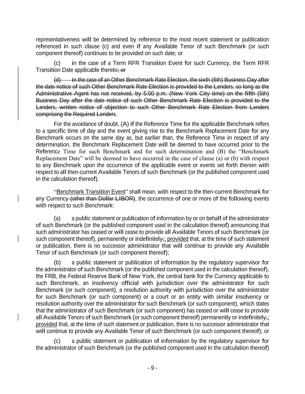 - 9 - representativeness will be determined by reference to the most recent statement or publication referenced in such clause (c) and even if any Available Tenor of such Benchmark (or such component thereof) continues to be provided on such date; or (c) in the case of a Term RFR Transition Event for such Currency, the Term RFR Transition Date applicable thereto; or (d) in the case of an Other Benchmark Rate Election, the sixth (6th) Business Day after the date notice of such Other Benchmark Rate Election is provided to the Lenders, so long as the Administrative Agent has not received, by 5:00 p.m. (New York City time) on the fifth (5th) Business Day after the date notice of such Other Benchmark Rate Election is provided to the Lenders, written notice of objection to such Other Benchmark Rate Election from Lenders comprising the Required Lenders. For the avoidance of doubt, (A) if the Reference Time for the applicable Benchmark refers to a specific time of day and the event giving rise to the Benchmark Replacement Date for any Benchmark occurs on the same day as, but earlier than, the Reference Time in respect of any determination, the Benchmark Replacement Date will be deemed to have occurred prior to the Reference Time for such Benchmark and for such determination and (B) the “Benchmark Replacement Date” will be deemed to have occurred in the case of clause (a) or (b) with respect to any Benchmark upon the occurrence of the applicable event or events set forth therein with respect to all then-current Available Tenors of such Benchmark (or the published component used in the calculation thereof). “Benchmark Transition Event” shall mean, with respect to the then-current Benchmark for any Currency (other than Dollar LIBOR), the occurrence of one or more of the following events with respect to such Benchmark: (a) a public statement or publication of information by or on behalf of the administrator of such Benchmark (or the published component used in the calculation thereof) announcing that such administrator has ceased or will cease to provide all Available Tenors of such Benchmark (or such component thereof), permanently or indefinitely,; provided that, at the time of such statement or publication, there is no successor administrator that will continue to provide any Available Tenor of such Benchmark (or such component thereof); (b) a public statement or publication of information by the regulatory supervisor for the administrator of such Benchmark (or the published component used in the calculation thereof), the FRB, the Federal Reserve Bank of New York, the central bank for the Currency applicable to such Benchmark, an insolvency official with jurisdiction over the administrator for such Benchmark (or such component), a resolution authority with jurisdiction over the administrator for such Benchmark (or such component) or a court or an entity with similar insolvency or resolution authority over the administrator for such Benchmark (or such component), which states that the administrator of such Benchmark (or such component) has ceased or will cease to provide all Available Tenors of such Benchmark (or such component thereof) permanently or indefinitely,; provided that, at the time of such statement or publication, there is no successor administrator that will continue to provide any Available Tenor of such Benchmark (or such component thereof); or (c) a public statement or publication of information by the regulatory supervisor for the administrator of such Benchmark (or the published component used in the calculation thereof)