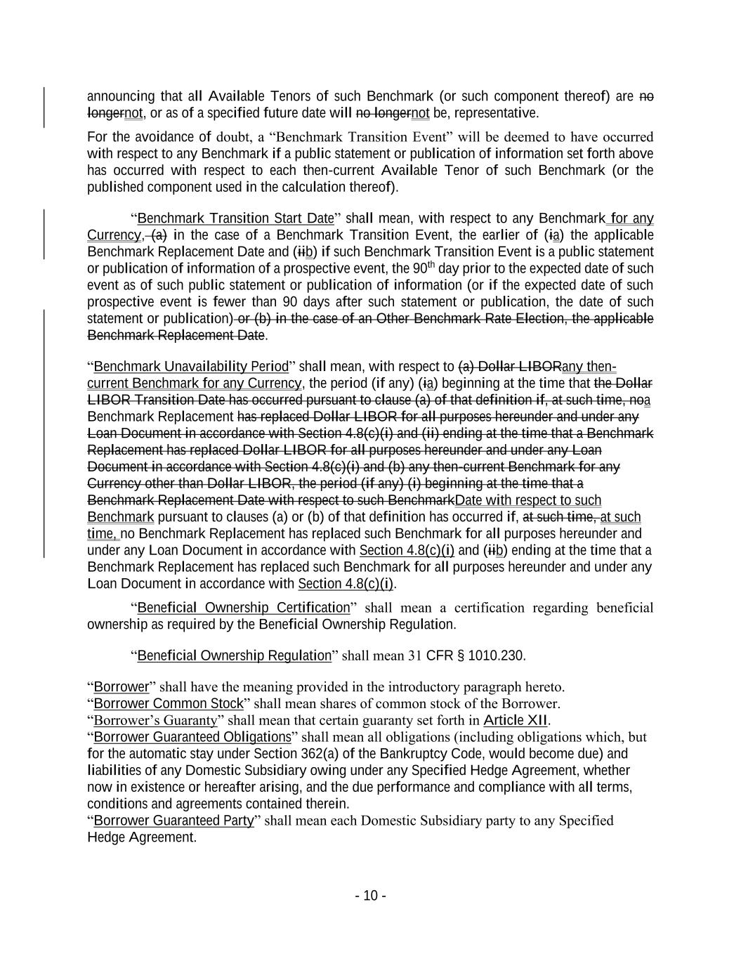 - 10 - announcing that all Available Tenors of such Benchmark (or such component thereof) are no longernot, or as of a specified future date will no longernot be, representative. For the avoidance of doubt, a “Benchmark Transition Event” will be deemed to have occurred with respect to any Benchmark if a public statement or publication of information set forth above has occurred with respect to each then-current Available Tenor of such Benchmark (or the published component used in the calculation thereof). “Benchmark Transition Start Date” shall mean, with respect to any Benchmark for any Currency, (a) in the case of a Benchmark Transition Event, the earlier of (ia) the applicable Benchmark Replacement Date and (iib) if such Benchmark Transition Event is a public statement or publication of information of a prospective event, the 90th day prior to the expected date of such event as of such public statement or publication of information (or if the expected date of such prospective event is fewer than 90 days after such statement or publication, the date of such statement or publication) or (b) in the case of an Other Benchmark Rate Election, the applicable Benchmark Replacement Date. “Benchmark Unavailability Period” shall mean, with respect to (a) Dollar LIBORany then- current Benchmark for any Currency, the period (if any) (ia) beginning at the time that the Dollar LIBOR Transition Date has occurred pursuant to clause (a) of that definition if, at such time, noa Benchmark Replacement has replaced Dollar LIBOR for all purposes hereunder and under any Loan Document in accordance with Section 4.8(c)(i) and (ii) ending at the time that a Benchmark Replacement has replaced Dollar LIBOR for all purposes hereunder and under any Loan Document in accordance with Section 4.8(c)(i) and (b) any then-current Benchmark for any Currency other than Dollar LIBOR, the period (if any) (i) beginning at the time that a Benchmark Replacement Date with respect to such BenchmarkDate with respect to such Benchmark pursuant to clauses (a) or (b) of that definition has occurred if, at such time, at such time, no Benchmark Replacement has replaced such Benchmark for all purposes hereunder and under any Loan Document in accordance with Section 4.8(c)(i) and (iib) ending at the time that a Benchmark Replacement has replaced such Benchmark for all purposes hereunder and under any Loan Document in accordance with Section 4.8(c)(i). “Beneficial Ownership Certification” shall mean a certification regarding beneficial ownership as required by the Beneficial Ownership Regulation. “Beneficial Ownership Regulation” shall mean 31 CFR § 1010.230. “Borrower” shall have the meaning provided in the introductory paragraph hereto. “Borrower Common Stock” shall mean shares of common stock of the Borrower. “Borrower’s Guaranty” shall mean that certain guaranty set forth in Article XII. “Borrower Guaranteed Obligations” shall mean all obligations (including obligations which, but for the automatic stay under Section 362(a) of the Bankruptcy Code, would become due) and liabilities of any Domestic Subsidiary owing under any Specified Hedge Agreement, whether now in existence or hereafter arising, and the due performance and compliance with all terms, conditions and agreements contained therein. “Borrower Guaranteed Party” shall mean each Domestic Subsidiary party to any Specified Hedge Agreement.