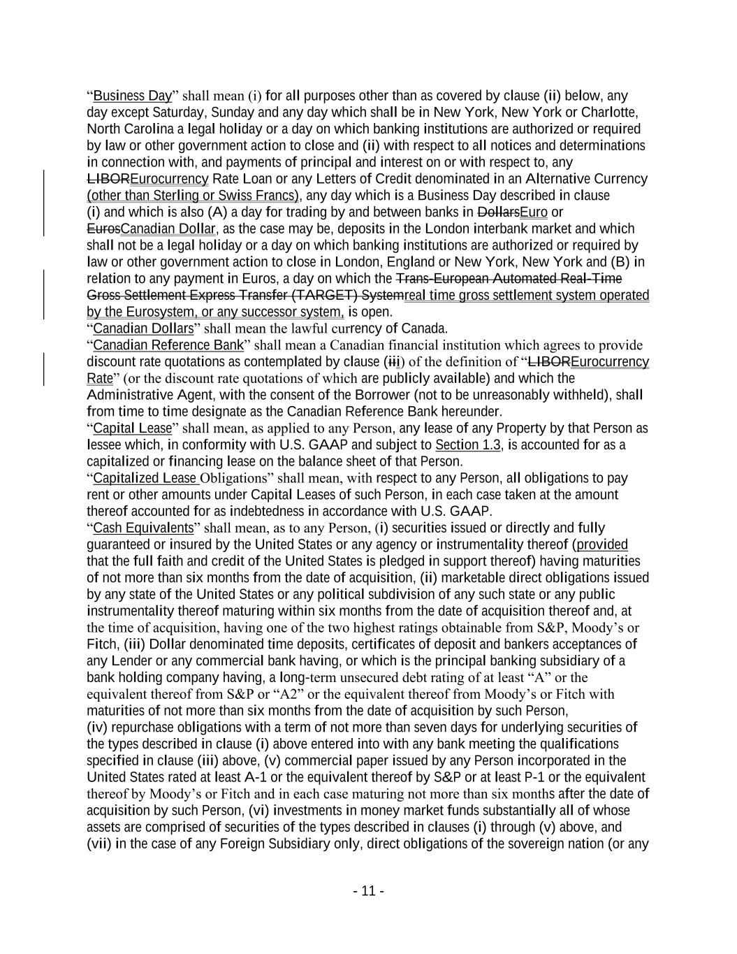 - 11 - “Business Day” shall mean (i) for all purposes other than as covered by clause (ii) below, any day except Saturday, Sunday and any day which shall be in New York, New York or Charlotte, North Carolina a legal holiday or a day on which banking institutions are authorized or required by law or other government action to close and (ii) with respect to all notices and determinations in connection with, and payments of principal and interest on or with respect to, any LIBOREurocurrency Rate Loan or any Letters of Credit denominated in an Alternative Currency (other than Sterling or Swiss Francs), any day which is a Business Day described in clause (i) and which is also (A) a day for trading by and between banks in DollarsEuro or EurosCanadian Dollar, as the case may be, deposits in the London interbank market and which shall not be a legal holiday or a day on which banking institutions are authorized or required by law or other government action to close in London, England or New York, New York and (B) in relation to any payment in Euros, a day on which the Trans-European Automated Real-Time Gross Settlement Express Transfer (TARGET) Systemreal time gross settlement system operated by the Eurosystem, or any successor system, is open. “Canadian Dollars” shall mean the lawful currency of Canada. “Canadian Reference Bank” shall mean a Canadian financial institution which agrees to provide discount rate quotations as contemplated by clause (iii) of the definition of “LIBOREurocurrency Rate” (or the discount rate quotations of which are publicly available) and which the Administrative Agent, with the consent of the Borrower (not to be unreasonably withheld), shall from time to time designate as the Canadian Reference Bank hereunder. “Capital Lease” shall mean, as applied to any Person, any lease of any Property by that Person as lessee which, in conformity with U.S. GAAP and subject to Section 1.3, is accounted for as a capitalized or financing lease on the balance sheet of that Person. “Capitalized Lease Obligations” shall mean, with respect to any Person, all obligations to pay rent or other amounts under Capital Leases of such Person, in each case taken at the amount thereof accounted for as indebtedness in accordance with U.S. GAAP. “Cash Equivalents” shall mean, as to any Person, (i) securities issued or directly and fully guaranteed or insured by the United States or any agency or instrumentality thereof (provided that the full faith and credit of the United States is pledged in support thereof) having maturities of not more than six months from the date of acquisition, (ii) marketable direct obligations issued by any state of the United States or any political subdivision of any such state or any public instrumentality thereof maturing within six months from the date of acquisition thereof and, at the time of acquisition, having one of the two highest ratings obtainable from S&P, Moody’s or Fitch, (iii) Dollar denominated time deposits, certificates of deposit and bankers acceptances of any Lender or any commercial bank having, or which is the principal banking subsidiary of a bank holding company having, a long-term unsecured debt rating of at least “A” or the equivalent thereof from S&P or “A2” or the equivalent thereof from Moody’s or Fitch with maturities of not more than six months from the date of acquisition by such Person, (iv) repurchase obligations with a term of not more than seven days for underlying securities of the types described in clause (i) above entered into with any bank meeting the qualifications specified in clause (iii) above, (v) commercial paper issued by any Person incorporated in the United States rated at least A-1 or the equivalent thereof by S&P or at least P-1 or the equivalent thereof by Moody’s or Fitch and in each case maturing not more than six months after the date of acquisition by such Person, (vi) investments in money market funds substantially all of whose assets are comprised of securities of the types described in clauses (i) through (v) above, and (vii) in the case of any Foreign Subsidiary only, direct obligations of the sovereign nation (or any