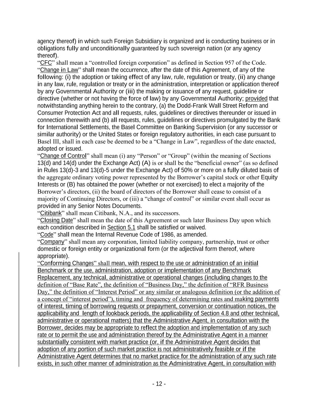 - 12 - agency thereof) in which such Foreign Subsidiary is organized and is conducting business or in obligations fully and unconditionally guaranteed by such sovereign nation (or any agency thereof). “CFC” shall mean a “controlled foreign corporation” as defined in Section 957 of the Code. “Change in Law” shall mean the occurrence, after the date of this Agreement, of any of the following: (i) the adoption or taking effect of any law, rule, regulation or treaty, (ii) any change in any law, rule, regulation or treaty or in the administration, interpretation or application thereof by any Governmental Authority or (iii) the making or issuance of any request, guideline or directive (whether or not having the force of law) by any Governmental Authority; provided that notwithstanding anything herein to the contrary, (a) the Dodd-Frank Wall Street Reform and Consumer Protection Act and all requests, rules, guidelines or directives thereunder or issued in connection therewith and (b) all requests, rules, guidelines or directives promulgated by the Bank for International Settlements, the Basel Committee on Banking Supervision (or any successor or similar authority) or the United States or foreign regulatory authorities, in each case pursuant to Basel III, shall in each case be deemed to be a “Change in Law”, regardless of the date enacted, adopted or issued. “Change of Control” shall mean (i) any “Person” or “Group” (within the meaning of Sections 13(d) and 14(d) under the Exchange Act) (A) is or shall be the “beneficial owner” (as so defined in Rules 13(d)-3 and 13(d)-5 under the Exchange Act) of 50% or more on a fully diluted basis of the aggregate ordinary voting power represented by the Borrower’s capital stock or other Equity Interests or (B) has obtained the power (whether or not exercised) to elect a majority of the Borrower’s directors, (ii) the board of directors of the Borrower shall cease to consist of a majority of Continuing Directors, or (iii) a “change of control” or similar event shall occur as provided in any Senior Notes Documents. “Citibank” shall mean Citibank, N.A., and its successors. “Closing Date” shall mean the date of this Agreement or such later Business Day upon which each condition described in Section 5.1 shall be satisfied or waived. “Code” shall mean the Internal Revenue Code of 1986, as amended. “Company” shall mean any corporation, limited liability company, partnership, trust or other domestic or foreign entity or organizational form (or the adjectival form thereof, where appropriate). “Conforming Changes” shall mean, with respect to the use or administration of an initial Benchmark or the use, administration, adoption or implementation of any Benchmark Replacement, any technical, administrative or operational changes (including changes to the definition of “Base Rate”, the definition of “Business Day,” the definition of “RFR Business Day,” the definition of “Interest Period” or any similar or analogous definition (or the addition of a concept of “interest period”), timing and frequency of determining rates and making payments of interest, timing of borrowing requests or prepayment, conversion or continuation notices, the applicability and length of lookback periods, the applicability of Section 4.8 and other technical, administrative or operational matters) that the Administrative Agent, in consultation with the Borrower, decides may be appropriate to reflect the adoption and implementation of any such rate or to permit the use and administration thereof by the Administrative Agent in a manner substantially consistent with market practice (or, if the Administrative Agent decides that adoption of any portion of such market practice is not administratively feasible or if the Administrative Agent determines that no market practice for the administration of any such rate exists, in such other manner of administration as the Administrative Agent, in consultation with