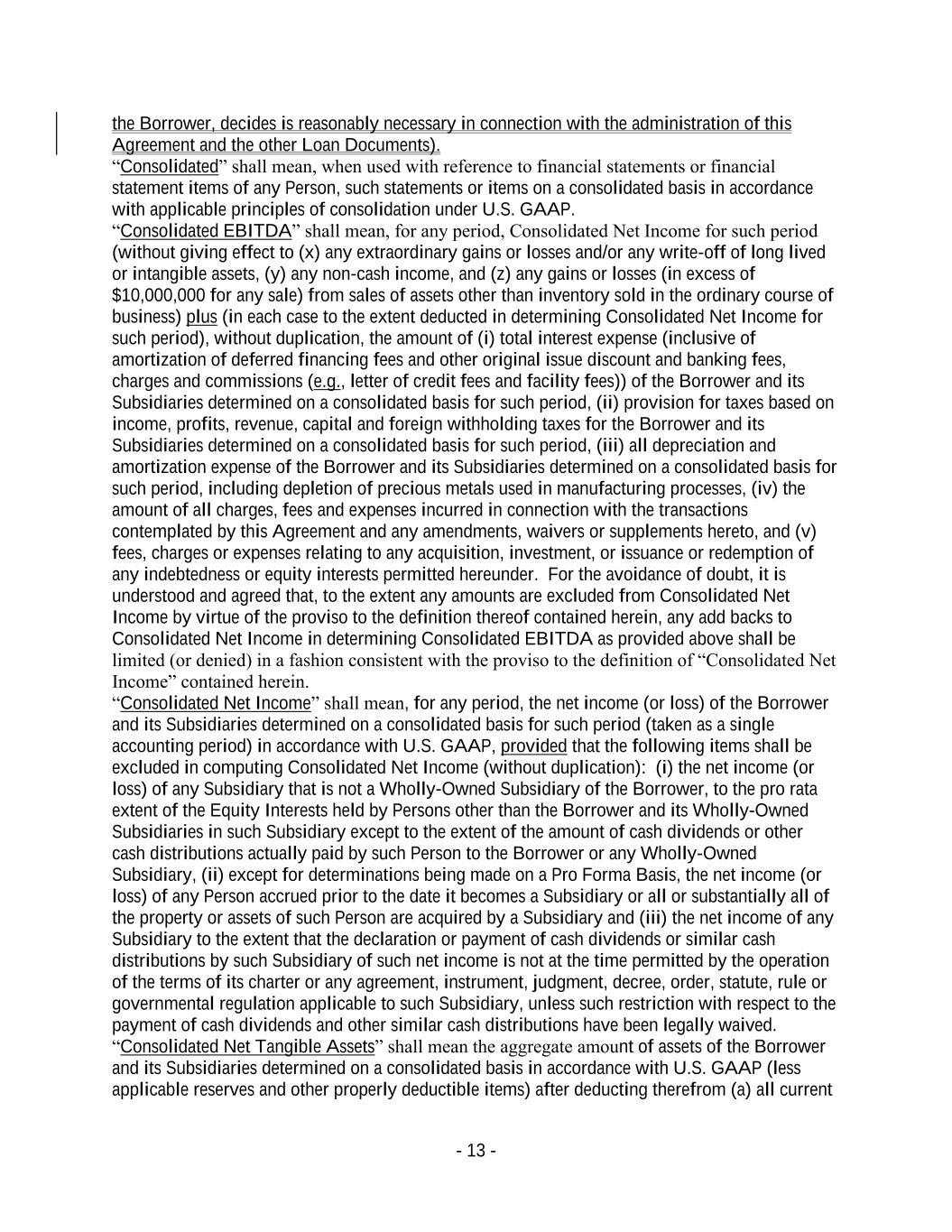 - 13 - the Borrower, decides is reasonably necessary in connection with the administration of this Agreement and the other Loan Documents). “Consolidated” shall mean, when used with reference to financial statements or financial statement items of any Person, such statements or items on a consolidated basis in accordance with applicable principles of consolidation under U.S. GAAP. “Consolidated EBITDA” shall mean, for any period, Consolidated Net Income for such period (without giving effect to (x) any extraordinary gains or losses and/or any write-off of long lived or intangible assets, (y) any non-cash income, and (z) any gains or losses (in excess of $10,000,000 for any sale) from sales of assets other than inventory sold in the ordinary course of business) plus (in each case to the extent deducted in determining Consolidated Net Income for such period), without duplication, the amount of (i) total interest expense (inclusive of amortization of deferred financing fees and other original issue discount and banking fees, charges and commissions (e.g., letter of credit fees and facility fees)) of the Borrower and its Subsidiaries determined on a consolidated basis for such period, (ii) provision for taxes based on income, profits, revenue, capital and foreign withholding taxes for the Borrower and its Subsidiaries determined on a consolidated basis for such period, (iii) all depreciation and amortization expense of the Borrower and its Subsidiaries determined on a consolidated basis for such period, including depletion of precious metals used in manufacturing processes, (iv) the amount of all charges, fees and expenses incurred in connection with the transactions contemplated by this Agreement and any amendments, waivers or supplements hereto, and (v) fees, charges or expenses relating to any acquisition, investment, or issuance or redemption of any indebtedness or equity interests permitted hereunder. For the avoidance of doubt, it is understood and agreed that, to the extent any amounts are excluded from Consolidated Net Income by virtue of the proviso to the definition thereof contained herein, any add backs to Consolidated Net Income in determining Consolidated EBITDA as provided above shall be limited (or denied) in a fashion consistent with the proviso to the definition of “Consolidated Net Income” contained herein. “Consolidated Net Income” shall mean, for any period, the net income (or loss) of the Borrower and its Subsidiaries determined on a consolidated basis for such period (taken as a single accounting period) in accordance with U.S. GAAP, provided that the following items shall be excluded in computing Consolidated Net Income (without duplication): (i) the net income (or loss) of any Subsidiary that is not a Wholly-Owned Subsidiary of the Borrower, to the pro rata extent of the Equity Interests held by Persons other than the Borrower and its Wholly-Owned Subsidiaries in such Subsidiary except to the extent of the amount of cash dividends or other cash distributions actually paid by such Person to the Borrower or any Wholly-Owned Subsidiary, (ii) except for determinations being made on a Pro Forma Basis, the net income (or loss) of any Person accrued prior to the date it becomes a Subsidiary or all or substantially all of the property or assets of such Person are acquired by a Subsidiary and (iii) the net income of any Subsidiary to the extent that the declaration or payment of cash dividends or similar cash distributions by such Subsidiary of such net income is not at the time permitted by the operation of the terms of its charter or any agreement, instrument, judgment, decree, order, statute, rule or governmental regulation applicable to such Subsidiary, unless such restriction with respect to the payment of cash dividends and other similar cash distributions have been legally waived. “Consolidated Net Tangible Assets” shall mean the aggregate amount of assets of the Borrower and its Subsidiaries determined on a consolidated basis in accordance with U.S. GAAP (less applicable reserves and other properly deductible items) after deducting therefrom (a) all current