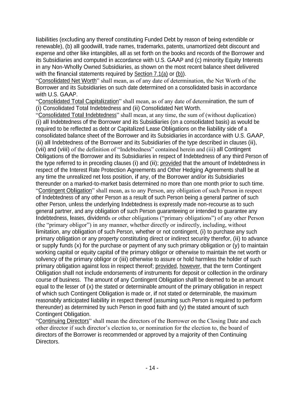 - 14 - liabilities (excluding any thereof constituting Funded Debt by reason of being extendible or renewable), (b) all goodwill, trade names, trademarks, patents, unamortized debt discount and expense and other like intangibles, all as set forth on the books and records of the Borrower and its Subsidiaries and computed in accordance with U.S. GAAP and (c) minority Equity Interests in any Non-Wholly Owned Subsidiaries, as shown on the most recent balance sheet delivered with the financial statements required by Section 7.1(a) or (b)). “Consolidated Net Worth” shall mean, as of any date of determination, the Net Worth of the Borrower and its Subsidiaries on such date determined on a consolidated basis in accordance with U.S. GAAP. “Consolidated Total Capitalization” shall mean, as of any date of determination, the sum of (i) Consolidated Total Indebtedness and (ii) Consolidated Net Worth. “Consolidated Total Indebtedness” shall mean, at any time, the sum of (without duplication) (i) all Indebtedness of the Borrower and its Subsidiaries (on a consolidated basis) as would be required to be reflected as debt or Capitalized Lease Obligations on the liability side of a consolidated balance sheet of the Borrower and its Subsidiaries in accordance with U.S. GAAP, (ii) all Indebtedness of the Borrower and its Subsidiaries of the type described in clauses (ii), (vii) and (viii) of the definition of “Indebtedness” contained herein and (iii) all Contingent Obligations of the Borrower and its Subsidiaries in respect of Indebtedness of any third Person of the type referred to in preceding clauses (i) and (ii); provided that the amount of Indebtedness in respect of the Interest Rate Protection Agreements and Other Hedging Agreements shall be at any time the unrealized net loss position, if any, of the Borrower and/or its Subsidiaries thereunder on a marked-to-market basis determined no more than one month prior to such time. “Contingent Obligation” shall mean, as to any Person, any obligation of such Person in respect of Indebtedness of any other Person as a result of such Person being a general partner of such other Person, unless the underlying Indebtedness is expressly made non-recourse as to such general partner, and any obligation of such Person guaranteeing or intended to guarantee any Indebtedness, leases, dividends or other obligations (“primary obligations”) of any other Person (the “primary obligor”) in any manner, whether directly or indirectly, including, without limitation, any obligation of such Person, whether or not contingent, (i) to purchase any such primary obligation or any property constituting direct or indirect security therefor, (ii) to advance or supply funds (x) for the purchase or payment of any such primary obligation or (y) to maintain working capital or equity capital of the primary obligor or otherwise to maintain the net worth or solvency of the primary obligor or (iii) otherwise to assure or hold harmless the holder of such primary obligation against loss in respect thereof; provided, however, that the term Contingent Obligation shall not include endorsements of instruments for deposit or collection in the ordinary course of business. The amount of any Contingent Obligation shall be deemed to be an amount equal to the lesser of (x) the stated or determinable amount of the primary obligation in respect of which such Contingent Obligation is made or, if not stated or determinable, the maximum reasonably anticipated liability in respect thereof (assuming such Person is required to perform thereunder) as determined by such Person in good faith and (y) the stated amount of such Contingent Obligation. “Continuing Directors” shall mean the directors of the Borrower on the Closing Date and each other director if such director’s election to, or nomination for the election to, the board of directors of the Borrower is recommended or approved by a majority of then Continuing Directors.