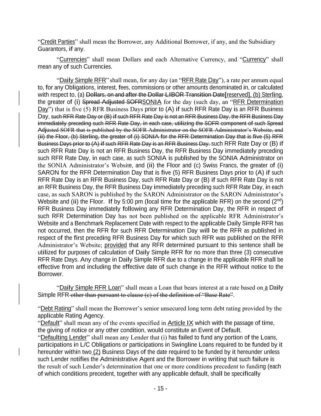 - 15 - “Credit Parties” shall mean the Borrower, any Additional Borrower, if any, and the Subsidiary Guarantors, if any. “Currencies” shall mean Dollars and each Alternative Currency, and “Currency” shall mean any of such Currencies. “Daily Simple RFR” shall mean, for any day (an “RFR Rate Day”), a rate per annum equal to, for any Obligations, interest, fees, commissions or other amounts denominated in, or calculated with respect to, (a) Dollars, on and after the Dollar LIBOR Transition Date[reserved], (b) Sterling, the greater of (i) Spread Adjusted SOFRSONIA for the day (such day, an “RFR Determination Day”) that is five (5) RFR Business Days prior to (A) if such RFR Rate Day is an RFR Business Day, such RFR Rate Day or (B) if such RFR Rate Day is not an RFR Business Day, the RFR Business Day immediately preceding such RFR Rate Day, in each case, utilizing the SOFR component of such Spread Adjusted SOFR that is published by the SOFR Administrator on the SOFR Administrator’s Website, and (ii) the Floor, (b) Sterling, the greater of (i) SONIA for the RFR Determination Day that is five (5) RFR Business Days prior to (A) if such RFR Rate Day is an RFR Business Day, such RFR Rate Day or (B) if such RFR Rate Day is not an RFR Business Day, the RFR Business Day immediately preceding such RFR Rate Day, in each case, as such SONIA is published by the SONIA Administrator on the SONIA Administrator’s Website, and (ii) the Floor and (c) Swiss Francs, the greater of (i) SARON for the RFR Determination Day that is five (5) RFR Business Days prior to (A) if such RFR Rate Day is an RFR Business Day, such RFR Rate Day or (B) if such RFR Rate Day is not an RFR Business Day, the RFR Business Day immediately preceding such RFR Rate Day, in each case, as such SARON is published by the SARON Administrator on the SARON Administrator’s Website and (ii) the Floor. If by 5:00 pm (local time for the applicable RFR) on the second (2nd) RFR Business Day immediately following any RFR Determination Day, the RFR in respect of such RFR Determination Day has not been published on the applicable RFR Administrator’s Website and a Benchmark Replacement Date with respect to the applicable Daily Simple RFR has not occurred, then the RFR for such RFR Determination Day will be the RFR as published in respect of the first preceding RFR Business Day for which such RFR was published on the RFR Administrator’s Website; provided that any RFR determined pursuant to this sentence shall be utilized for purposes of calculation of Daily Simple RFR for no more than three (3) consecutive RFR Rate Days. Any change in Daily Simple RFR due to a change in the applicable RFR shall be effective from and including the effective date of such change in the RFR without notice to the Borrower. “Daily Simple RFR Loan” shall mean a Loan that bears interest at a rate based on a Daily Simple RFR other than pursuant to clause (c) of the definition of “Base Rate”. “Debt Rating” shall mean the Borrower’s senior unsecured long term debt rating provided by the applicable Rating Agency. “Default” shall mean any of the events specified in Article IX which with the passage of time, the giving of notice or any other condition, would constitute an Event of Default. “Defaulting Lender” shall mean any Lender that (i) has failed to fund any portion of the Loans, participations in L/C Obligations or participations in Swingline Loans required to be funded by it hereunder within two (2) Business Days of the date required to be funded by it hereunder unless such Lender notifies the Administrative Agent and the Borrower in writing that such failure is the result of such Lender’s determination that one or more conditions precedent to funding (each of which conditions precedent, together with any applicable default, shall be specifically