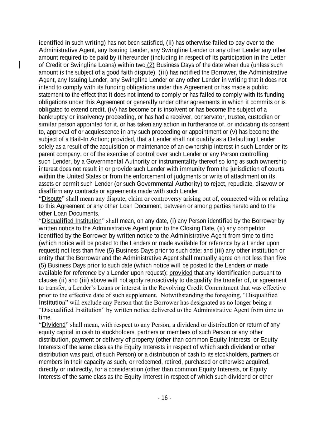 - 16 - identified in such writing) has not been satisfied, (ii) has otherwise failed to pay over to the Administrative Agent, any Issuing Lender, any Swingline Lender or any other Lender any other amount required to be paid by it hereunder (including in respect of its participation in the Letter of Credit or Swingline Loans) within two (2) Business Days of the date when due (unless such amount is the subject of a good faith dispute), (iii) has notified the Borrower, the Administrative Agent, any Issuing Lender, any Swingline Lender or any other Lender in writing that it does not intend to comply with its funding obligations under this Agreement or has made a public statement to the effect that it does not intend to comply or has failed to comply with its funding obligations under this Agreement or generally under other agreements in which it commits or is obligated to extend credit, (iv) has become or is insolvent or has become the subject of a bankruptcy or insolvency proceeding, or has had a receiver, conservator, trustee, custodian or similar person appointed for it, or has taken any action in furtherance of, or indicating its consent to, approval of or acquiescence in any such proceeding or appointment or (v) has become the subject of a Bail-In Action; provided, that a Lender shall not qualify as a Defaulting Lender solely as a result of the acquisition or maintenance of an ownership interest in such Lender or its parent company, or of the exercise of control over such Lender or any Person controlling such Lender, by a Governmental Authority or instrumentality thereof so long as such ownership interest does not result in or provide such Lender with immunity from the jurisdiction of courts within the United States or from the enforcement of judgments or writs of attachment on its assets or permit such Lender (or such Governmental Authority) to reject, repudiate, disavow or disaffirm any contracts or agreements made with such Lender. “Dispute” shall mean any dispute, claim or controversy arising out of, connected with or relating to this Agreement or any other Loan Document, between or among parties hereto and to the other Loan Documents. “Disqualified Institution” shall mean, on any date, (i) any Person identified by the Borrower by written notice to the Administrative Agent prior to the Closing Date, (ii) any competitor identified by the Borrower by written notice to the Administrative Agent from time to time (which notice will be posted to the Lenders or made available for reference by a Lender upon request) not less than five (5) Business Days prior to such date; and (iii) any other institution or entity that the Borrower and the Administrative Agent shall mutually agree on not less than five (5) Business Days prior to such date (which notice will be posted to the Lenders or made available for reference by a Lender upon request); provided that any identification pursuant to clauses (ii) and (iii) above will not apply retroactively to disqualify the transfer of, or agreement to transfer, a Lender’s Loans or interest in the Revolving Credit Commitment that was effective prior to the effective date of such supplement. Notwithstanding the foregoing, “Disqualified Institution” will exclude any Person that the Borrower has designated as no longer being a “Disqualified Institution” by written notice delivered to the Administrative Agent from time to time. “Dividend” shall mean, with respect to any Person, a dividend or distribution or return of any equity capital in cash to stockholders, partners or members of such Person or any other distribution, payment or delivery of property (other than common Equity Interests, or Equity Interests of the same class as the Equity Interests in respect of which such dividend or other distribution was paid, of such Person) or a distribution of cash to its stockholders, partners or members in their capacity as such, or redeemed, retired, purchased or otherwise acquired, directly or indirectly, for a consideration (other than common Equity Interests, or Equity Interests of the same class as the Equity Interest in respect of which such dividend or other