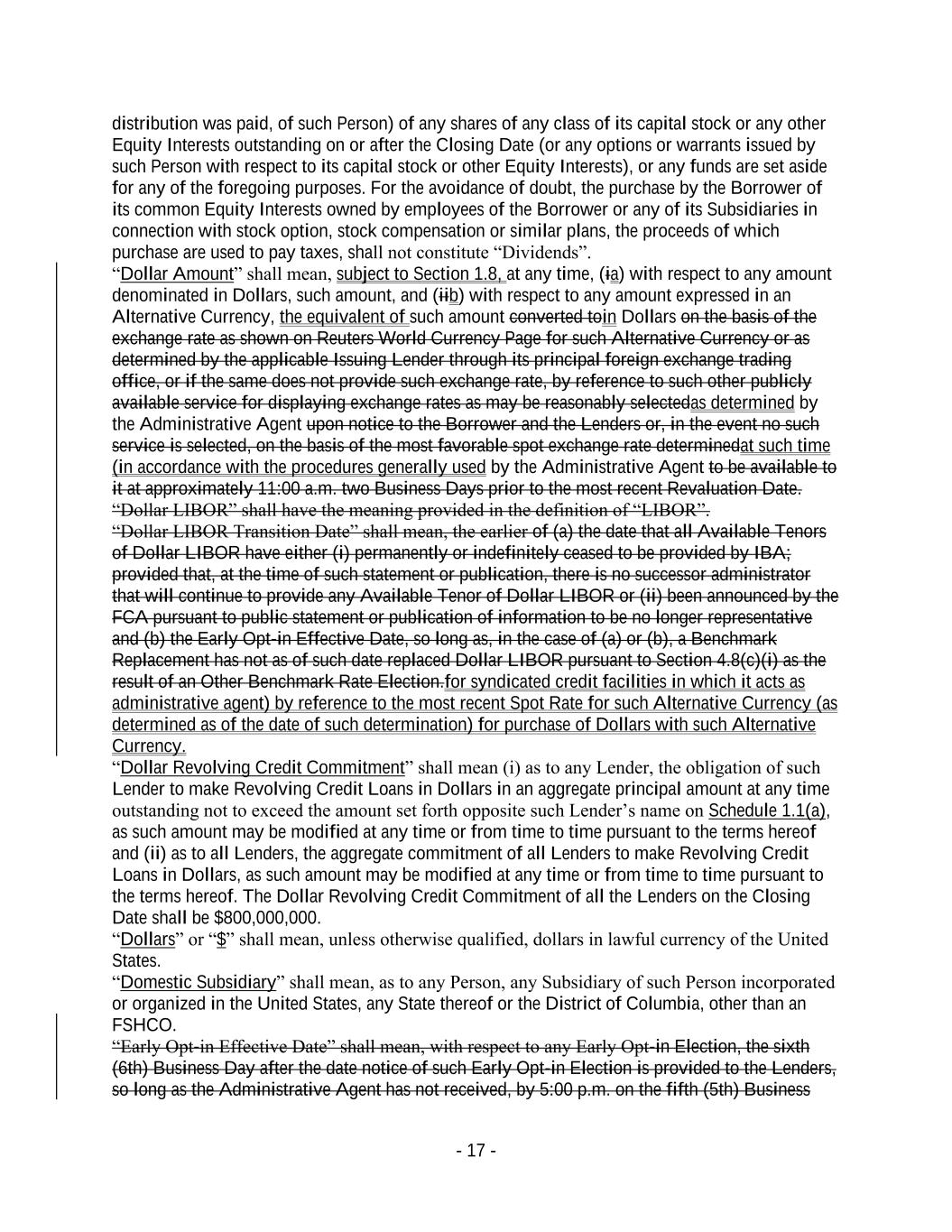 - 17 - distribution was paid, of such Person) of any shares of any class of its capital stock or any other Equity Interests outstanding on or after the Closing Date (or any options or warrants issued by such Person with respect to its capital stock or other Equity Interests), or any funds are set aside for any of the foregoing purposes. For the avoidance of doubt, the purchase by the Borrower of its common Equity Interests owned by employees of the Borrower or any of its Subsidiaries in connection with stock option, stock compensation or similar plans, the proceeds of which purchase are used to pay taxes, shall not constitute “Dividends”. “Dollar Amount” shall mean, subject to Section 1.8, at any time, (ia) with respect to any amount denominated in Dollars, such amount, and (iib) with respect to any amount expressed in an Alternative Currency, the equivalent of such amount converted toin Dollars on the basis of the exchange rate as shown on Reuters World Currency Page for such Alternative Currency or as determined by the applicable Issuing Lender through its principal foreign exchange trading office, or if the same does not provide such exchange rate, by reference to such other publicly available service for displaying exchange rates as may be reasonably selectedas determined by the Administrative Agent upon notice to the Borrower and the Lenders or, in the event no such service is selected, on the basis of the most favorable spot exchange rate determinedat such time (in accordance with the procedures generally used by the Administrative Agent to be available to it at approximately 11:00 a.m. two Business Days prior to the most recent Revaluation Date. “Dollar LIBOR” shall have the meaning provided in the definition of “LIBOR”. “Dollar LIBOR Transition Date” shall mean, the earlier of (a) the date that all Available Tenors of Dollar LIBOR have either (i) permanently or indefinitely ceased to be provided by IBA; provided that, at the time of such statement or publication, there is no successor administrator that will continue to provide any Available Tenor of Dollar LIBOR or (ii) been announced by the FCA pursuant to public statement or publication of information to be no longer representative and (b) the Early Opt-in Effective Date, so long as, in the case of (a) or (b), a Benchmark Replacement has not as of such date replaced Dollar LIBOR pursuant to Section 4.8(c)(i) as the result of an Other Benchmark Rate Election.for syndicated credit facilities in which it acts as administrative agent) by reference to the most recent Spot Rate for such Alternative Currency (as determined as of the date of such determination) for purchase of Dollars with such Alternative Currency. “Dollar Revolving Credit Commitment” shall mean (i) as to any Lender, the obligation of such Lender to make Revolving Credit Loans in Dollars in an aggregate principal amount at any time outstanding not to exceed the amount set forth opposite such Lender’s name on Schedule 1.1(a), as such amount may be modified at any time or from time to time pursuant to the terms hereof and (ii) as to all Lenders, the aggregate commitment of all Lenders to make Revolving Credit Loans in Dollars, as such amount may be modified at any time or from time to time pursuant to the terms hereof. The Dollar Revolving Credit Commitment of all the Lenders on the Closing Date shall be $800,000,000. “Dollars” or “$” shall mean, unless otherwise qualified, dollars in lawful currency of the United States. “Domestic Subsidiary” shall mean, as to any Person, any Subsidiary of such Person incorporated or organized in the United States, any State thereof or the District of Columbia, other than an FSHCO. “Early Opt-in Effective Date” shall mean, with respect to any Early Opt-in Election, the sixth (6th) Business Day after the date notice of such Early Opt-in Election is provided to the Lenders, so long as the Administrative Agent has not received, by 5:00 p.m. on the fifth (5th) Business