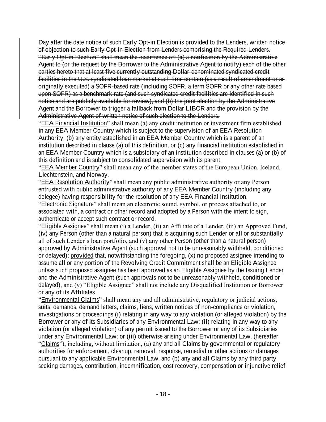 - 18 - Day after the date notice of such Early Opt-in Election is provided to the Lenders, written notice of objection to such Early Opt-in Election from Lenders comprising the Required Lenders. “Early Opt-in Election” shall mean the occurrence of: (a) a notification by the Administrative Agent to (or the request by the Borrower to the Administrative Agent to notify) each of the other parties hereto that at least five currently outstanding Dollar-denominated syndicated credit facilities in the U.S. syndicated loan market at such time contain (as a result of amendment or as originally executed) a SOFR-based rate (including SOFR, a term SOFR or any other rate based upon SOFR) as a benchmark rate (and such syndicated credit facilities are identified in such notice and are publicly available for review), and (b) the joint election by the Administrative Agent and the Borrower to trigger a fallback from Dollar LIBOR and the provision by the Administrative Agent of written notice of such election to the Lenders. “EEA Financial Institution” shall mean (a) any credit institution or investment firm established in any EEA Member Country which is subject to the supervision of an EEA Resolution Authority, (b) any entity established in an EEA Member Country which is a parent of an institution described in clause (a) of this definition, or (c) any financial institution established in an EEA Member Country which is a subsidiary of an institution described in clauses (a) or (b) of this definition and is subject to consolidated supervision with its parent. “EEA Member Country” shall mean any of the member states of the European Union, Iceland, Liechtenstein, and Norway. “EEA Resolution Authority” shall mean any public administrative authority or any Person entrusted with public administrative authority of any EEA Member Country (including any delegee) having responsibility for the resolution of any EEA Financial Institution. “Electronic Signature” shall mean an electronic sound, symbol, or process attached to, or associated with, a contract or other record and adopted by a Person with the intent to sign, authenticate or accept such contract or record. “Eligible Assignee” shall mean (i) a Lender, (ii) an Affiliate of a Lender, (iii) an Approved Fund, (iv) any Person (other than a natural person) that is acquiring such Lender or all or substantially all of such Lender’s loan portfolio, and (v) any other Person (other than a natural person) approved by Administrative Agent (such approval not to be unreasonably withheld, conditioned or delayed); provided that, notwithstanding the foregoing, (x) no proposed assignee intending to assume all or any portion of the Revolving Credit Commitment shall be an Eligible Assignee unless such proposed assignee has been approved as an Eligible Assignee by the Issuing Lender and the Administrative Agent (such approvals not to be unreasonably withheld, conditioned or delayed), and (y) “Eligible Assignee” shall not include any Disqualified Institution or Borrower or any of its Affiliates . “Environmental Claims” shall mean any and all administrative, regulatory or judicial actions, suits, demands, demand letters, claims, liens, written notices of non-compliance or violation, investigations or proceedings (i) relating in any way to any violation (or alleged violation) by the Borrower or any of its Subsidiaries of any Environmental Law; (ii) relating in any way to any violation (or alleged violation) of any permit issued to the Borrower or any of its Subsidiaries under any Environmental Law; or (iii) otherwise arising under Environmental Law, (hereafter “Claims”), including, without limitation, (a) any and all Claims by governmental or regulatory authorities for enforcement, cleanup, removal, response, remedial or other actions or damages pursuant to any applicable Environmental Law, and (b) any and all Claims by any third party seeking damages, contribution, indemnification, cost recovery, compensation or injunctive relief