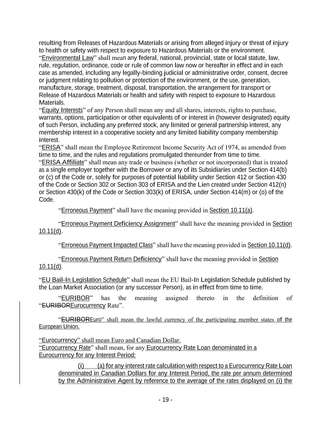 - 19 - resulting from Releases of Hazardous Materials or arising from alleged injury or threat of injury to health or safety with respect to exposure to Hazardous Materials or the environment. “Environmental Law” shall mean any federal, national, provincial, state or local statute, law, rule, regulation, ordinance, code or rule of common law now or hereafter in effect and in each case as amended, including any legally-binding judicial or administrative order, consent, decree or judgment relating to pollution or protection of the environment, or the use, generation, manufacture, storage, treatment, disposal, transportation, the arrangement for transport or Release of Hazardous Materials or health and safety with respect to exposure to Hazardous Materials. “Equity Interests” of any Person shall mean any and all shares, interests, rights to purchase, warrants, options, participation or other equivalents of or interest in (however designated) equity of such Person, including any preferred stock, any limited or general partnership interest, any membership interest in a cooperative society and any limited liability company membership interest. “ERISA” shall mean the Employee Retirement Income Security Act of 1974, as amended from time to time, and the rules and regulations promulgated thereunder from time to time. “ERISA Affiliate” shall mean any trade or business (whether or not incorporated) that is treated as a single employer together with the Borrower or any of its Subsidiaries under Section 414(b) or (c) of the Code or, solely for purposes of potential liability under Section 412 or Section 430 of the Code or Section 302 or Section 303 of ERISA and the Lien created under Section 412(n) or Section 430(k) of the Code or Section 303(k) of ERISA, under Section 414(m) or (o) of the Code. “Erroneous Payment” shall have the meaning provided in Section 10.11(a). “Erroneous Payment Deficiency Assignment” shall have the meaning provided in Section 10.11(d). “Erroneous Payment Impacted Class” shall have the meaning provided in Section 10.11(d). “Erroneous Payment Return Deficiency” shall have the meaning provided in Section 10.11(d). “EU Bail-In Legislation Schedule” shall mean the EU Bail-In Legislation Schedule published by the Loan Market Association (or any successor Person), as in effect from time to time. “EURIBOR” has the meaning assigned thereto in the definition of “EURIBOREurocurrency Rate”. “EURIBOREuro” shall mean the lawful currency of the participating member states of the European Union. “Eurocurrency” shall mean Euro and Canadian Dollar. “Eurocurrency Rate” shall mean, for any Eurocurrency Rate Loan denominated in a Eurocurrency for any Interest Period: (i) (a) for any interest rate calculation with respect to a Eurocurrency Rate Loan denominated in Canadian Dollars for any Interest Period, the rate per annum determined by the Administrative Agent by reference to the average of the rates displayed on (i) the