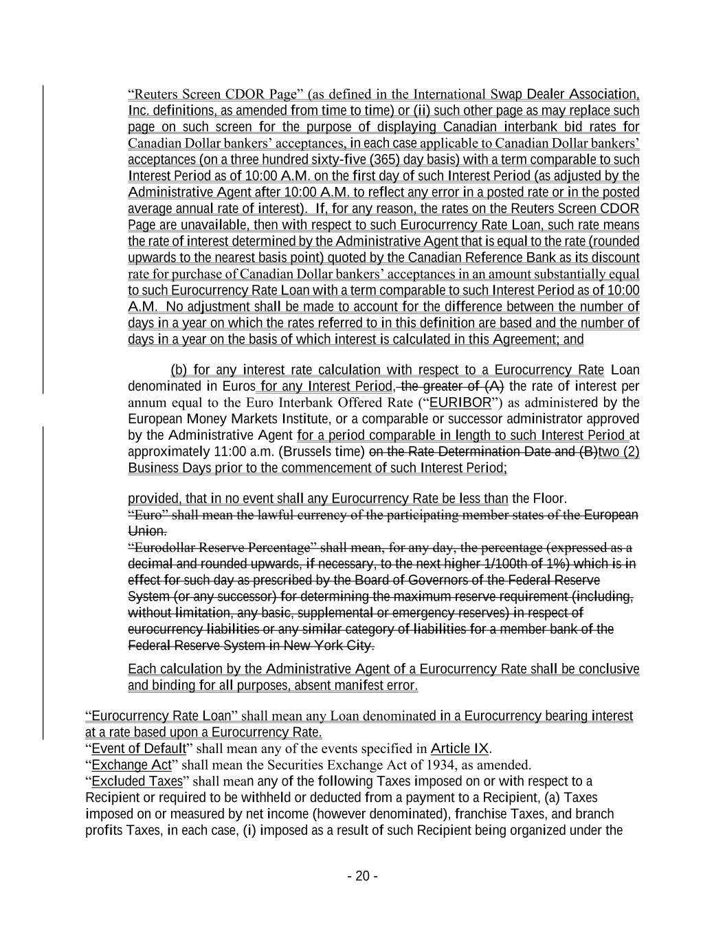 - 20 - “Reuters Screen CDOR Page” (as defined in the International Swap Dealer Association, Inc. definitions, as amended from time to time) or (ii) such other page as may replace such page on such screen for the purpose of displaying Canadian interbank bid rates for Canadian Dollar bankers’ acceptances, in each case applicable to Canadian Dollar bankers’ acceptances (on a three hundred sixty-five (365) day basis) with a term comparable to such Interest Period as of 10:00 A.M. on the first day of such Interest Period (as adjusted by the Administrative Agent after 10:00 A.M. to reflect any error in a posted rate or in the posted average annual rate of interest). If, for any reason, the rates on the Reuters Screen CDOR Page are unavailable, then with respect to such Eurocurrency Rate Loan, such rate means the rate of interest determined by the Administrative Agent that is equal to the rate (rounded upwards to the nearest basis point) quoted by the Canadian Reference Bank as its discount rate for purchase of Canadian Dollar bankers’ acceptances in an amount substantially equal to such Eurocurrency Rate Loan with a term comparable to such Interest Period as of 10:00 A.M. No adjustment shall be made to account for the difference between the number of days in a year on which the rates referred to in this definition are based and the number of days in a year on the basis of which interest is calculated in this Agreement; and (b) for any interest rate calculation with respect to a Eurocurrency Rate Loan denominated in Euros for any Interest Period, the greater of (A) the rate of interest per annum equal to the Euro Interbank Offered Rate (“EURIBOR”) as administered by the European Money Markets Institute, or a comparable or successor administrator approved by the Administrative Agent for a period comparable in length to such Interest Period at approximately 11:00 a.m. (Brussels time) on the Rate Determination Date and (B)two (2) Business Days prior to the commencement of such Interest Period; provided, that in no event shall any Eurocurrency Rate be less than the Floor. “Euro” shall mean the lawful currency of the participating member states of the European Union. “Eurodollar Reserve Percentage” shall mean, for any day, the percentage (expressed as a decimal and rounded upwards, if necessary, to the next higher 1/100th of 1%) which is in effect for such day as prescribed by the Board of Governors of the Federal Reserve System (or any successor) for determining the maximum reserve requirement (including, without limitation, any basic, supplemental or emergency reserves) in respect of eurocurrency liabilities or any similar category of liabilities for a member bank of the Federal Reserve System in New York City. Each calculation by the Administrative Agent of a Eurocurrency Rate shall be conclusive and binding for all purposes, absent manifest error. “Eurocurrency Rate Loan” shall mean any Loan denominated in a Eurocurrency bearing interest at a rate based upon a Eurocurrency Rate. “Event of Default” shall mean any of the events specified in Article IX. “Exchange Act” shall mean the Securities Exchange Act of 1934, as amended. “Excluded Taxes” shall mean any of the following Taxes imposed on or with respect to a Recipient or required to be withheld or deducted from a payment to a Recipient, (a) Taxes imposed on or measured by net income (however denominated), franchise Taxes, and branch profits Taxes, in each case, (i) imposed as a result of such Recipient being organized under the