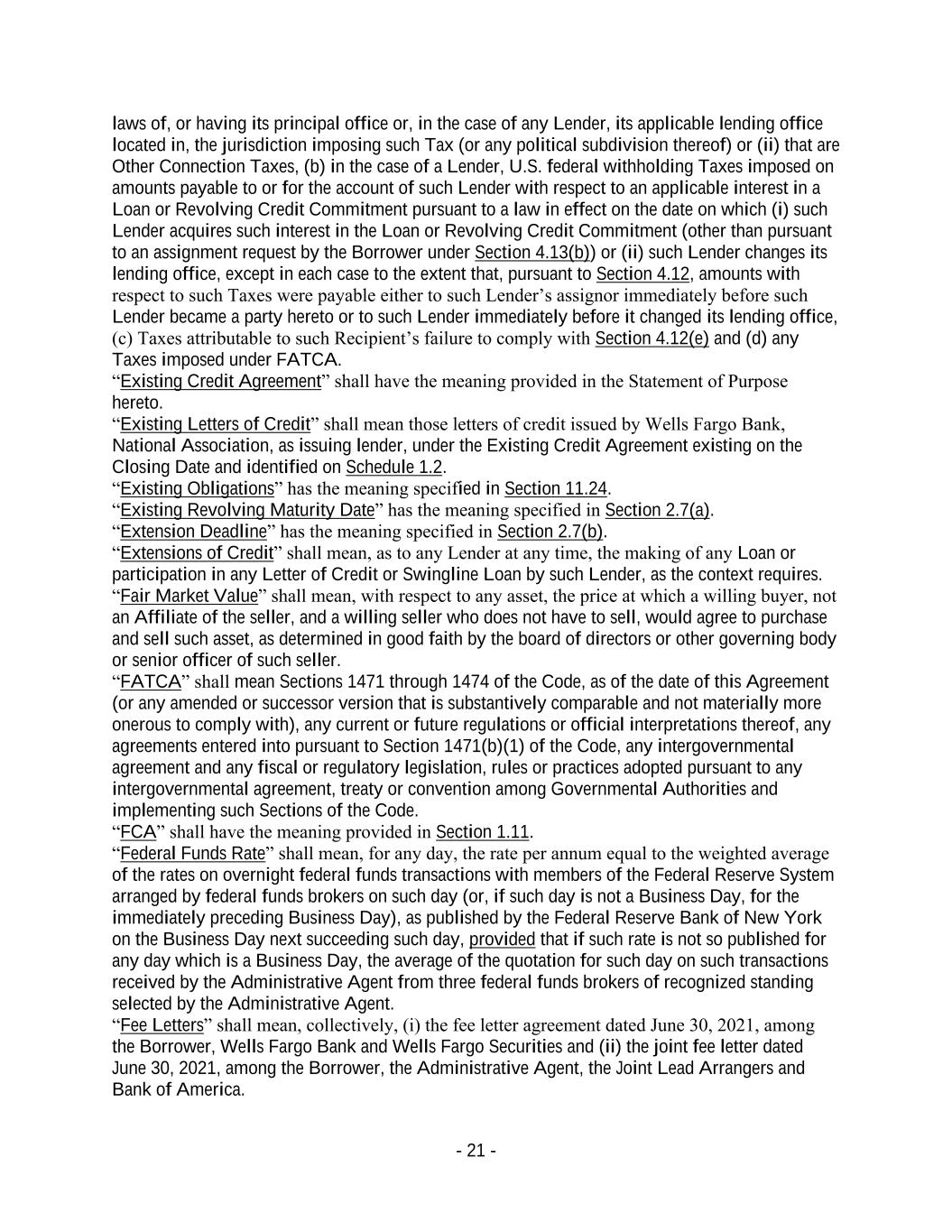 - 21 - laws of, or having its principal office or, in the case of any Lender, its applicable lending office located in, the jurisdiction imposing such Tax (or any political subdivision thereof) or (ii) that are Other Connection Taxes, (b) in the case of a Lender, U.S. federal withholding Taxes imposed on amounts payable to or for the account of such Lender with respect to an applicable interest in a Loan or Revolving Credit Commitment pursuant to a law in effect on the date on which (i) such Lender acquires such interest in the Loan or Revolving Credit Commitment (other than pursuant to an assignment request by the Borrower under Section 4.13(b)) or (ii) such Lender changes its lending office, except in each case to the extent that, pursuant to Section 4.12, amounts with respect to such Taxes were payable either to such Lender’s assignor immediately before such Lender became a party hereto or to such Lender immediately before it changed its lending office, (c) Taxes attributable to such Recipient’s failure to comply with Section 4.12(e) and (d) any Taxes imposed under FATCA. “Existing Credit Agreement” shall have the meaning provided in the Statement of Purpose hereto. “Existing Letters of Credit” shall mean those letters of credit issued by Wells Fargo Bank, National Association, as issuing lender, under the Existing Credit Agreement existing on the Closing Date and identified on Schedule 1.2. “Existing Obligations” has the meaning specified in Section 11.24. “Existing Revolving Maturity Date” has the meaning specified in Section 2.7(a). “Extension Deadline” has the meaning specified in Section 2.7(b). “Extensions of Credit” shall mean, as to any Lender at any time, the making of any Loan or participation in any Letter of Credit or Swingline Loan by such Lender, as the context requires. “Fair Market Value” shall mean, with respect to any asset, the price at which a willing buyer, not an Affiliate of the seller, and a willing seller who does not have to sell, would agree to purchase and sell such asset, as determined in good faith by the board of directors or other governing body or senior officer of such seller. “FATCA” shall mean Sections 1471 through 1474 of the Code, as of the date of this Agreement (or any amended or successor version that is substantively comparable and not materially more onerous to comply with), any current or future regulations or official interpretations thereof, any agreements entered into pursuant to Section 1471(b)(1) of the Code, any intergovernmental agreement and any fiscal or regulatory legislation, rules or practices adopted pursuant to any intergovernmental agreement, treaty or convention among Governmental Authorities and implementing such Sections of the Code. “FCA” shall have the meaning provided in Section 1.11. “Federal Funds Rate” shall mean, for any day, the rate per annum equal to the weighted average of the rates on overnight federal funds transactions with members of the Federal Reserve System arranged by federal funds brokers on such day (or, if such day is not a Business Day, for the immediately preceding Business Day), as published by the Federal Reserve Bank of New York on the Business Day next succeeding such day, provided that if such rate is not so published for any day which is a Business Day, the average of the quotation for such day on such transactions received by the Administrative Agent from three federal funds brokers of recognized standing selected by the Administrative Agent. “Fee Letters” shall mean, collectively, (i) the fee letter agreement dated June 30, 2021, among the Borrower, Wells Fargo Bank and Wells Fargo Securities and (ii) the joint fee letter dated June 30, 2021, among the Borrower, the Administrative Agent, the Joint Lead Arrangers and Bank of America.
