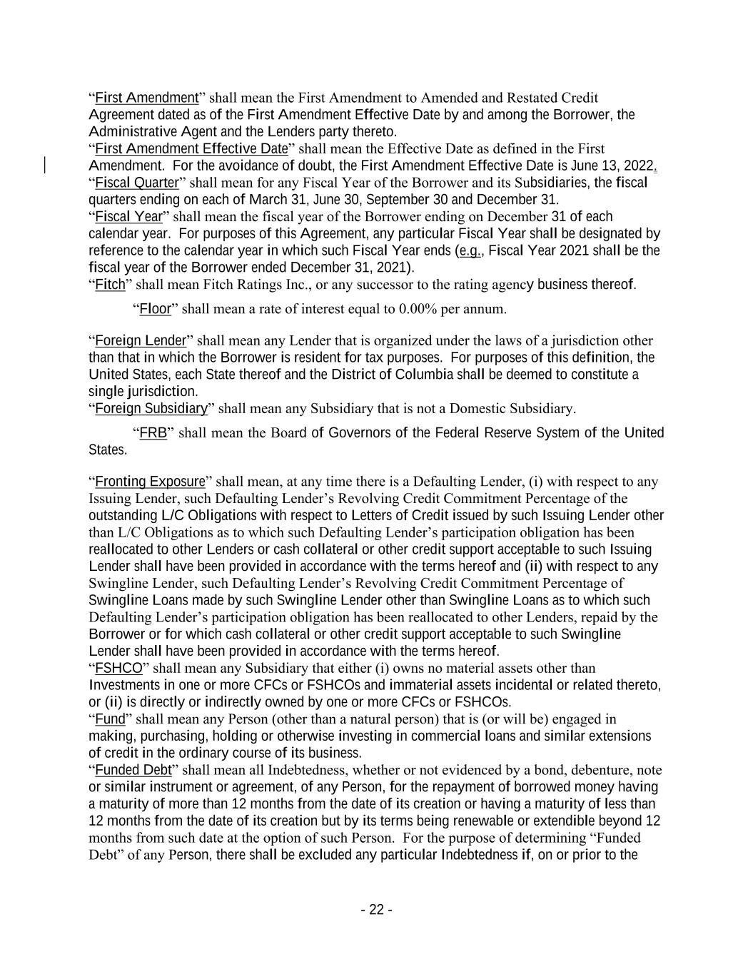 - 22 - “First Amendment” shall mean the First Amendment to Amended and Restated Credit Agreement dated as of the First Amendment Effective Date by and among the Borrower, the Administrative Agent and the Lenders party thereto. “First Amendment Effective Date” shall mean the Effective Date as defined in the First Amendment. For the avoidance of doubt, the First Amendment Effective Date is June 13, 2022. “Fiscal Quarter” shall mean for any Fiscal Year of the Borrower and its Subsidiaries, the fiscal quarters ending on each of March 31, June 30, September 30 and December 31. “Fiscal Year” shall mean the fiscal year of the Borrower ending on December 31 of each calendar year. For purposes of this Agreement, any particular Fiscal Year shall be designated by reference to the calendar year in which such Fiscal Year ends (e.g., Fiscal Year 2021 shall be the fiscal year of the Borrower ended December 31, 2021). “Fitch” shall mean Fitch Ratings Inc., or any successor to the rating agency business thereof. “Floor” shall mean a rate of interest equal to 0.00% per annum. “Foreign Lender” shall mean any Lender that is organized under the laws of a jurisdiction other than that in which the Borrower is resident for tax purposes. For purposes of this definition, the United States, each State thereof and the District of Columbia shall be deemed to constitute a single jurisdiction. “Foreign Subsidiary” shall mean any Subsidiary that is not a Domestic Subsidiary. “FRB” shall mean the Board of Governors of the Federal Reserve System of the United States. “Fronting Exposure” shall mean, at any time there is a Defaulting Lender, (i) with respect to any Issuing Lender, such Defaulting Lender’s Revolving Credit Commitment Percentage of the outstanding L/C Obligations with respect to Letters of Credit issued by such Issuing Lender other than L/C Obligations as to which such Defaulting Lender’s participation obligation has been reallocated to other Lenders or cash collateral or other credit support acceptable to such Issuing Lender shall have been provided in accordance with the terms hereof and (ii) with respect to any Swingline Lender, such Defaulting Lender’s Revolving Credit Commitment Percentage of Swingline Loans made by such Swingline Lender other than Swingline Loans as to which such Defaulting Lender’s participation obligation has been reallocated to other Lenders, repaid by the Borrower or for which cash collateral or other credit support acceptable to such Swingline Lender shall have been provided in accordance with the terms hereof. “FSHCO” shall mean any Subsidiary that either (i) owns no material assets other than Investments in one or more CFCs or FSHCOs and immaterial assets incidental or related thereto, or (ii) is directly or indirectly owned by one or more CFCs or FSHCOs. “Fund” shall mean any Person (other than a natural person) that is (or will be) engaged in making, purchasing, holding or otherwise investing in commercial loans and similar extensions of credit in the ordinary course of its business. “Funded Debt” shall mean all Indebtedness, whether or not evidenced by a bond, debenture, note or similar instrument or agreement, of any Person, for the repayment of borrowed money having a maturity of more than 12 months from the date of its creation or having a maturity of less than 12 months from the date of its creation but by its terms being renewable or extendible beyond 12 months from such date at the option of such Person. For the purpose of determining “Funded Debt” of any Person, there shall be excluded any particular Indebtedness if, on or prior to the