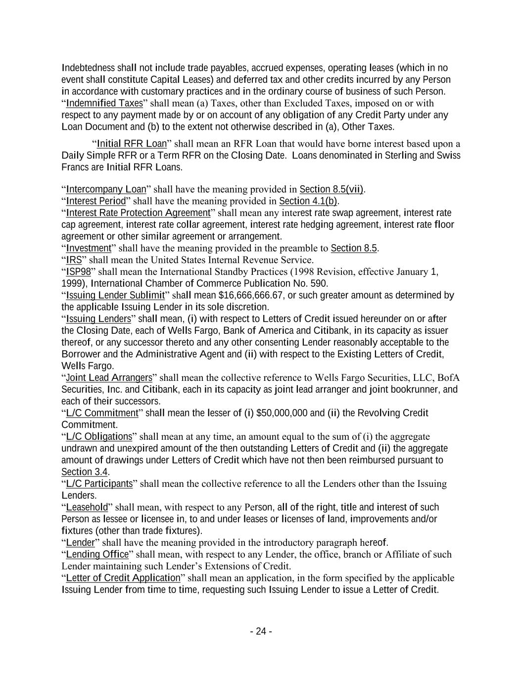 - 24 - Indebtedness shall not include trade payables, accrued expenses, operating leases (which in no event shall constitute Capital Leases) and deferred tax and other credits incurred by any Person in accordance with customary practices and in the ordinary course of business of such Person. “Indemnified Taxes” shall mean (a) Taxes, other than Excluded Taxes, imposed on or with respect to any payment made by or on account of any obligation of any Credit Party under any Loan Document and (b) to the extent not otherwise described in (a), Other Taxes. “Initial RFR Loan” shall mean an RFR Loan that would have borne interest based upon a Daily Simple RFR or a Term RFR on the Closing Date. Loans denominated in Sterling and Swiss Francs are Initial RFR Loans. “Intercompany Loan” shall have the meaning provided in Section 8.5(vii). “Interest Period” shall have the meaning provided in Section 4.1(b). “Interest Rate Protection Agreement” shall mean any interest rate swap agreement, interest rate cap agreement, interest rate collar agreement, interest rate hedging agreement, interest rate floor agreement or other similar agreement or arrangement. “Investment” shall have the meaning provided in the preamble to Section 8.5. “IRS” shall mean the United States Internal Revenue Service. “ISP98” shall mean the International Standby Practices (1998 Revision, effective January 1, 1999), International Chamber of Commerce Publication No. 590. “Issuing Lender Sublimit” shall mean $16,666,666.67, or such greater amount as determined by the applicable Issuing Lender in its sole discretion. “Issuing Lenders” shall mean, (i) with respect to Letters of Credit issued hereunder on or after the Closing Date, each of Wells Fargo, Bank of America and Citibank, in its capacity as issuer thereof, or any successor thereto and any other consenting Lender reasonably acceptable to the Borrower and the Administrative Agent and (ii) with respect to the Existing Letters of Credit, Wells Fargo. “Joint Lead Arrangers” shall mean the collective reference to Wells Fargo Securities, LLC, BofA Securities, Inc. and Citibank, each in its capacity as joint lead arranger and joint bookrunner, and each of their successors. “L/C Commitment” shall mean the lesser of (i) $50,000,000 and (ii) the Revolving Credit Commitment. “L/C Obligations” shall mean at any time, an amount equal to the sum of (i) the aggregate undrawn and unexpired amount of the then outstanding Letters of Credit and (ii) the aggregate amount of drawings under Letters of Credit which have not then been reimbursed pursuant to Section 3.4. “L/C Participants” shall mean the collective reference to all the Lenders other than the Issuing Lenders. “Leasehold” shall mean, with respect to any Person, all of the right, title and interest of such Person as lessee or licensee in, to and under leases or licenses of land, improvements and/or fixtures (other than trade fixtures). “Lender” shall have the meaning provided in the introductory paragraph hereof. “Lending Office” shall mean, with respect to any Lender, the office, branch or Affiliate of such Lender maintaining such Lender’s Extensions of Credit. “Letter of Credit Application” shall mean an application, in the form specified by the applicable Issuing Lender from time to time, requesting such Issuing Lender to issue a Letter of Credit.