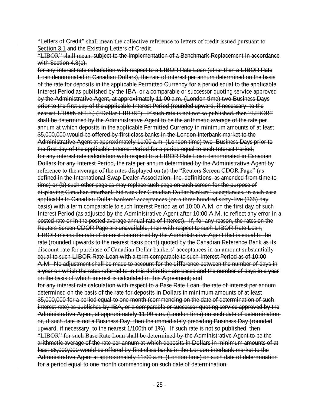- 25 - “Letters of Credit” shall mean the collective reference to letters of credit issued pursuant to Section 3.1 and the Existing Letters of Credit. “LIBOR” shall mean, subject to the implementation of a Benchmark Replacement in accordance with Section 4.8(c), for any interest rate calculation with respect to a LIBOR Rate Loan (other than a LIBOR Rate Loan denominated in Canadian Dollars), the rate of interest per annum determined on the basis of the rate for deposits in the applicable Permitted Currency for a period equal to the applicable Interest Period as published by the IBA, or a comparable or successor quoting service approved by the Administrative Agent, at approximately 11:00 a.m. (London time) two Business Days prior to the first day of the applicable Interest Period (rounded upward, if necessary, to the nearest 1/100th of 1%) (“Dollar LIBOR”). If such rate is not not so published, then “LIBOR” shall be determined by the Administrative Agent to be the arithmetic average of the rate per annum at which deposits in the applicable Permitted Currency in minimum amounts of at least $5,000,000 would be offered by first class banks in the London interbank market to the Administrative Agent at approximately 11:00 a.m. (London time) two Business Days prior to the first day of the applicable Interest Period for a period equal to such Interest Period; for any interest rate calculation with respect to a LIBOR Rate Loan denominated in Canadian Dollars for any Interest Period, the rate per annum determined by the Administrative Agent by reference to the average of the rates displayed on (a) the “Reuters Screen CDOR Page” (as defined in the International Swap Dealer Association, Inc. definitions, as amended from time to time) or (b) such other page as may replace such page on such screen for the purpose of displaying Canadian interbank bid rates for Canadian Dollar bankers’ acceptances, in each case applicable to Canadian Dollar bankers’ acceptances (on a three hundred sixty-five (365) day basis) with a term comparable to such Interest Period as of 10:00 A.M. on the first day of such Interest Period (as adjusted by the Administrative Agent after 10:00 A.M. to reflect any error in a posted rate or in the posted average annual rate of interest). If, for any reason, the rates on the Reuters Screen CDOR Page are unavailable, then with respect to such LIBOR Rate Loan, LIBOR means the rate of interest determined by the Administrative Agent that is equal to the rate (rounded upwards to the nearest basis point) quoted by the Canadian Reference Bank as its discount rate for purchase of Canadian Dollar bankers’ acceptances in an amount substantially equal to such LIBOR Rate Loan with a term comparable to such Interest Period as of 10:00 A.M. No adjustment shall be made to account for the difference between the number of days in a year on which the rates referred to in this definition are based and the number of days in a year on the basis of which interest is calculated in this Agreement; and for any interest rate calculation with respect to a Base Rate Loan, the rate of interest per annum determined on the basis of the rate for deposits in Dollars in minimum amounts of at least $5,000,000 for a period equal to one month (commencing on the date of determination of such interest rate) as published by IBA, or a comparable or successor quoting service approved by the Administrative Agent, at approximately 11:00 a.m. (London time) on such date of determination, or, if such date is not a Business Day, then the immediately preceding Business Day (rounded upward, if necessary, to the nearest 1/100th of 1%). If such rate is not so published, then “LIBOR” for such Base Rate Loan shall be determined by the Administrative Agent to be the arithmetic average of the rate per annum at which deposits in Dollars in minimum amounts of at least $5,000,000 would be offered by first class banks in the London interbank market to the Administrative Agent at approximately 11:00 a.m. (London time) on such date of determination for a period equal to one month commencing on such date of determination.
