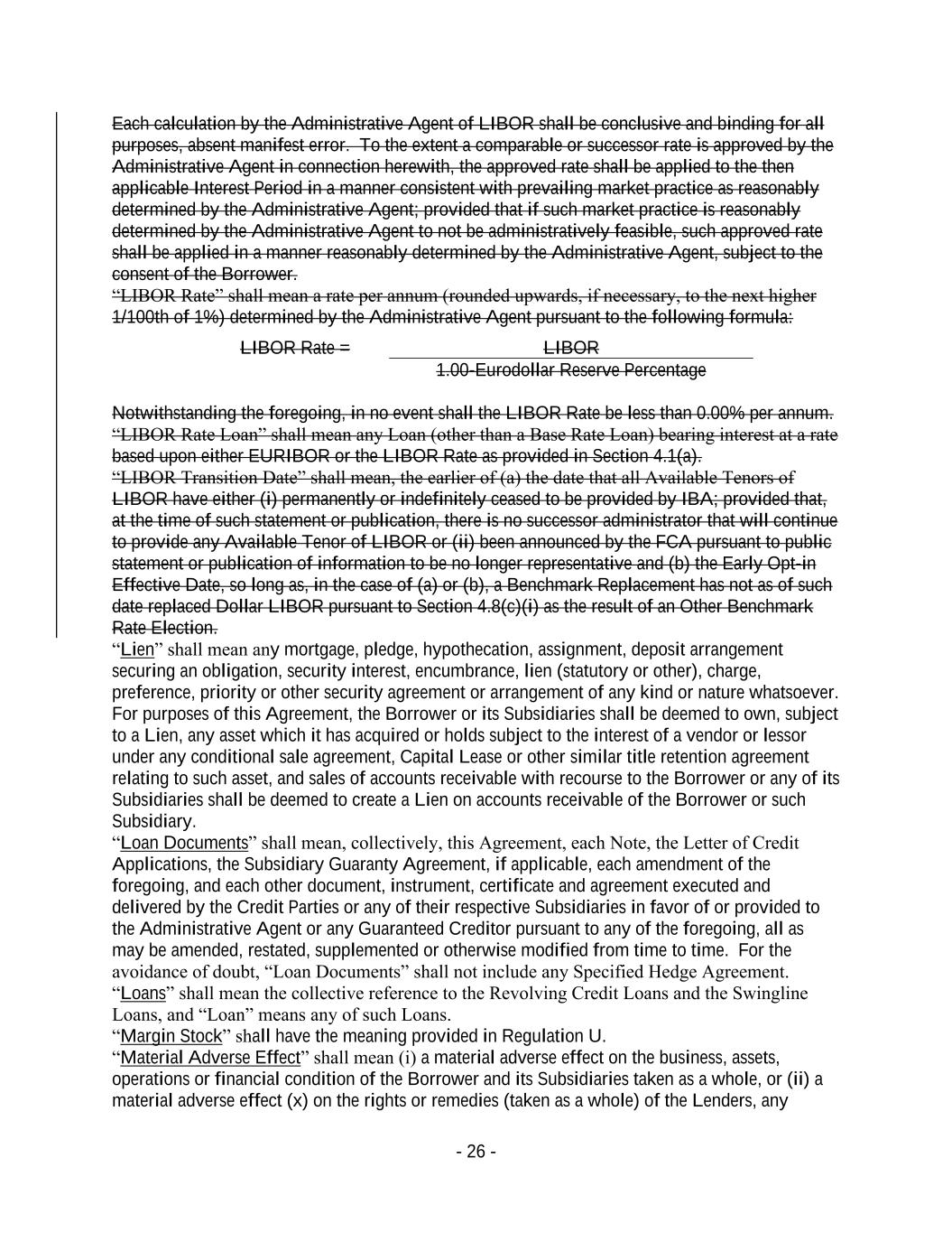 - 26 - Each calculation by the Administrative Agent of LIBOR shall be conclusive and binding for all purposes, absent manifest error. To the extent a comparable or successor rate is approved by the Administrative Agent in connection herewith, the approved rate shall be applied to the then applicable Interest Period in a manner consistent with prevailing market practice as reasonably determined by the Administrative Agent; provided that if such market practice is reasonably determined by the Administrative Agent to not be administratively feasible, such approved rate shall be applied in a manner reasonably determined by the Administrative Agent, subject to the consent of the Borrower. “LIBOR Rate” shall mean a rate per annum (rounded upwards, if necessary, to the next higher 1/100th of 1%) determined by the Administrative Agent pursuant to the following formula: LIBOR Rate = LIBOR 1.00-Eurodollar Reserve Percentage Notwithstanding the foregoing, in no event shall the LIBOR Rate be less than 0.00% per annum. “LIBOR Rate Loan” shall mean any Loan (other than a Base Rate Loan) bearing interest at a rate based upon either EURIBOR or the LIBOR Rate as provided in Section 4.1(a). “LIBOR Transition Date” shall mean, the earlier of (a) the date that all Available Tenors of LIBOR have either (i) permanently or indefinitely ceased to be provided by IBA; provided that, at the time of such statement or publication, there is no successor administrator that will continue to provide any Available Tenor of LIBOR or (ii) been announced by the FCA pursuant to public statement or publication of information to be no longer representative and (b) the Early Opt-in Effective Date, so long as, in the case of (a) or (b), a Benchmark Replacement has not as of such date replaced Dollar LIBOR pursuant to Section 4.8(c)(i) as the result of an Other Benchmark Rate Election. “Lien” shall mean any mortgage, pledge, hypothecation, assignment, deposit arrangement securing an obligation, security interest, encumbrance, lien (statutory or other), charge, preference, priority or other security agreement or arrangement of any kind or nature whatsoever. For purposes of this Agreement, the Borrower or its Subsidiaries shall be deemed to own, subject to a Lien, any asset which it has acquired or holds subject to the interest of a vendor or lessor under any conditional sale agreement, Capital Lease or other similar title retention agreement relating to such asset, and sales of accounts receivable with recourse to the Borrower or any of its Subsidiaries shall be deemed to create a Lien on accounts receivable of the Borrower or such Subsidiary. “Loan Documents” shall mean, collectively, this Agreement, each Note, the Letter of Credit Applications, the Subsidiary Guaranty Agreement, if applicable, each amendment of the foregoing, and each other document, instrument, certificate and agreement executed and delivered by the Credit Parties or any of their respective Subsidiaries in favor of or provided to the Administrative Agent or any Guaranteed Creditor pursuant to any of the foregoing, all as may be amended, restated, supplemented or otherwise modified from time to time. For the avoidance of doubt, “Loan Documents” shall not include any Specified Hedge Agreement. “Loans” shall mean the collective reference to the Revolving Credit Loans and the Swingline Loans, and “Loan” means any of such Loans. “Margin Stock” shall have the meaning provided in Regulation U. “Material Adverse Effect” shall mean (i) a material adverse effect on the business, assets, operations or financial condition of the Borrower and its Subsidiaries taken as a whole, or (ii) a material adverse effect (x) on the rights or remedies (taken as a whole) of the Lenders, any