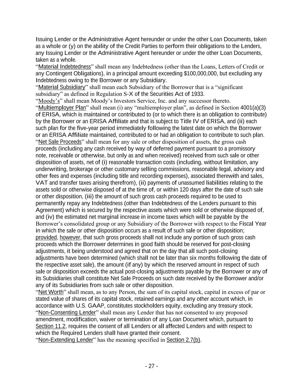 - 27 - Issuing Lender or the Administrative Agent hereunder or under the other Loan Documents, taken as a whole or (y) on the ability of the Credit Parties to perform their obligations to the Lenders, any Issuing Lender or the Administrative Agent hereunder or under the other Loan Documents, taken as a whole. “Material Indebtedness” shall mean any Indebtedness (other than the Loans, Letters of Credit or any Contingent Obligations), in a principal amount exceeding $100,000,000, but excluding any Indebtedness owing to the Borrower or any Subsidiary. “Material Subsidiary” shall mean each Subsidiary of the Borrower that is a “significant subsidiary” as defined in Regulation S-X of the Securities Act of 1933. “Moody’s” shall mean Moody’s Investors Service, Inc. and any successor thereto. “Multiemployer Plan” shall mean (i) any “multiemployer plan”, as defined in Section 4001(a)(3) of ERISA, which is maintained or contributed to (or to which there is an obligation to contribute) by the Borrower or an ERISA Affiliate and that is subject to Title IV of ERISA, and (ii) each such plan for the five-year period immediately following the latest date on which the Borrower or an ERISA Affiliate maintained, contributed to or had an obligation to contribute to such plan. “Net Sale Proceeds” shall mean for any sale or other disposition of assets, the gross cash proceeds (including any cash received by way of deferred payment pursuant to a promissory note, receivable or otherwise, but only as and when received) received from such sale or other disposition of assets, net of (i) reasonable transaction costs (including, without limitation, any underwriting, brokerage or other customary selling commissions, reasonable legal, advisory and other fees and expenses (including title and recording expenses), associated therewith and sales, VAT and transfer taxes arising therefrom), (ii) payments of unassumed liabilities relating to the assets sold or otherwise disposed of at the time of, or within 120 days after the date of such sale or other disposition, (iii) the amount of such gross cash proceeds required to be used to permanently repay any Indebtedness (other than Indebtedness of the Lenders pursuant to this Agreement) which is secured by the respective assets which were sold or otherwise disposed of, and (iv) the estimated net marginal increase in income taxes which will be payable by the Borrower’s consolidated group or any Subsidiary of the Borrower with respect to the Fiscal Year in which the sale or other disposition occurs as a result of such sale or other disposition; provided, however, that such gross proceeds shall not include any portion of such gross cash proceeds which the Borrower determines in good faith should be reserved for post-closing adjustments, it being understood and agreed that on the day that all such post-closing adjustments have been determined (which shall not be later than six months following the date of the respective asset sale), the amount (if any) by which the reserved amount in respect of such sale or disposition exceeds the actual post-closing adjustments payable by the Borrower or any of its Subsidiaries shall constitute Net Sale Proceeds on such date received by the Borrower and/or any of its Subsidiaries from such sale or other disposition. “Net Worth” shall mean, as to any Person, the sum of its capital stock, capital in excess of par or stated value of shares of its capital stock, retained earnings and any other account which, in accordance with U.S. GAAP, constitutes stockholders equity, excluding any treasury stock. “Non-Consenting Lender” shall mean any Lender that has not consented to any proposed amendment, modification, waiver or termination of any Loan Document which, pursuant to Section 11.2, requires the consent of all Lenders or all affected Lenders and with respect to which the Required Lenders shall have granted their consent. “Non-Extending Lender” has the meaning specified in Section 2.7(b).