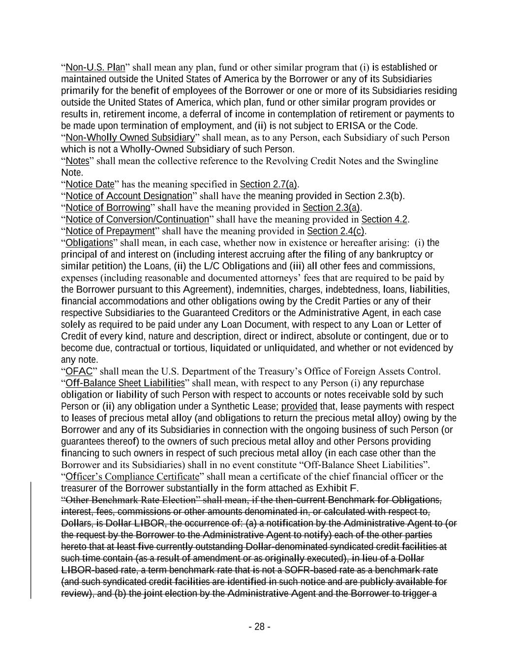 - 28 - “Non-U.S. Plan” shall mean any plan, fund or other similar program that (i) is established or maintained outside the United States of America by the Borrower or any of its Subsidiaries primarily for the benefit of employees of the Borrower or one or more of its Subsidiaries residing outside the United States of America, which plan, fund or other similar program provides or results in, retirement income, a deferral of income in contemplation of retirement or payments to be made upon termination of employment, and (ii) is not subject to ERISA or the Code. “Non-Wholly Owned Subsidiary” shall mean, as to any Person, each Subsidiary of such Person which is not a Wholly-Owned Subsidiary of such Person. “Notes” shall mean the collective reference to the Revolving Credit Notes and the Swingline Note. “Notice Date” has the meaning specified in Section 2.7(a). “Notice of Account Designation” shall have the meaning provided in Section 2.3(b). “Notice of Borrowing” shall have the meaning provided in Section 2.3(a). “Notice of Conversion/Continuation” shall have the meaning provided in Section 4.2. “Notice of Prepayment” shall have the meaning provided in Section 2.4(c). “Obligations” shall mean, in each case, whether now in existence or hereafter arising: (i) the principal of and interest on (including interest accruing after the filing of any bankruptcy or similar petition) the Loans, (ii) the L/C Obligations and (iii) all other fees and commissions, expenses (including reasonable and documented attorneys’ fees that are required to be paid by the Borrower pursuant to this Agreement), indemnities, charges, indebtedness, loans, liabilities, financial accommodations and other obligations owing by the Credit Parties or any of their respective Subsidiaries to the Guaranteed Creditors or the Administrative Agent, in each case solely as required to be paid under any Loan Document, with respect to any Loan or Letter of Credit of every kind, nature and description, direct or indirect, absolute or contingent, due or to become due, contractual or tortious, liquidated or unliquidated, and whether or not evidenced by any note. “OFAC” shall mean the U.S. Department of the Treasury’s Office of Foreign Assets Control. “Off-Balance Sheet Liabilities” shall mean, with respect to any Person (i) any repurchase obligation or liability of such Person with respect to accounts or notes receivable sold by such Person or (ii) any obligation under a Synthetic Lease; provided that, lease payments with respect to leases of precious metal alloy (and obligations to return the precious metal alloy) owing by the Borrower and any of its Subsidiaries in connection with the ongoing business of such Person (or guarantees thereof) to the owners of such precious metal alloy and other Persons providing financing to such owners in respect of such precious metal alloy (in each case other than the Borrower and its Subsidiaries) shall in no event constitute “Off-Balance Sheet Liabilities”. “Officer’s Compliance Certificate” shall mean a certificate of the chief financial officer or the treasurer of the Borrower substantially in the form attached as Exhibit F. “Other Benchmark Rate Election” shall mean, if the then-current Benchmark for Obligations, interest, fees, commissions or other amounts denominated in, or calculated with respect to, Dollars, is Dollar LIBOR, the occurrence of: (a) a notification by the Administrative Agent to (or the request by the Borrower to the Administrative Agent to notify) each of the other parties hereto that at least five currently outstanding Dollar-denominated syndicated credit facilities at such time contain (as a result of amendment or as originally executed), in lieu of a Dollar LIBOR-based rate, a term benchmark rate that is not a SOFR-based rate as a benchmark rate (and such syndicated credit facilities are identified in such notice and are publicly available for review), and (b) the joint election by the Administrative Agent and the Borrower to trigger a