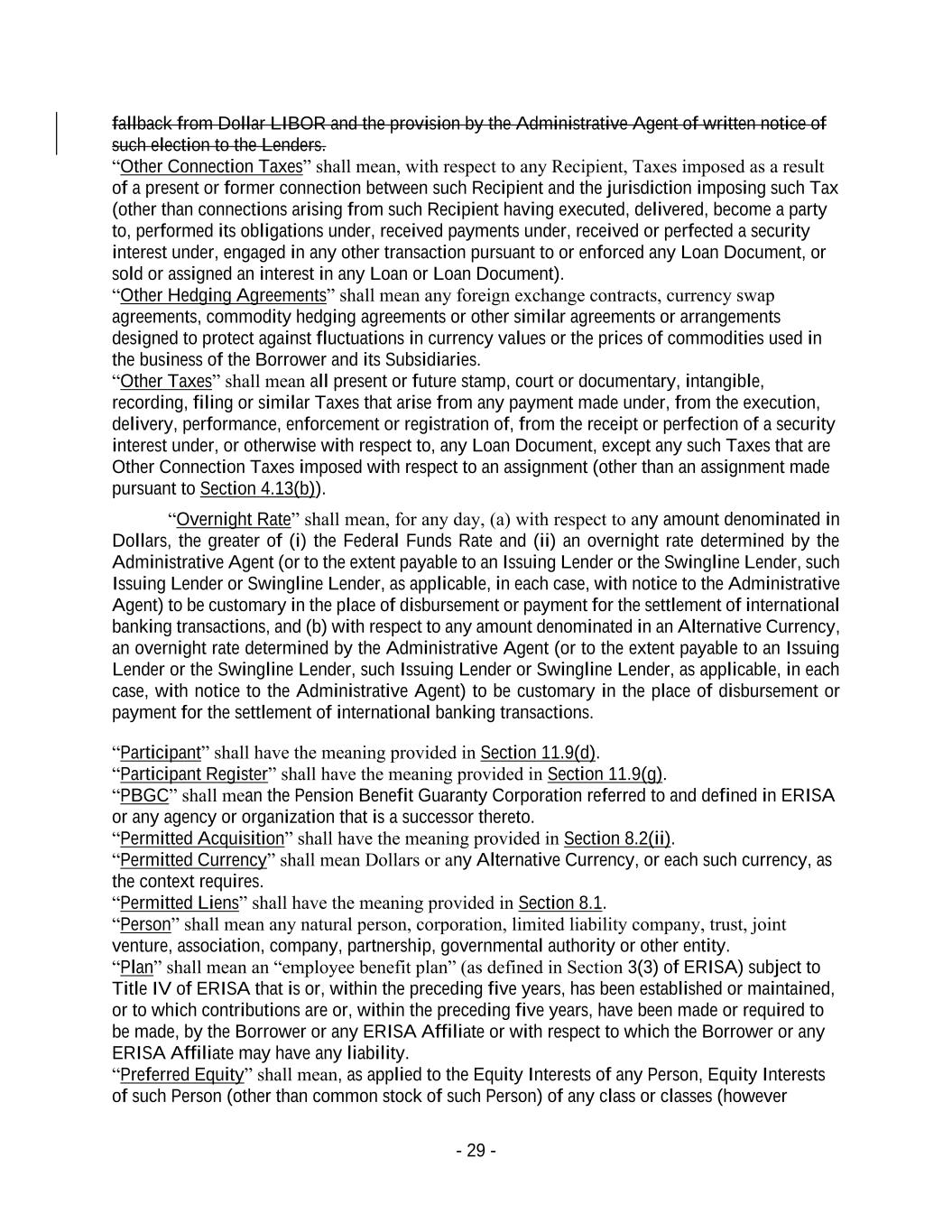 - 29 - fallback from Dollar LIBOR and the provision by the Administrative Agent of written notice of such election to the Lenders. “Other Connection Taxes” shall mean, with respect to any Recipient, Taxes imposed as a result of a present or former connection between such Recipient and the jurisdiction imposing such Tax (other than connections arising from such Recipient having executed, delivered, become a party to, performed its obligations under, received payments under, received or perfected a security interest under, engaged in any other transaction pursuant to or enforced any Loan Document, or sold or assigned an interest in any Loan or Loan Document). “Other Hedging Agreements” shall mean any foreign exchange contracts, currency swap agreements, commodity hedging agreements or other similar agreements or arrangements designed to protect against fluctuations in currency values or the prices of commodities used in the business of the Borrower and its Subsidiaries. “Other Taxes” shall mean all present or future stamp, court or documentary, intangible, recording, filing or similar Taxes that arise from any payment made under, from the execution, delivery, performance, enforcement or registration of, from the receipt or perfection of a security interest under, or otherwise with respect to, any Loan Document, except any such Taxes that are Other Connection Taxes imposed with respect to an assignment (other than an assignment made pursuant to Section 4.13(b)). “Overnight Rate” shall mean, for any day, (a) with respect to any amount denominated in Dollars, the greater of (i) the Federal Funds Rate and (ii) an overnight rate determined by the Administrative Agent (or to the extent payable to an Issuing Lender or the Swingline Lender, such Issuing Lender or Swingline Lender, as applicable, in each case, with notice to the Administrative Agent) to be customary in the place of disbursement or payment for the settlement of international banking transactions, and (b) with respect to any amount denominated in an Alternative Currency, an overnight rate determined by the Administrative Agent (or to the extent payable to an Issuing Lender or the Swingline Lender, such Issuing Lender or Swingline Lender, as applicable, in each case, with notice to the Administrative Agent) to be customary in the place of disbursement or payment for the settlement of international banking transactions. “Participant” shall have the meaning provided in Section 11.9(d). “Participant Register” shall have the meaning provided in Section 11.9(g). “PBGC” shall mean the Pension Benefit Guaranty Corporation referred to and defined in ERISA or any agency or organization that is a successor thereto. “Permitted Acquisition” shall have the meaning provided in Section 8.2(ii). “Permitted Currency” shall mean Dollars or any Alternative Currency, or each such currency, as the context requires. “Permitted Liens” shall have the meaning provided in Section 8.1. “Person” shall mean any natural person, corporation, limited liability company, trust, joint venture, association, company, partnership, governmental authority or other entity. “Plan” shall mean an “employee benefit plan” (as defined in Section 3(3) of ERISA) subject to Title IV of ERISA that is or, within the preceding five years, has been established or maintained, or to which contributions are or, within the preceding five years, have been made or required to be made, by the Borrower or any ERISA Affiliate or with respect to which the Borrower or any ERISA Affiliate may have any liability. “Preferred Equity” shall mean, as applied to the Equity Interests of any Person, Equity Interests of such Person (other than common stock of such Person) of any class or classes (however