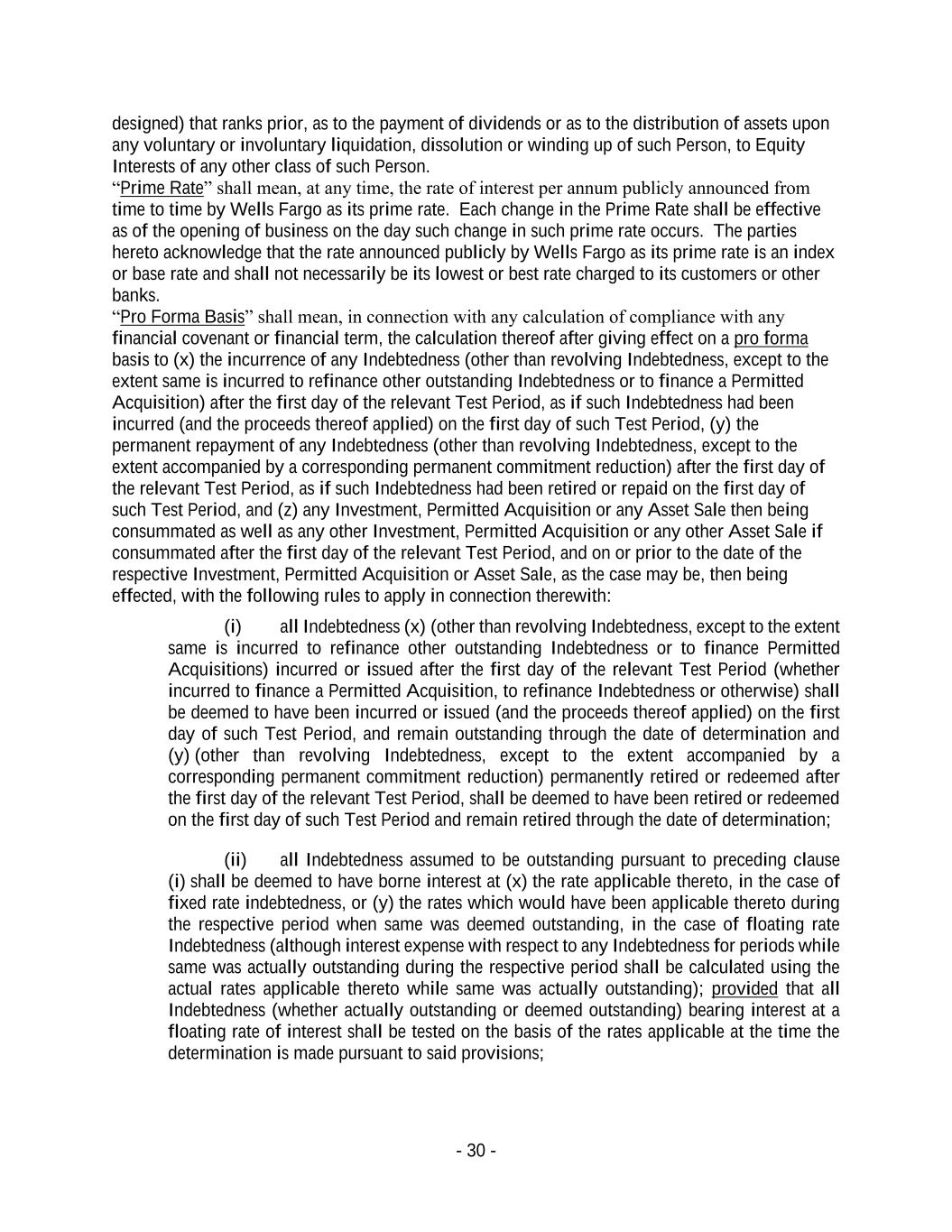 - 30 - designed) that ranks prior, as to the payment of dividends or as to the distribution of assets upon any voluntary or involuntary liquidation, dissolution or winding up of such Person, to Equity Interests of any other class of such Person. “Prime Rate” shall mean, at any time, the rate of interest per annum publicly announced from time to time by Wells Fargo as its prime rate. Each change in the Prime Rate shall be effective as of the opening of business on the day such change in such prime rate occurs. The parties hereto acknowledge that the rate announced publicly by Wells Fargo as its prime rate is an index or base rate and shall not necessarily be its lowest or best rate charged to its customers or other banks. “Pro Forma Basis” shall mean, in connection with any calculation of compliance with any financial covenant or financial term, the calculation thereof after giving effect on a pro forma basis to (x) the incurrence of any Indebtedness (other than revolving Indebtedness, except to the extent same is incurred to refinance other outstanding Indebtedness or to finance a Permitted Acquisition) after the first day of the relevant Test Period, as if such Indebtedness had been incurred (and the proceeds thereof applied) on the first day of such Test Period, (y) the permanent repayment of any Indebtedness (other than revolving Indebtedness, except to the extent accompanied by a corresponding permanent commitment reduction) after the first day of the relevant Test Period, as if such Indebtedness had been retired or repaid on the first day of such Test Period, and (z) any Investment, Permitted Acquisition or any Asset Sale then being consummated as well as any other Investment, Permitted Acquisition or any other Asset Sale if consummated after the first day of the relevant Test Period, and on or prior to the date of the respective Investment, Permitted Acquisition or Asset Sale, as the case may be, then being effected, with the following rules to apply in connection therewith: (i) all Indebtedness (x) (other than revolving Indebtedness, except to the extent same is incurred to refinance other outstanding Indebtedness or to finance Permitted Acquisitions) incurred or issued after the first day of the relevant Test Period (whether incurred to finance a Permitted Acquisition, to refinance Indebtedness or otherwise) shall be deemed to have been incurred or issued (and the proceeds thereof applied) on the first day of such Test Period, and remain outstanding through the date of determination and (y) (other than revolving Indebtedness, except to the extent accompanied by a corresponding permanent commitment reduction) permanently retired or redeemed after the first day of the relevant Test Period, shall be deemed to have been retired or redeemed on the first day of such Test Period and remain retired through the date of determination; (ii) all Indebtedness assumed to be outstanding pursuant to preceding clause (i) shall be deemed to have borne interest at (x) the rate applicable thereto, in the case of fixed rate indebtedness, or (y) the rates which would have been applicable thereto during the respective period when same was deemed outstanding, in the case of floating rate Indebtedness (although interest expense with respect to any Indebtedness for periods while same was actually outstanding during the respective period shall be calculated using the actual rates applicable thereto while same was actually outstanding); provided that all Indebtedness (whether actually outstanding or deemed outstanding) bearing interest at a floating rate of interest shall be tested on the basis of the rates applicable at the time the determination is made pursuant to said provisions;