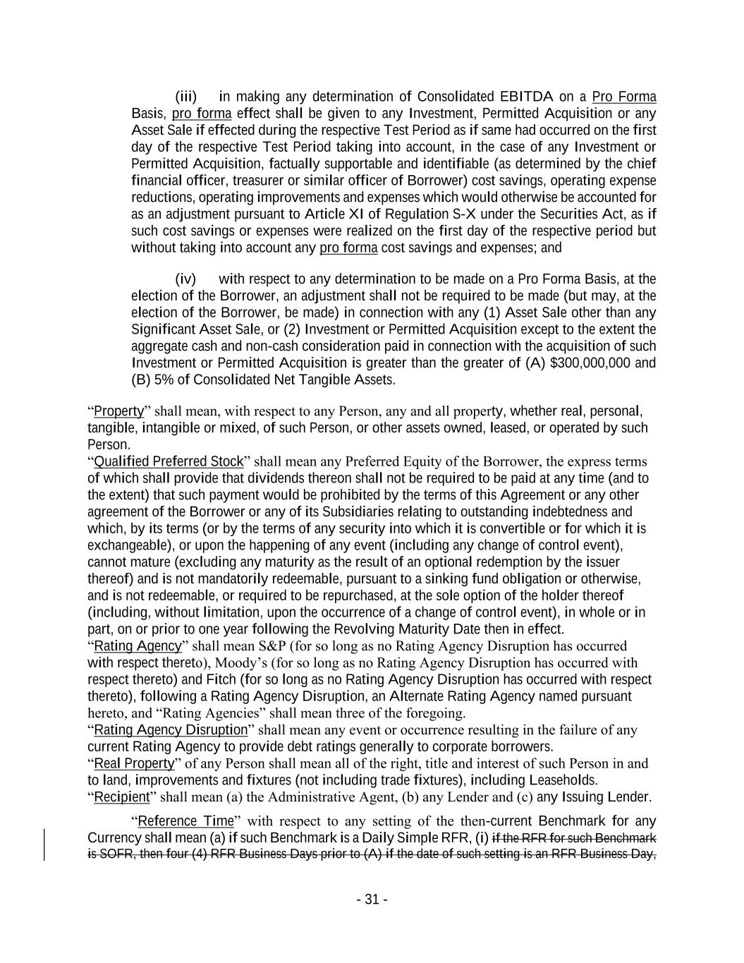 - 31 - (iii) in making any determination of Consolidated EBITDA on a Pro Forma Basis, pro forma effect shall be given to any Investment, Permitted Acquisition or any Asset Sale if effected during the respective Test Period as if same had occurred on the first day of the respective Test Period taking into account, in the case of any Investment or Permitted Acquisition, factually supportable and identifiable (as determined by the chief financial officer, treasurer or similar officer of Borrower) cost savings, operating expense reductions, operating improvements and expenses which would otherwise be accounted for as an adjustment pursuant to Article XI of Regulation S-X under the Securities Act, as if such cost savings or expenses were realized on the first day of the respective period but without taking into account any pro forma cost savings and expenses; and (iv) with respect to any determination to be made on a Pro Forma Basis, at the election of the Borrower, an adjustment shall not be required to be made (but may, at the election of the Borrower, be made) in connection with any (1) Asset Sale other than any Significant Asset Sale, or (2) Investment or Permitted Acquisition except to the extent the aggregate cash and non-cash consideration paid in connection with the acquisition of such Investment or Permitted Acquisition is greater than the greater of (A) $300,000,000 and (B) 5% of Consolidated Net Tangible Assets. “Property” shall mean, with respect to any Person, any and all property, whether real, personal, tangible, intangible or mixed, of such Person, or other assets owned, leased, or operated by such Person. “Qualified Preferred Stock” shall mean any Preferred Equity of the Borrower, the express terms of which shall provide that dividends thereon shall not be required to be paid at any time (and to the extent) that such payment would be prohibited by the terms of this Agreement or any other agreement of the Borrower or any of its Subsidiaries relating to outstanding indebtedness and which, by its terms (or by the terms of any security into which it is convertible or for which it is exchangeable), or upon the happening of any event (including any change of control event), cannot mature (excluding any maturity as the result of an optional redemption by the issuer thereof) and is not mandatorily redeemable, pursuant to a sinking fund obligation or otherwise, and is not redeemable, or required to be repurchased, at the sole option of the holder thereof (including, without limitation, upon the occurrence of a change of control event), in whole or in part, on or prior to one year following the Revolving Maturity Date then in effect. “Rating Agency” shall mean S&P (for so long as no Rating Agency Disruption has occurred with respect thereto), Moody’s (for so long as no Rating Agency Disruption has occurred with respect thereto) and Fitch (for so long as no Rating Agency Disruption has occurred with respect thereto), following a Rating Agency Disruption, an Alternate Rating Agency named pursuant hereto, and “Rating Agencies” shall mean three of the foregoing. “Rating Agency Disruption” shall mean any event or occurrence resulting in the failure of any current Rating Agency to provide debt ratings generally to corporate borrowers. “Real Property” of any Person shall mean all of the right, title and interest of such Person in and to land, improvements and fixtures (not including trade fixtures), including Leaseholds. “Recipient” shall mean (a) the Administrative Agent, (b) any Lender and (c) any Issuing Lender. “Reference Time” with respect to any setting of the then-current Benchmark for any Currency shall mean (a) if such Benchmark is a Daily Simple RFR, (i) if the RFR for such Benchmark is SOFR, then four (4) RFR Business Days prior to (A) if the date of such setting is an RFR Business Day,