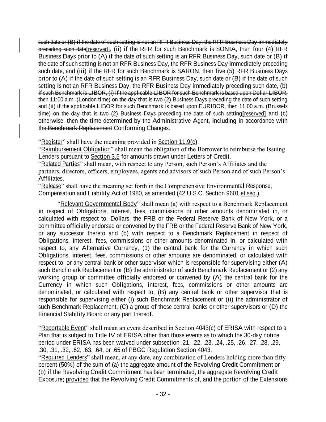 - 32 - such date or (B) if the date of such setting is not an RFR Business Day, the RFR Business Day immediately preceding such date[reserved], (ii) if the RFR for such Benchmark is SONIA, then four (4) RFR Business Days prior to (A) if the date of such setting is an RFR Business Day, such date or (B) if the date of such setting is not an RFR Business Day, the RFR Business Day immediately preceding such date, and (iii) if the RFR for such Benchmark is SARON, then five (5) RFR Business Days prior to (A) if the date of such setting is an RFR Business Day, such date or (B) if the date of such setting is not an RFR Business Day, the RFR Business Day immediately preceding such date, (b) if such Benchmark is LIBOR, (i) if the applicable LIBOR for such Benchmark is based upon Dollar LIBOR, then 11:00 a.m. (London time) on the day that is two (2) Business Days preceding the date of such setting and (ii) if the applicable LIBOR for such Benchmark is based upon EURIBOR, then 11:00 a.m. (Brussels time) on the day that is two (2) Business Days preceding the date of such setting[reserved] and (c) otherwise, then the time determined by the Administrative Agent, including in accordance with the Benchmark Replacement Conforming Changes. “Register” shall have the meaning provided in Section 11.9(c). “Reimbursement Obligation” shall mean the obligation of the Borrower to reimburse the Issuing Lenders pursuant to Section 3.5 for amounts drawn under Letters of Credit. “Related Parties” shall mean, with respect to any Person, such Person’s Affiliates and the partners, directors, officers, employees, agents and advisors of such Person and of such Person’s Affiliates. “Release” shall have the meaning set forth in the Comprehensive Environmental Response, Compensation and Liability Act of 1980, as amended (42 U.S.C. Section 9601 et seq.). “Relevant Governmental Body” shall mean (a) with respect to a Benchmark Replacement in respect of Obligations, interest, fees, commissions or other amounts denominated in, or calculated with respect to, Dollars, the FRB or the Federal Reserve Bank of New York, or a committee officially endorsed or convened by the FRB or the Federal Reserve Bank of New York, or any successor thereto and (b) with respect to a Benchmark Replacement in respect of Obligations, interest, fees, commissions or other amounts denominated in, or calculated with respect to, any Alternative Currency, (1) the central bank for the Currency in which such Obligations, interest, fees, commissions or other amounts are denominated, or calculated with respect to, or any central bank or other supervisor which is responsible for supervising either (A) such Benchmark Replacement or (B) the administrator of such Benchmark Replacement or (2) any working group or committee officially endorsed or convened by (A) the central bank for the Currency in which such Obligations, interest, fees, commissions or other amounts are denominated, or calculated with respect to, (B) any central bank or other supervisor that is responsible for supervising either (i) such Benchmark Replacement or (ii) the administrator of such Benchmark Replacement, (C) a group of those central banks or other supervisors or (D) the Financial Stability Board or any part thereof. “Reportable Event” shall mean an event described in Section 4043(c) of ERISA with respect to a Plan that is subject to Title IV of ERISA other than those events as to which the 30-day notice period under ERISA has been waived under subsection .21, .22, .23, .24, .25, .26, .27, .28, .29, .30, .31, .32, .62, .63, .64, or .65 of PBGC Regulation Section 4043. “Required Lenders” shall mean, at any date, any combination of Lenders holding more than fifty percent (50%) of the sum of (a) the aggregate amount of the Revolving Credit Commitment or (b) if the Revolving Credit Commitment has been terminated, the aggregate Revolving Credit Exposure; provided that the Revolving Credit Commitments of, and the portion of the Extensions
