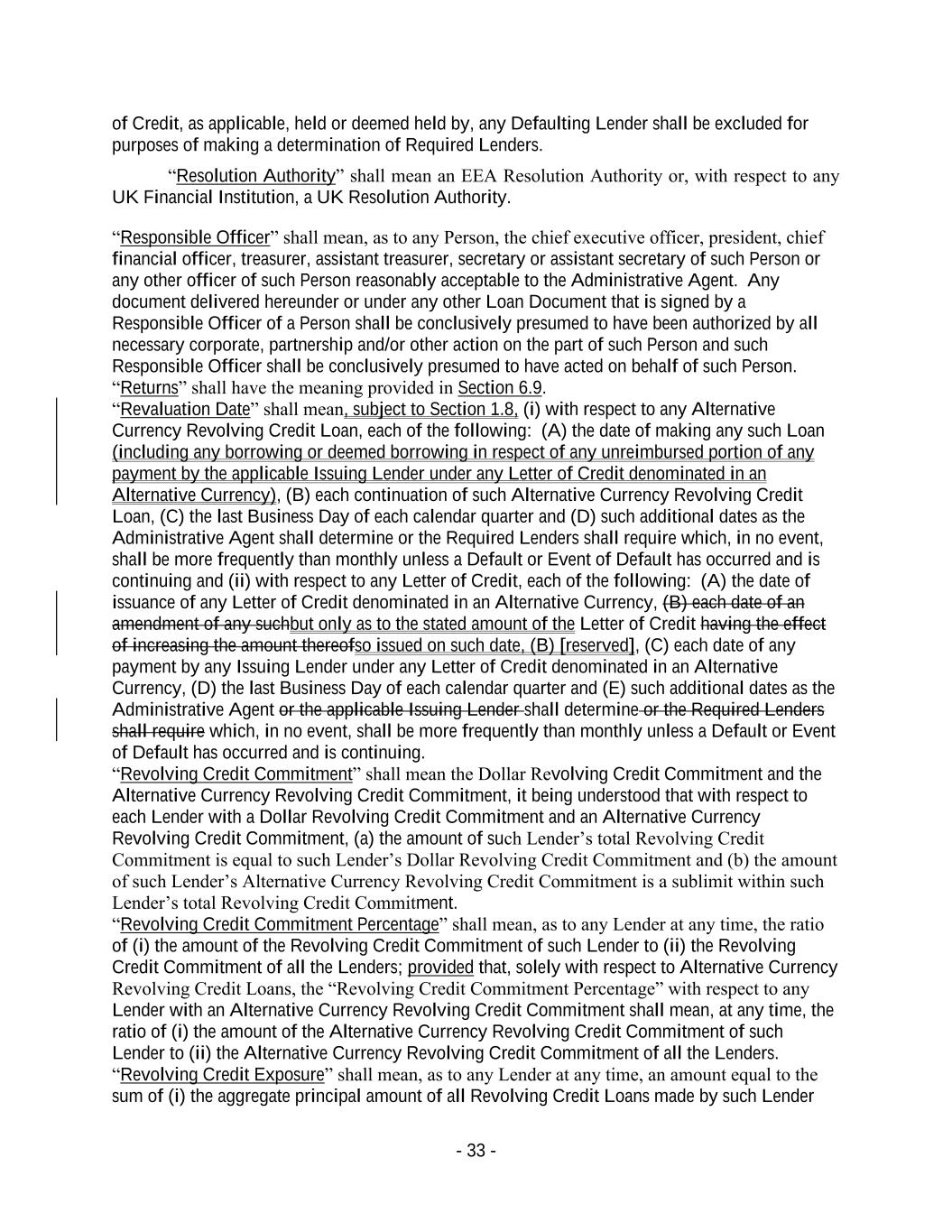 - 33 - of Credit, as applicable, held or deemed held by, any Defaulting Lender shall be excluded for purposes of making a determination of Required Lenders. “Resolution Authority” shall mean an EEA Resolution Authority or, with respect to any UK Financial Institution, a UK Resolution Authority. “Responsible Officer” shall mean, as to any Person, the chief executive officer, president, chief financial officer, treasurer, assistant treasurer, secretary or assistant secretary of such Person or any other officer of such Person reasonably acceptable to the Administrative Agent. Any document delivered hereunder or under any other Loan Document that is signed by a Responsible Officer of a Person shall be conclusively presumed to have been authorized by all necessary corporate, partnership and/or other action on the part of such Person and such Responsible Officer shall be conclusively presumed to have acted on behalf of such Person. “Returns” shall have the meaning provided in Section 6.9. “Revaluation Date” shall mean, subject to Section 1.8, (i) with respect to any Alternative Currency Revolving Credit Loan, each of the following: (A) the date of making any such Loan (including any borrowing or deemed borrowing in respect of any unreimbursed portion of any payment by the applicable Issuing Lender under any Letter of Credit denominated in an Alternative Currency), (B) each continuation of such Alternative Currency Revolving Credit Loan, (C) the last Business Day of each calendar quarter and (D) such additional dates as the Administrative Agent shall determine or the Required Lenders shall require which, in no event, shall be more frequently than monthly unless a Default or Event of Default has occurred and is continuing and (ii) with respect to any Letter of Credit, each of the following: (A) the date of issuance of any Letter of Credit denominated in an Alternative Currency, (B) each date of an amendment of any suchbut only as to the stated amount of the Letter of Credit having the effect of increasing the amount thereofso issued on such date, (B) [reserved], (C) each date of any payment by any Issuing Lender under any Letter of Credit denominated in an Alternative Currency, (D) the last Business Day of each calendar quarter and (E) such additional dates as the Administrative Agent or the applicable Issuing Lender shall determine or the Required Lenders shall require which, in no event, shall be more frequently than monthly unless a Default or Event of Default has occurred and is continuing. “Revolving Credit Commitment” shall mean the Dollar Revolving Credit Commitment and the Alternative Currency Revolving Credit Commitment, it being understood that with respect to each Lender with a Dollar Revolving Credit Commitment and an Alternative Currency Revolving Credit Commitment, (a) the amount of such Lender’s total Revolving Credit Commitment is equal to such Lender’s Dollar Revolving Credit Commitment and (b) the amount of such Lender’s Alternative Currency Revolving Credit Commitment is a sublimit within such Lender’s total Revolving Credit Commitment. “Revolving Credit Commitment Percentage” shall mean, as to any Lender at any time, the ratio of (i) the amount of the Revolving Credit Commitment of such Lender to (ii) the Revolving Credit Commitment of all the Lenders; provided that, solely with respect to Alternative Currency Revolving Credit Loans, the “Revolving Credit Commitment Percentage” with respect to any Lender with an Alternative Currency Revolving Credit Commitment shall mean, at any time, the ratio of (i) the amount of the Alternative Currency Revolving Credit Commitment of such Lender to (ii) the Alternative Currency Revolving Credit Commitment of all the Lenders. “Revolving Credit Exposure” shall mean, as to any Lender at any time, an amount equal to the sum of (i) the aggregate principal amount of all Revolving Credit Loans made by such Lender