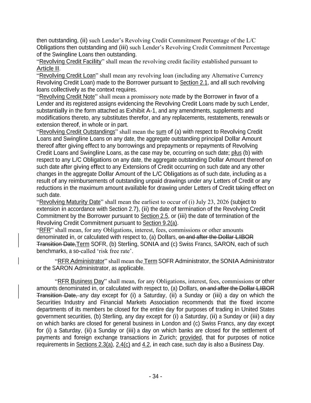 - 34 - then outstanding, (ii) such Lender’s Revolving Credit Commitment Percentage of the L/C Obligations then outstanding and (iii) such Lender’s Revolving Credit Commitment Percentage of the Swingline Loans then outstanding. “Revolving Credit Facility” shall mean the revolving credit facility established pursuant to Article II. “Revolving Credit Loan” shall mean any revolving loan (including any Alternative Currency Revolving Credit Loan) made to the Borrower pursuant to Section 2.1, and all such revolving loans collectively as the context requires. “Revolving Credit Note” shall mean a promissory note made by the Borrower in favor of a Lender and its registered assigns evidencing the Revolving Credit Loans made by such Lender, substantially in the form attached as Exhibit A-1, and any amendments, supplements and modifications thereto, any substitutes therefor, and any replacements, restatements, renewals or extension thereof, in whole or in part. “Revolving Credit Outstandings” shall mean the sum of (a) with respect to Revolving Credit Loans and Swingline Loans on any date, the aggregate outstanding principal Dollar Amount thereof after giving effect to any borrowings and prepayments or repayments of Revolving Credit Loans and Swingline Loans, as the case may be, occurring on such date; plus (b) with respect to any L/C Obligations on any date, the aggregate outstanding Dollar Amount thereof on such date after giving effect to any Extensions of Credit occurring on such date and any other changes in the aggregate Dollar Amount of the L/C Obligations as of such date, including as a result of any reimbursements of outstanding unpaid drawings under any Letters of Credit or any reductions in the maximum amount available for drawing under Letters of Credit taking effect on such date. “Revolving Maturity Date” shall mean the earliest to occur of (i) July 23, 2026 (subject to extension in accordance with Section 2.7), (ii) the date of termination of the Revolving Credit Commitment by the Borrower pursuant to Section 2.5, or (iii) the date of termination of the Revolving Credit Commitment pursuant to Section 9.2(a). “RFR” shall mean, for any Obligations, interest, fees, commissions or other amounts denominated in, or calculated with respect to, (a) Dollars, on and after the Dollar LIBOR Transition Date,Term SOFR, (b) Sterling, SONIA and (c) Swiss Francs, SARON, each of such benchmarks, a so-called ‘risk free rate’. “RFR Administrator” shall mean the Term SOFR Administrator, the SONIA Administrator or the SARON Administrator, as applicable. “RFR Business Day” shall mean, for any Obligations, interest, fees, commissions or other amounts denominated in, or calculated with respect to, (a) Dollars, on and after the Dollar LIBOR Transition Date, any day except for (i) a Saturday, (ii) a Sunday or (iii) a day on which the Securities Industry and Financial Markets Association recommends that the fixed income departments of its members be closed for the entire day for purposes of trading in United States government securities, (b) Sterling, any day except for (i) a Saturday, (ii) a Sunday or (iii) a day on which banks are closed for general business in London and (c) Swiss Francs, any day except for (i) a Saturday, (ii) a Sunday or (iii) a day on which banks are closed for the settlement of payments and foreign exchange transactions in Zurich; provided, that for purposes of notice requirements in Sections 2.3(a), 2.4(c) and 4.2, in each case, such day is also a Business Day.