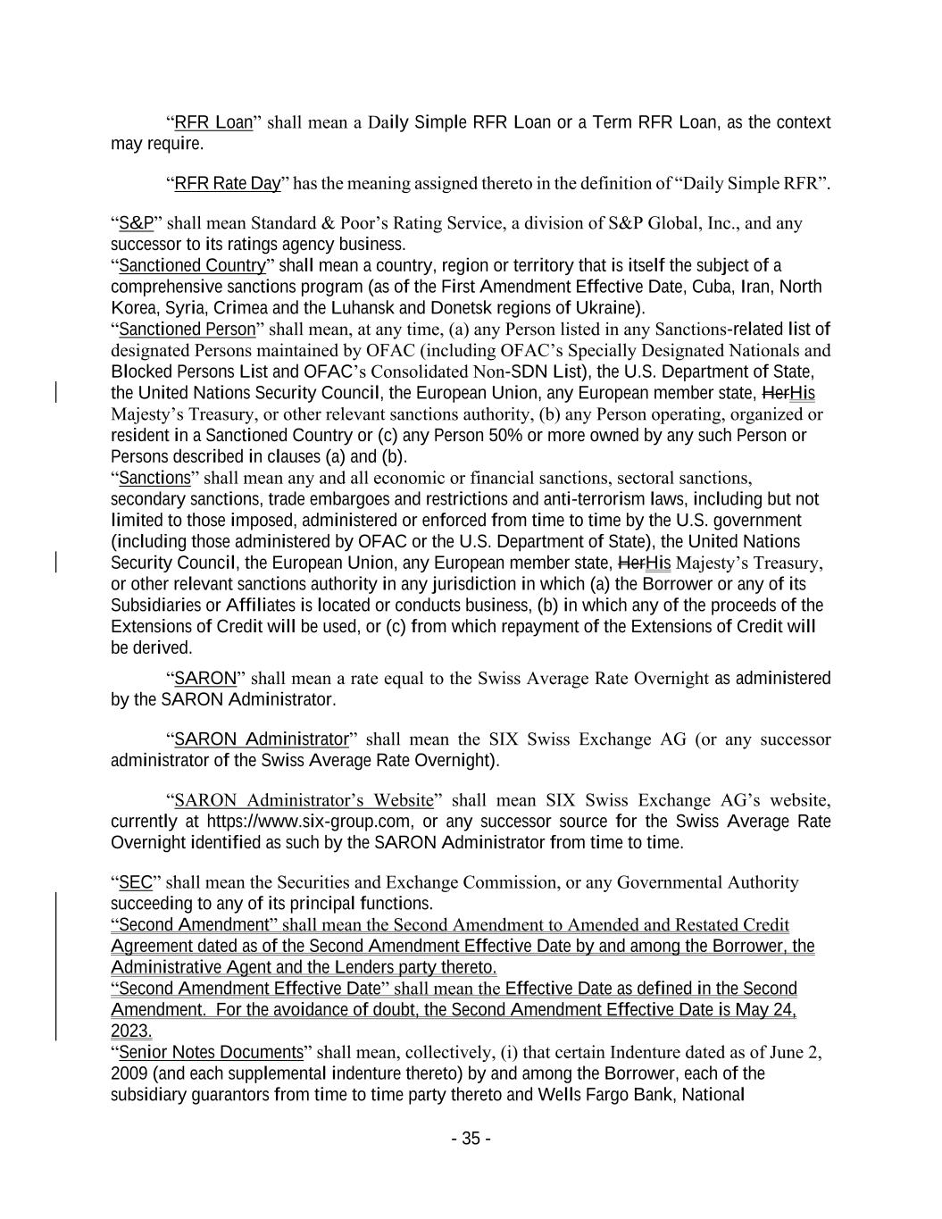 - 35 - “RFR Loan” shall mean a Daily Simple RFR Loan or a Term RFR Loan, as the context may require. “RFR Rate Day” has the meaning assigned thereto in the definition of “Daily Simple RFR”. “S&P” shall mean Standard & Poor’s Rating Service, a division of S&P Global, Inc., and any successor to its ratings agency business. “Sanctioned Country” shall mean a country, region or territory that is itself the subject of a comprehensive sanctions program (as of the First Amendment Effective Date, Cuba, Iran, North Korea, Syria, Crimea and the Luhansk and Donetsk regions of Ukraine). “Sanctioned Person” shall mean, at any time, (a) any Person listed in any Sanctions-related list of designated Persons maintained by OFAC (including OFAC’s Specially Designated Nationals and Blocked Persons List and OFAC’s Consolidated Non-SDN List), the U.S. Department of State, the United Nations Security Council, the European Union, any European member state, HerHis Majesty’s Treasury, or other relevant sanctions authority, (b) any Person operating, organized or resident in a Sanctioned Country or (c) any Person 50% or more owned by any such Person or Persons described in clauses (a) and (b). “Sanctions” shall mean any and all economic or financial sanctions, sectoral sanctions, secondary sanctions, trade embargoes and restrictions and anti-terrorism laws, including but not limited to those imposed, administered or enforced from time to time by the U.S. government (including those administered by OFAC or the U.S. Department of State), the United Nations Security Council, the European Union, any European member state, HerHis Majesty’s Treasury, or other relevant sanctions authority in any jurisdiction in which (a) the Borrower or any of its Subsidiaries or Affiliates is located or conducts business, (b) in which any of the proceeds of the Extensions of Credit will be used, or (c) from which repayment of the Extensions of Credit will be derived. “SARON” shall mean a rate equal to the Swiss Average Rate Overnight as administered by the SARON Administrator. “SARON Administrator” shall mean the SIX Swiss Exchange AG (or any successor administrator of the Swiss Average Rate Overnight). “SARON Administrator’s Website” shall mean SIX Swiss Exchange AG’s website, currently at https://www.six-group.com, or any successor source for the Swiss Average Rate Overnight identified as such by the SARON Administrator from time to time. “SEC” shall mean the Securities and Exchange Commission, or any Governmental Authority succeeding to any of its principal functions. “Second Amendment” shall mean the Second Amendment to Amended and Restated Credit Agreement dated as of the Second Amendment Effective Date by and among the Borrower, the Administrative Agent and the Lenders party thereto. “Second Amendment Effective Date” shall mean the Effective Date as defined in the Second Amendment. For the avoidance of doubt, the Second Amendment Effective Date is May 24, 2023. “Senior Notes Documents” shall mean, collectively, (i) that certain Indenture dated as of June 2, 2009 (and each supplemental indenture thereto) by and among the Borrower, each of the subsidiary guarantors from time to time party thereto and Wells Fargo Bank, National
