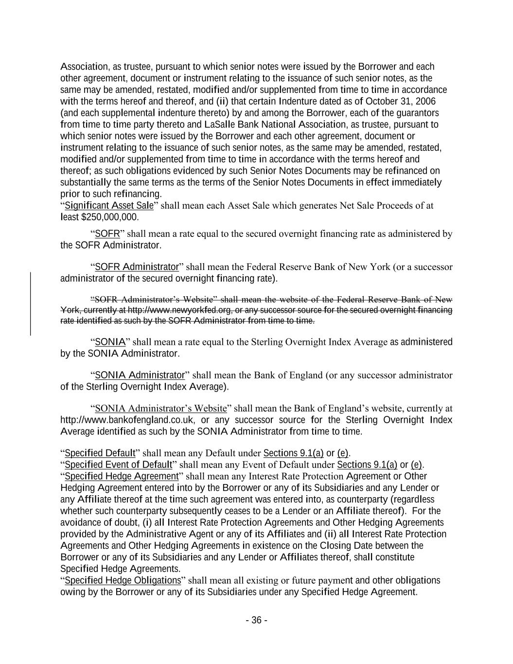 - 36 - Association, as trustee, pursuant to which senior notes were issued by the Borrower and each other agreement, document or instrument relating to the issuance of such senior notes, as the same may be amended, restated, modified and/or supplemented from time to time in accordance with the terms hereof and thereof, and (ii) that certain Indenture dated as of October 31, 2006 (and each supplemental indenture thereto) by and among the Borrower, each of the guarantors from time to time party thereto and LaSalle Bank National Association, as trustee, pursuant to which senior notes were issued by the Borrower and each other agreement, document or instrument relating to the issuance of such senior notes, as the same may be amended, restated, modified and/or supplemented from time to time in accordance with the terms hereof and thereof; as such obligations evidenced by such Senior Notes Documents may be refinanced on substantially the same terms as the terms of the Senior Notes Documents in effect immediately prior to such refinancing. “Significant Asset Sale” shall mean each Asset Sale which generates Net Sale Proceeds of at least $250,000,000. “SOFR” shall mean a rate equal to the secured overnight financing rate as administered by the SOFR Administrator. “SOFR Administrator” shall mean the Federal Reserve Bank of New York (or a successor administrator of the secured overnight financing rate). “SOFR Administrator’s Website” shall mean the website of the Federal Reserve Bank of New York, currently at http://www.newyorkfed.org, or any successor source for the secured overnight financing rate identified as such by the SOFR Administrator from time to time. “SONIA” shall mean a rate equal to the Sterling Overnight Index Average as administered by the SONIA Administrator. “SONIA Administrator” shall mean the Bank of England (or any successor administrator of the Sterling Overnight Index Average). “SONIA Administrator’s Website” shall mean the Bank of England’s website, currently at http://www.bankofengland.co.uk, or any successor source for the Sterling Overnight Index Average identified as such by the SONIA Administrator from time to time. “Specified Default” shall mean any Default under Sections 9.1(a) or (e). “Specified Event of Default” shall mean any Event of Default under Sections 9.1(a) or (e). “Specified Hedge Agreement” shall mean any Interest Rate Protection Agreement or Other Hedging Agreement entered into by the Borrower or any of its Subsidiaries and any Lender or any Affiliate thereof at the time such agreement was entered into, as counterparty (regardless whether such counterparty subsequently ceases to be a Lender or an Affiliate thereof). For the avoidance of doubt, (i) all Interest Rate Protection Agreements and Other Hedging Agreements provided by the Administrative Agent or any of its Affiliates and (ii) all Interest Rate Protection Agreements and Other Hedging Agreements in existence on the Closing Date between the Borrower or any of its Subsidiaries and any Lender or Affiliates thereof, shall constitute Specified Hedge Agreements. “Specified Hedge Obligations” shall mean all existing or future payment and other obligations owing by the Borrower or any of its Subsidiaries under any Specified Hedge Agreement.