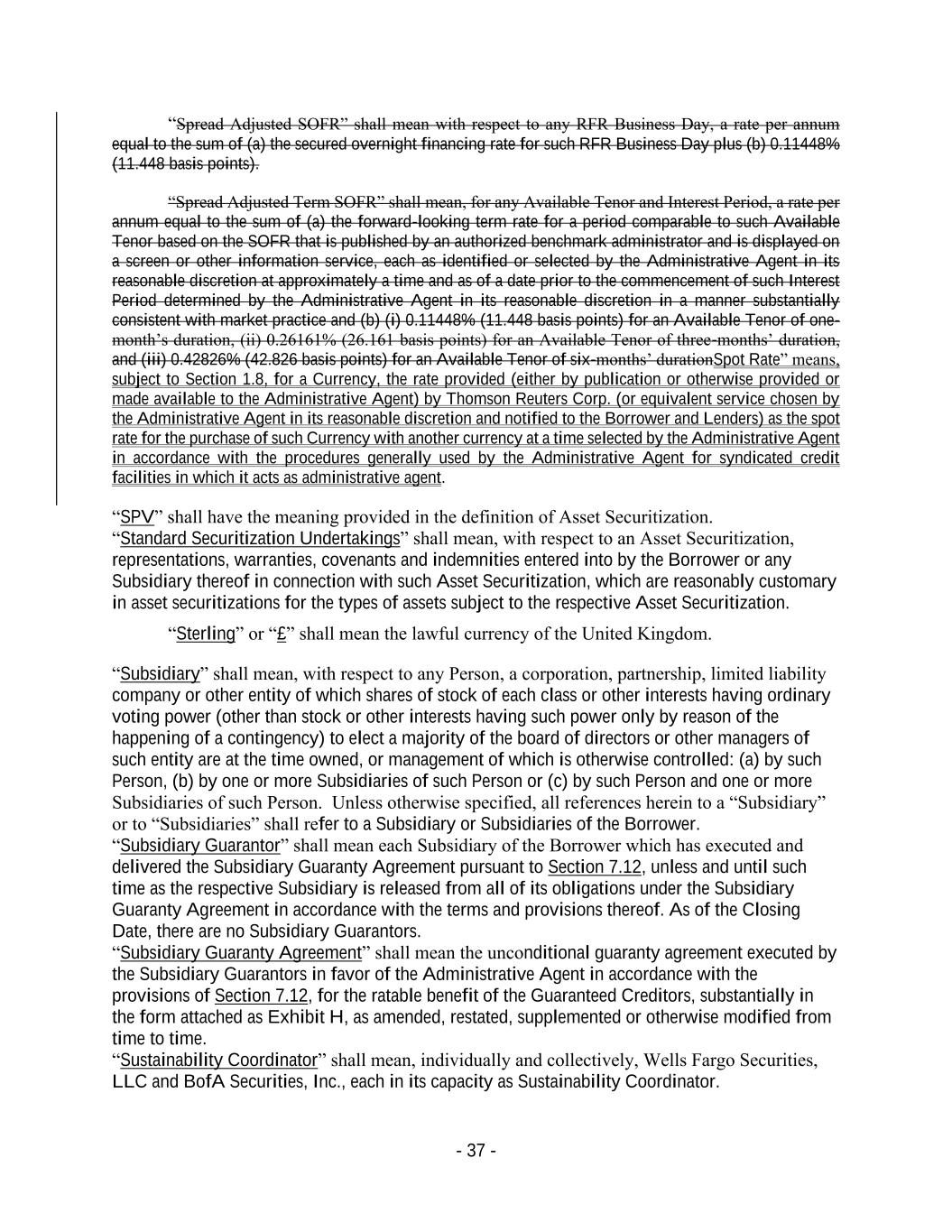 - 37 - “Spread Adjusted SOFR” shall mean with respect to any RFR Business Day, a rate per annum equal to the sum of (a) the secured overnight financing rate for such RFR Business Day plus (b) 0.11448% (11.448 basis points). “Spread Adjusted Term SOFR” shall mean, for any Available Tenor and Interest Period, a rate per annum equal to the sum of (a) the forward-looking term rate for a period comparable to such Available Tenor based on the SOFR that is published by an authorized benchmark administrator and is displayed on a screen or other information service, each as identified or selected by the Administrative Agent in its reasonable discretion at approximately a time and as of a date prior to the commencement of such Interest Period determined by the Administrative Agent in its reasonable discretion in a manner substantially consistent with market practice and (b) (i) 0.11448% (11.448 basis points) for an Available Tenor of one- month’s duration, (ii) 0.26161% (26.161 basis points) for an Available Tenor of three-months’ duration, and (iii) 0.42826% (42.826 basis points) for an Available Tenor of six-months’ durationSpot Rate” means, subject to Section 1.8, for a Currency, the rate provided (either by publication or otherwise provided or made available to the Administrative Agent) by Thomson Reuters Corp. (or equivalent service chosen by the Administrative Agent in its reasonable discretion and notified to the Borrower and Lenders) as the spot rate for the purchase of such Currency with another currency at a time selected by the Administrative Agent in accordance with the procedures generally used by the Administrative Agent for syndicated credit facilities in which it acts as administrative agent. “SPV” shall have the meaning provided in the definition of Asset Securitization. “Standard Securitization Undertakings” shall mean, with respect to an Asset Securitization, representations, warranties, covenants and indemnities entered into by the Borrower or any Subsidiary thereof in connection with such Asset Securitization, which are reasonably customary in asset securitizations for the types of assets subject to the respective Asset Securitization. “Sterling” or “£” shall mean the lawful currency of the United Kingdom. “Subsidiary” shall mean, with respect to any Person, a corporation, partnership, limited liability company or other entity of which shares of stock of each class or other interests having ordinary voting power (other than stock or other interests having such power only by reason of the happening of a contingency) to elect a majority of the board of directors or other managers of such entity are at the time owned, or management of which is otherwise controlled: (a) by such Person, (b) by one or more Subsidiaries of such Person or (c) by such Person and one or more Subsidiaries of such Person. Unless otherwise specified, all references herein to a “Subsidiary” or to “Subsidiaries” shall refer to a Subsidiary or Subsidiaries of the Borrower. “Subsidiary Guarantor” shall mean each Subsidiary of the Borrower which has executed and delivered the Subsidiary Guaranty Agreement pursuant to Section 7.12, unless and until such time as the respective Subsidiary is released from all of its obligations under the Subsidiary Guaranty Agreement in accordance with the terms and provisions thereof. As of the Closing Date, there are no Subsidiary Guarantors. “Subsidiary Guaranty Agreement” shall mean the unconditional guaranty agreement executed by the Subsidiary Guarantors in favor of the Administrative Agent in accordance with the provisions of Section 7.12, for the ratable benefit of the Guaranteed Creditors, substantially in the form attached as Exhibit H, as amended, restated, supplemented or otherwise modified from time to time. “Sustainability Coordinator” shall mean, individually and collectively, Wells Fargo Securities, LLC and BofA Securities, Inc., each in its capacity as Sustainability Coordinator.