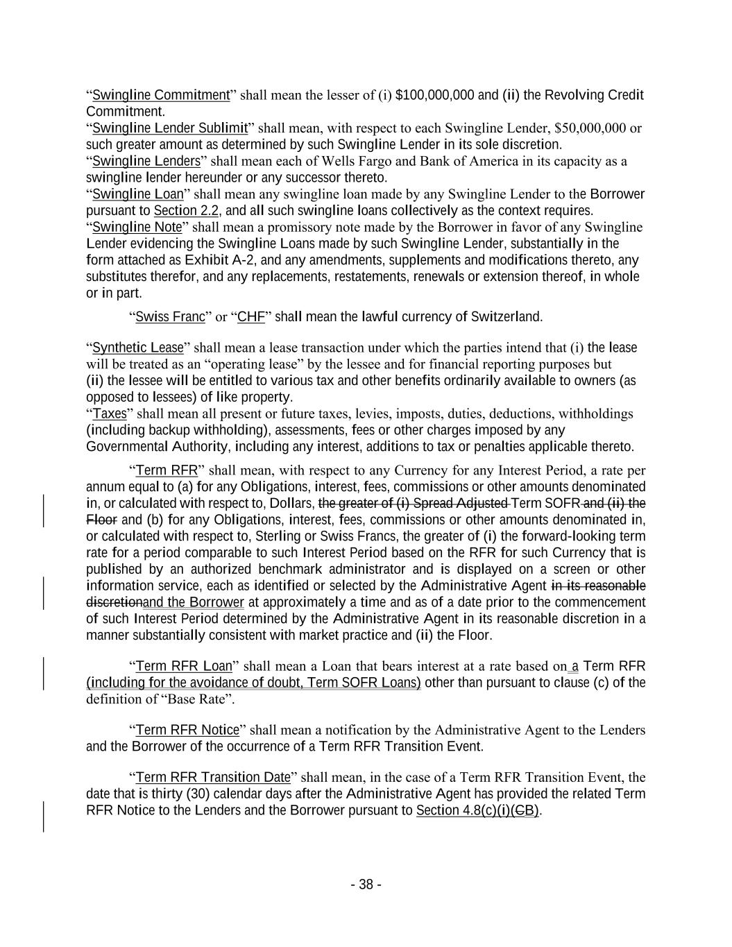 - 38 - “Swingline Commitment” shall mean the lesser of (i) $100,000,000 and (ii) the Revolving Credit Commitment. “Swingline Lender Sublimit” shall mean, with respect to each Swingline Lender, $50,000,000 or such greater amount as determined by such Swingline Lender in its sole discretion. “Swingline Lenders” shall mean each of Wells Fargo and Bank of America in its capacity as a swingline lender hereunder or any successor thereto. “Swingline Loan” shall mean any swingline loan made by any Swingline Lender to the Borrower pursuant to Section 2.2, and all such swingline loans collectively as the context requires. “Swingline Note” shall mean a promissory note made by the Borrower in favor of any Swingline Lender evidencing the Swingline Loans made by such Swingline Lender, substantially in the form attached as Exhibit A-2, and any amendments, supplements and modifications thereto, any substitutes therefor, and any replacements, restatements, renewals or extension thereof, in whole or in part. “Swiss Franc” or “CHF” shall mean the lawful currency of Switzerland. “Synthetic Lease” shall mean a lease transaction under which the parties intend that (i) the lease will be treated as an “operating lease” by the lessee and for financial reporting purposes but (ii) the lessee will be entitled to various tax and other benefits ordinarily available to owners (as opposed to lessees) of like property. “Taxes” shall mean all present or future taxes, levies, imposts, duties, deductions, withholdings (including backup withholding), assessments, fees or other charges imposed by any Governmental Authority, including any interest, additions to tax or penalties applicable thereto. “Term RFR” shall mean, with respect to any Currency for any Interest Period, a rate per annum equal to (a) for any Obligations, interest, fees, commissions or other amounts denominated in, or calculated with respect to, Dollars, the greater of (i) Spread Adjusted Term SOFR and (ii) the Floor and (b) for any Obligations, interest, fees, commissions or other amounts denominated in, or calculated with respect to, Sterling or Swiss Francs, the greater of (i) the forward-looking term rate for a period comparable to such Interest Period based on the RFR for such Currency that is published by an authorized benchmark administrator and is displayed on a screen or other information service, each as identified or selected by the Administrative Agent in its reasonable discretionand the Borrower at approximately a time and as of a date prior to the commencement of such Interest Period determined by the Administrative Agent in its reasonable discretion in a manner substantially consistent with market practice and (ii) the Floor. “Term RFR Loan” shall mean a Loan that bears interest at a rate based on a Term RFR (including for the avoidance of doubt, Term SOFR Loans) other than pursuant to clause (c) of the definition of “Base Rate”. “Term RFR Notice” shall mean a notification by the Administrative Agent to the Lenders and the Borrower of the occurrence of a Term RFR Transition Event. “Term RFR Transition Date” shall mean, in the case of a Term RFR Transition Event, the date that is thirty (30) calendar days after the Administrative Agent has provided the related Term RFR Notice to the Lenders and the Borrower pursuant to Section 4.8(c)(i)(CB).