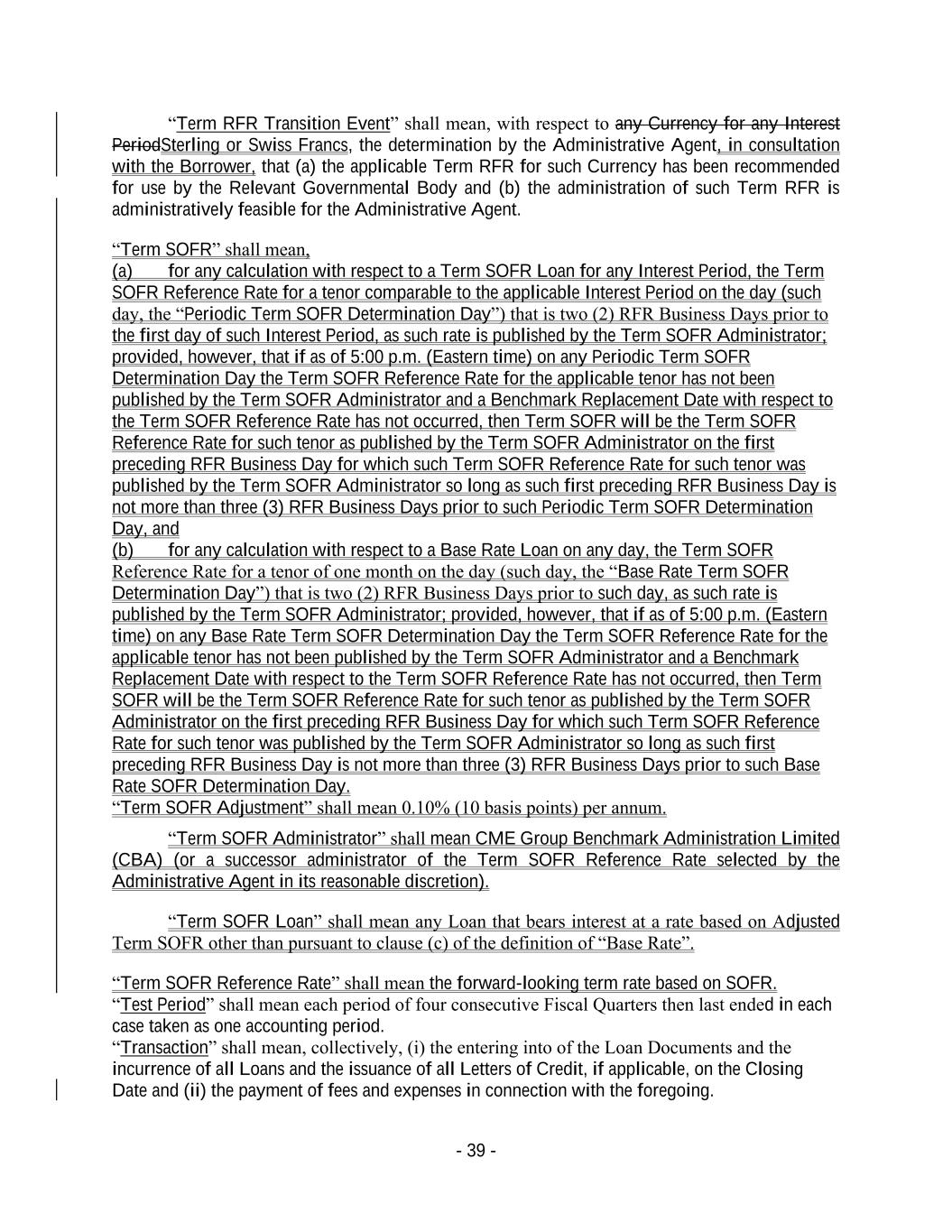 - 39 - “Term RFR Transition Event” shall mean, with respect to any Currency for any Interest PeriodSterling or Swiss Francs, the determination by the Administrative Agent, in consultation with the Borrower, that (a) the applicable Term RFR for such Currency has been recommended for use by the Relevant Governmental Body and (b) the administration of such Term RFR is administratively feasible for the Administrative Agent. “Term SOFR” shall mean, (a) for any calculation with respect to a Term SOFR Loan for any Interest Period, the Term SOFR Reference Rate for a tenor comparable to the applicable Interest Period on the day (such day, the “Periodic Term SOFR Determination Day”) that is two (2) RFR Business Days prior to the first day of such Interest Period, as such rate is published by the Term SOFR Administrator; provided, however, that if as of 5:00 p.m. (Eastern time) on any Periodic Term SOFR Determination Day the Term SOFR Reference Rate for the applicable tenor has not been published by the Term SOFR Administrator and a Benchmark Replacement Date with respect to the Term SOFR Reference Rate has not occurred, then Term SOFR will be the Term SOFR Reference Rate for such tenor as published by the Term SOFR Administrator on the first preceding RFR Business Day for which such Term SOFR Reference Rate for such tenor was published by the Term SOFR Administrator so long as such first preceding RFR Business Day is not more than three (3) RFR Business Days prior to such Periodic Term SOFR Determination Day, and (b) for any calculation with respect to a Base Rate Loan on any day, the Term SOFR Reference Rate for a tenor of one month on the day (such day, the “Base Rate Term SOFR Determination Day”) that is two (2) RFR Business Days prior to such day, as such rate is published by the Term SOFR Administrator; provided, however, that if as of 5:00 p.m. (Eastern time) on any Base Rate Term SOFR Determination Day the Term SOFR Reference Rate for the applicable tenor has not been published by the Term SOFR Administrator and a Benchmark Replacement Date with respect to the Term SOFR Reference Rate has not occurred, then Term SOFR will be the Term SOFR Reference Rate for such tenor as published by the Term SOFR Administrator on the first preceding RFR Business Day for which such Term SOFR Reference Rate for such tenor was published by the Term SOFR Administrator so long as such first preceding RFR Business Day is not more than three (3) RFR Business Days prior to such Base Rate SOFR Determination Day. “Term SOFR Adjustment” shall mean 0.10% (10 basis points) per annum. “Term SOFR Administrator” shall mean CME Group Benchmark Administration Limited (CBA) (or a successor administrator of the Term SOFR Reference Rate selected by the Administrative Agent in its reasonable discretion). “Term SOFR Loan” shall mean any Loan that bears interest at a rate based on Adjusted Term SOFR other than pursuant to clause (c) of the definition of “Base Rate”. “Term SOFR Reference Rate” shall mean the forward-looking term rate based on SOFR. “Test Period” shall mean each period of four consecutive Fiscal Quarters then last ended in each case taken as one accounting period. “Transaction” shall mean, collectively, (i) the entering into of the Loan Documents and the incurrence of all Loans and the issuance of all Letters of Credit, if applicable, on the Closing Date and (ii) the payment of fees and expenses in connection with the foregoing.