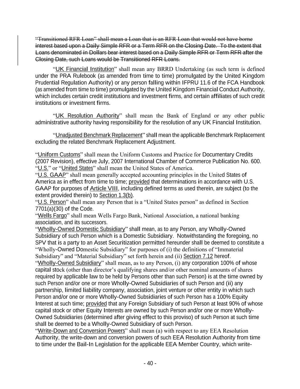 - 40 - “Transitioned RFR Loan” shall mean a Loan that is an RFR Loan that would not have borne interest based upon a Daily Simple RFR or a Term RFR on the Closing Date. To the extent that Loans denominated in Dollars bear interest based on a Daily Simple RFR or Term RFR after the Closing Date, such Loans would be Transitioned RFR Loans. “UK Financial Institution” shall mean any BRRD Undertaking (as such term is defined under the PRA Rulebook (as amended from time to time) promulgated by the United Kingdom Prudential Regulation Authority) or any person falling within IFPRU 11.6 of the FCA Handbook (as amended from time to time) promulgated by the United Kingdom Financial Conduct Authority, which includes certain credit institutions and investment firms, and certain affiliates of such credit institutions or investment firms. “UK Resolution Authority” shall mean the Bank of England or any other public administrative authority having responsibility for the resolution of any UK Financial Institution. “Unadjusted Benchmark Replacement” shall mean the applicable Benchmark Replacement excluding the related Benchmark Replacement Adjustment. “Uniform Customs” shall mean the Uniform Customs and Practice for Documentary Credits (2007 Revision), effective July, 2007 International Chamber of Commerce Publication No. 600. “U.S.” or “United States” shall mean the United States of America. “U.S. GAAP” shall mean generally accepted accounting principles in the United States of America as in effect from time to time; provided that determinations in accordance with U.S. GAAP for purposes of Article VIII, including defined terms as used therein, are subject (to the extent provided therein) to Section 1.3(b). “U.S. Person” shall mean any Person that is a “United States person” as defined in Section 7701(a)(30) of the Code. “Wells Fargo” shall mean Wells Fargo Bank, National Association, a national banking association, and its successors. “Wholly-Owned Domestic Subsidiary” shall mean, as to any Person, any Wholly-Owned Subsidiary of such Person which is a Domestic Subsidiary. Notwithstanding the foregoing, no SPV that is a party to an Asset Securitization permitted hereunder shall be deemed to constitute a “Wholly-Owned Domestic Subsidiary” for purposes of (i) the definitions of “Immaterial Subsidiary” and “Material Subsidiary” set forth herein and (ii) Section 7.12 hereof. “Wholly-Owned Subsidiary” shall mean, as to any Person, (i) any corporation 100% of whose capital stock (other than director’s qualifying shares and/or other nominal amounts of shares required by applicable law to be held by Persons other than such Person) is at the time owned by such Person and/or one or more Wholly-Owned Subsidiaries of such Person and (ii) any partnership, limited liability company, association, joint venture or other entity in which such Person and/or one or more Wholly-Owned Subsidiaries of such Person has a 100% Equity Interest at such time; provided that any Foreign Subsidiary of such Person at least 90% of whose capital stock or other Equity Interests are owned by such Person and/or one or more Wholly- Owned Subsidiaries (determined after giving effect to this proviso) of such Person at such time shall be deemed to be a Wholly-Owned Subsidiary of such Person. “Write-Down and Conversion Powers” shall mean (a) with respect to any EEA Resolution Authority, the write-down and conversion powers of such EEA Resolution Authority from time to time under the Bail-In Legislation for the applicable EEA Member Country, which write-